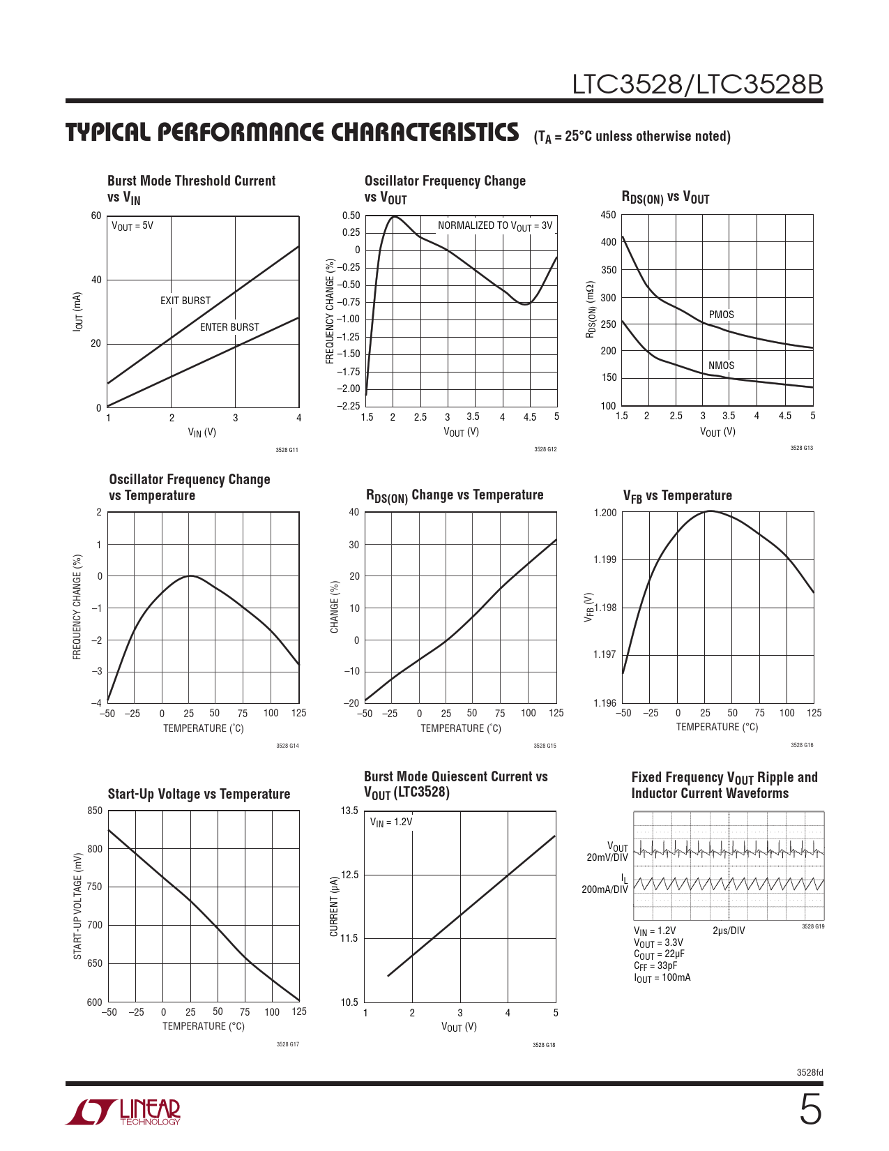 Burst Mode Quiescent Current vs Fixed Frequency VOUT Ripple and Start-Up Voltage vs Temperature VOUT (LTC3528) Inductor Current Waveforms