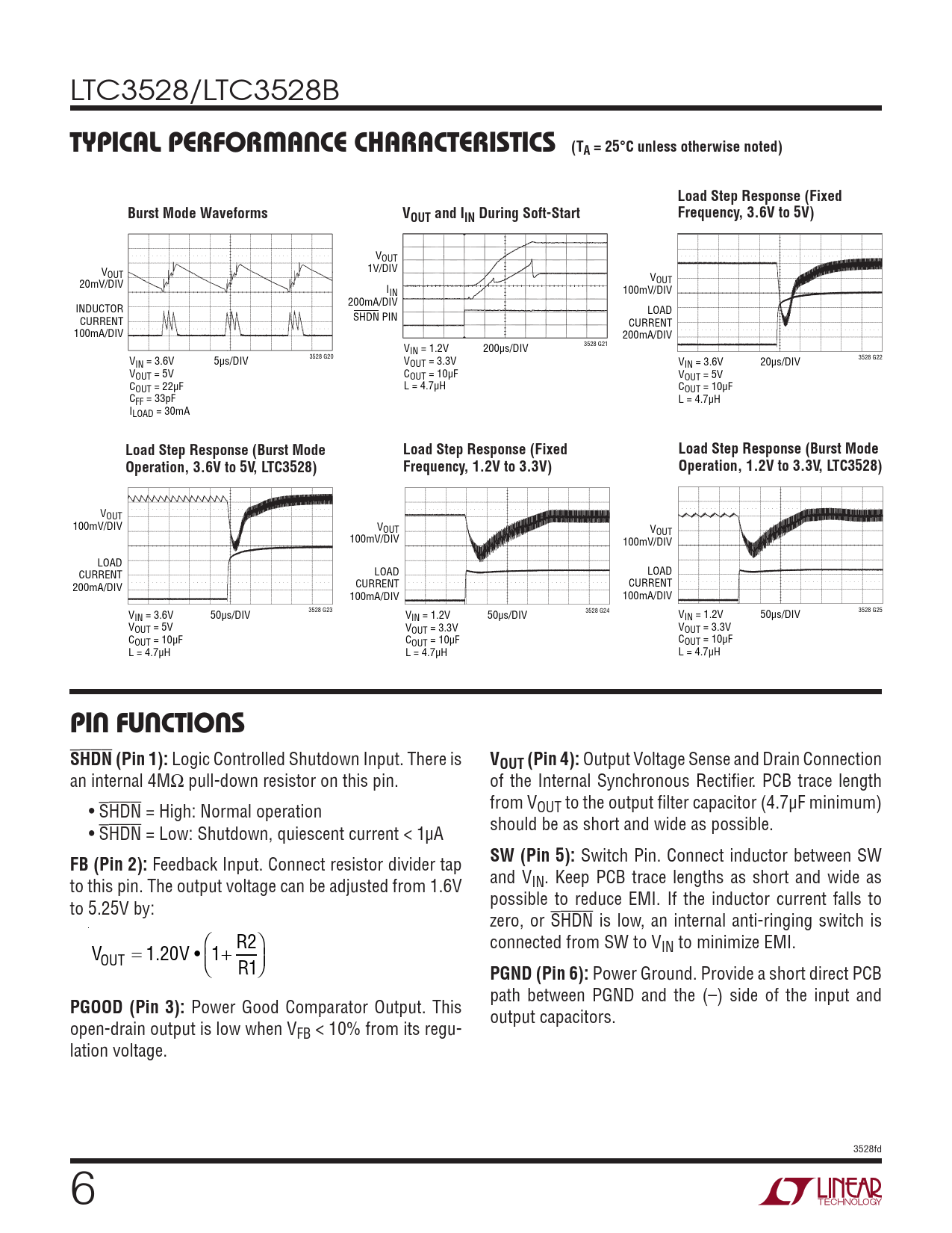 VOUT V 1V/DIV OUT V 20mV/DIV OUT IIN 100mV/DIV INDUCTOR 200mA/DIV LOAD CURRENT SHDN PIN CURRENT 100mA/DIV 200mA/DIV 200µs/DIV 3528 G21 VIN = 1.2V 5µs/DIV 3528 G20 VIN = 3.6V VOUT = 3.3V 20µs/DIV 3528 G22 VIN = 3.6V VOUT = 5V COUT = 10µF VOUT = 5V COUT = 22µF L = 4.7µH COUT = 10µF CFF = 33pF L = 4.7µH ILOAD = 30mA