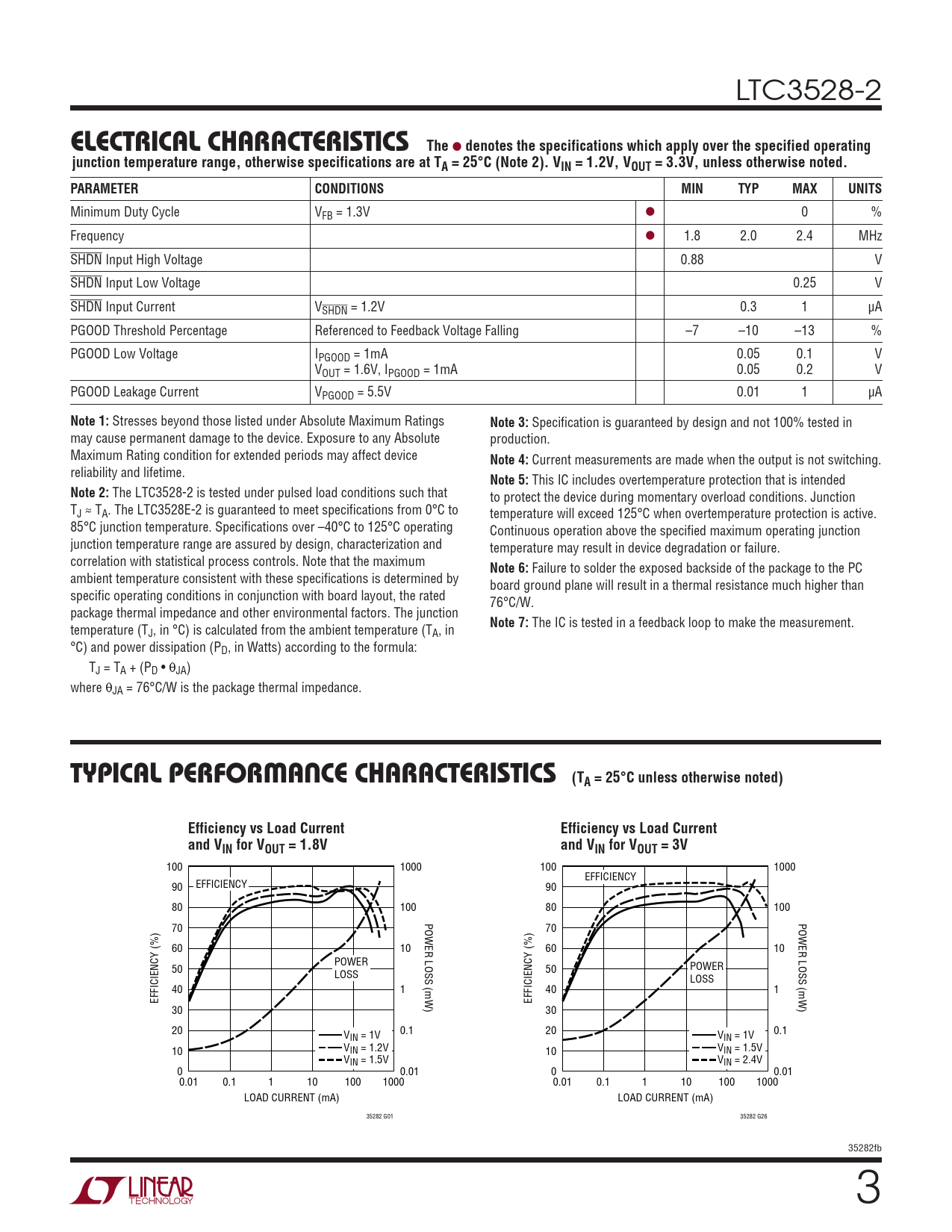 LTC3528-2 ELECTRICALCHARACTERISTICS The l denotes the specifications which apply over the specified operatingjunction temperature range, otherwise specifications are at TA = 25°C (Note 2). VIN = 1.2V, VOUT = 3.3V, unless otherwise noted.PARAMETERCONDITIONSMINTYPMAXUNITS Minimum Duty Cycle VFB = 1.3V l 0 % Frequency l 1.8 2.0 2.4 MHz SHDN Input High Voltage 0.88 V SHDN Input Low Voltage 0.25 V SHDN Input Current VSHDN = 1.2V 0.3 1 µA PGOOD Threshold Percentage Referenced to Feedback Voltage Falling –7 –10 –13 % PGOOD Low Voltage IPGOOD = 1mA 0.05 0.1 V VOUT = 1.6V, IPGOOD = 1mA 0.05 0.2 V PGOOD Leakage Current VPGOOD = 5.5V 0.01 1 µA Note 1: Stresses beyond those listed under Absolute Maximum Ratings Note 3: Specification is guaranteed by design and not 100% tested in may cause permanent damage to the device. Exposure to any Absolute production. Maximum Rating condition for extended periods may affect device Note 4: Current measurements are made when the output is not switching. reliability and lifetime. Note 5: This IC includes overtemperature protection that is intended Note 2: The LTC3528-2 is tested under pulsed load conditions such that to protect the device during momentary overload conditions. Junction TJ ≈ TA. The LTC3528E-2 is guaranteed to meet specifications from 0°C to temperature will exceed 125°C when overtemperature protection is active. 85°C junction temperature. Specifications over –40°C to 125°C operating Continuous operation above the specified maximum operating junction junction temperature range are assured by design, characterization and temperature may result in device degradation or failure. correlation with statistical process controls. Note that the maximum Note 6: Failure to solder the exposed backside of the package to the PC ambient temperature consistent with these specifications is determined by board ground plane will result in a thermal resistance much higher than specific operating conditions in conjunction with board layout, the rated 76°C/W. package thermal impedance and other environmental factors. The junction temperature (T Note 7: The IC is tested in a feedback loop to make the measurement. J, in °C) is calculated from the ambient temperature (TA, in °C) and power dissipation (PD, in Watts) according to the formula: TJ = TA + (PD • θJA) where θJA = 76°C/W is the package thermal impedance. TYPICAL PERFORMANCE CHARACTERISTICS (TA = 25°C unless otherwise noted)Efficiency vs Load CurrentEfficiency vs Load Currentand VIN for VOUT = 1.8Vand VIN for VOUT = 3V 100 1000 100 1000 EFFICIENCY 90 EFFICIENCY 90 80 100 80 100 POWER LOSS (mW) POWER LOSS (mW) 70 70 60 10 60 10 POWER 50 POWER LOSS 50 LOSS 40 1 40 1 EFFICIENCY (%) EFFICIENCY (%) 30 30 20 0.1 V 20 0.1 IN = 1V VIN = 1V 10 VIN = 1.2V 10 VIN = 1.5V VIN = 1.5V VIN = 2.4V 0 0.01 0 0.01 0.01 0.1 1 10 100 1000 0.01 0.1 1 10 100 1000 LOAD CURRENT (mA) LOAD CURRENT (mA) 35282 G01 35282 G26 35282fb 3 Document Outline Features Applications Description Typical Application Absolute Maximum Ratings Pin Configuration Order Information Electrical Characteristics Typical Performance Characteristics Pin Functions Block Diagram Operation Applications Information Typical Applications Package Description Revision History Related Parts