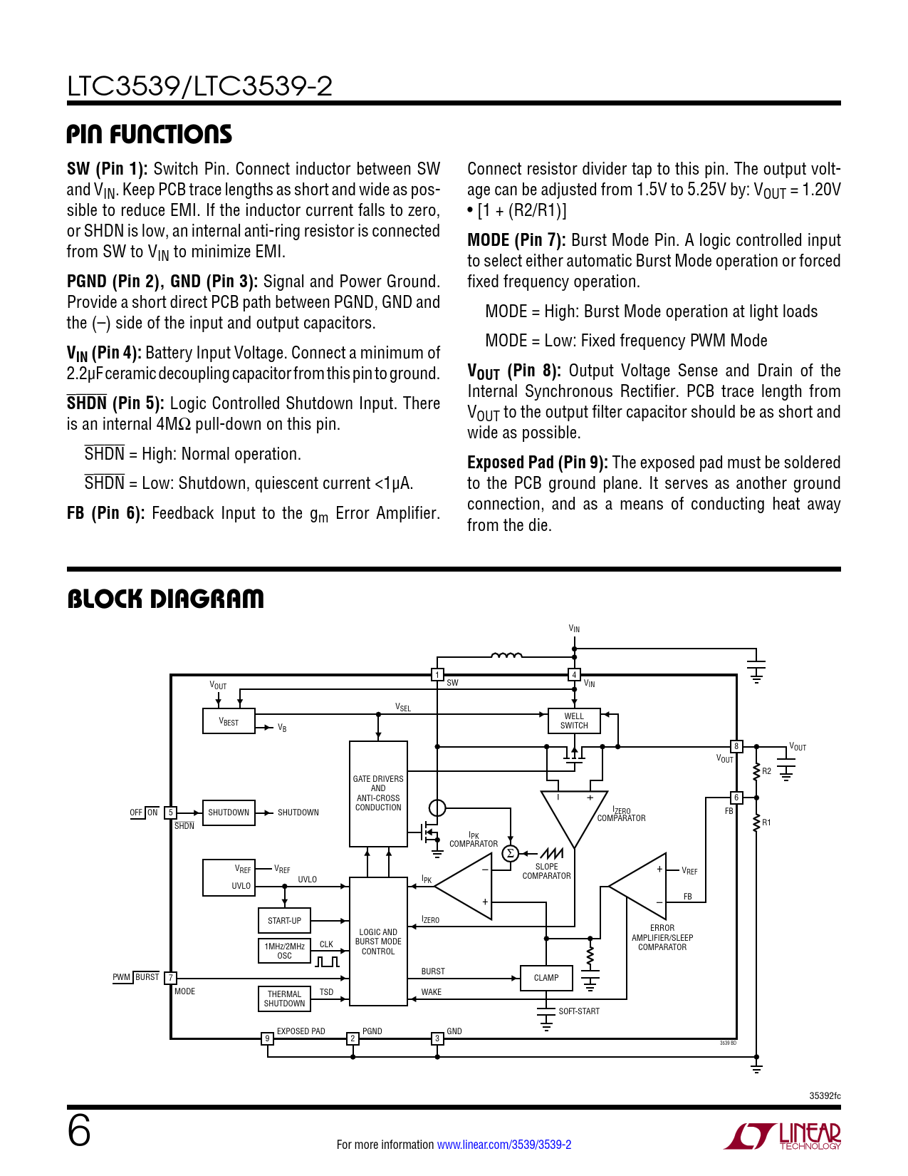 LTC3539/LTC3539-2 PIN FUNCTIONSSW (Pin 1): Switch Pin. Connect inductor between SW Connect resistor divider tap to this pin. The output volt- and VIN. Keep PCB trace lengths as short and wide as pos- age can be adjusted from 1.5V to 5.25V by: VOUT = 1.20V sible to reduce EMI. If the inductor current falls to zero, • [1 + (R2/R1)] or SHDN is low, an internal anti-ring resistor is connected MODE (Pin 7): Burst Mode Pin. A logic controlled input from SW to VIN to minimize EMI. to select either automatic Burst Mode operation or forced PGND (Pin 2), GND (Pin 3): Signal and Power Ground. fixed frequency operation. Provide a short direct PCB path between PGND, GND and MODE = High: Burst Mode operation at light loads the (–) side of the input and output capacitors. MODE = Low: Fixed frequency PWM Mode VIN (Pin 4): Battery Input Voltage. Connect a minimum of 2.2µF ceramic decoupling capacitor from this pin to ground. VOUT (Pin 8): Output Voltage Sense and Drain of the Internal Synchronous Rectifier. PCB trace length from SHDN (Pin 5): Logic Controlled Shutdown Input. There V is an internal 4MΩ pull-down on this pin. OUT to the output filter capacitor should be as short and wide as possible. SHDN = High: Normal operation. Exposed Pad (Pin 9): The exposed pad must be soldered SHDN = Low: Shutdown, quiescent current <1µA. to the PCB ground plane. It serves as another ground FB (Pin 6): Feedback Input to the g connection, and as a means of conducting heat away m Error Amplifier. from the die. BLOCK DIAGRAM VIN 1 4 V SW VIN OUT VSEL V WELL BEST VB SWITCH 8 VOUT VOUT R2 GATE DRIVERS AND – + ANTI-CROSS 6 CONDUCTION I OFF ON 5 SHUTDOWN SHUTDOWN ZERO FB COMPARATOR SHDN R1 IPK COMPARATOR Σ – V SLOPE + REF VREF V COMPARATOR REF UVLO IPK UVLO + – FB START-UP IZERO ERROR LOGIC AND AMPLIFIER/SLEEP BURST MODE 1MHz/2MHz CLK COMPARATOR CONTROL OSC BURST PWM BURST 7 CLAMP MODE THERMAL TSD WAKE SHUTDOWN SOFT-START EXPOSED PAD PGND GND 9 2 3 3539 BD 35392fc 6 For more information www.linear.com/3539/3539-2 Document Outline Features Applications Description Typical Application Absolute Maximum Ratings Pin Configuration Order Information Electrical Characteristics Typical Performance Characteristics Pin Functions Block Diagram Operation Applications Information Typical Applications Package Description Revision History Related Parts