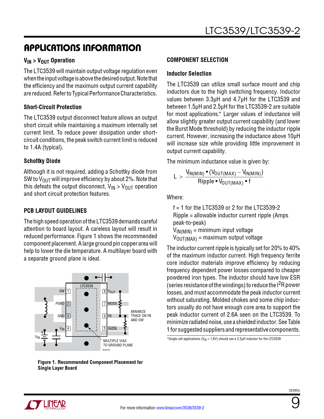 between 1.5µH and 2.5µH for the LTC3539-2 are suitable The LTC3539 output disconnect feature allows an output for most applications.* Larger values of inductance will short circuit while maintaining a maximum internally set allow slightly greater output current capability (and lower current limit. To reduce power dissipation under short- the Burst Mode threshold) by reducing the inductor ripple circuit conditions, the peak switch current limit is reduced current. However, increasing the inductance above 10µH to 1.4A (typical). will increase size while providing little improvement in output current capability.