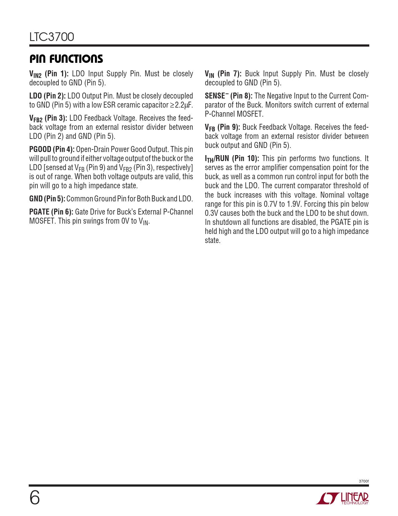 Gate Drive for Buck’s External P-Channel 0.3V causes both the buck and the LDO to be shut down. MOSFET. This pin swings from 0V to VIN. In shutdown all functions are disabled, the PGATE pin is held high and the LDO output will go to a high impedance state. 3700f 6