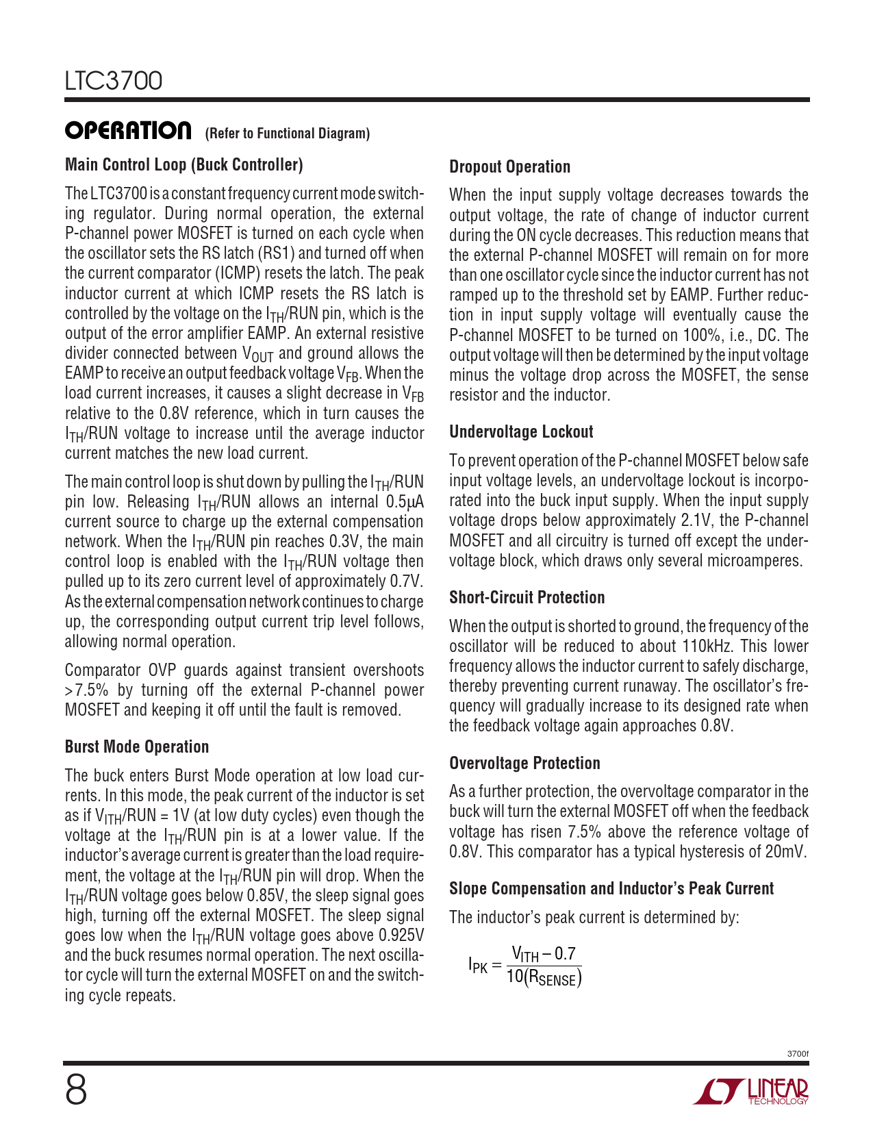 LTC3700 UOPERATIO(Refer to Functional Diagram)Main Control Loop (Buck Controller)Dropout Operation The LTC3700 is a constant frequency current mode switch- When the input supply voltage decreases towards the ing regulator. During normal operation, the external output voltage, the rate of change of inductor current P-channel power MOSFET is turned on each cycle when during the ON cycle decreases. This reduction means that the oscillator sets the RS latch (RS1) and turned off when the external P-channel MOSFET will remain on for more the current comparator (ICMP) resets the latch. The peak than one oscillator cycle since the inductor current has not inductor current at which ICMP resets the RS latch is ramped up to the threshold set by EAMP. Further reduc- controlled by the voltage on the ITH/RUN pin, which is the tion in input supply voltage will eventually cause the output of the error amplifier EAMP. An external resistive P-channel MOSFET to be turned on 100%, i.e., DC. The divider connected between VOUT and ground allows the output voltage will then be determined by the input voltage EAMP to receive an output feedback voltage VFB. When the minus the voltage drop across the MOSFET, the sense load current increases, it causes a slight decrease in VFB resistor and the inductor. relative to the 0.8V reference, which in turn causes the ITH/RUN voltage to increase until the average inductor Undervoltage Lockout current matches the new load current. To prevent operation of the P-channel MOSFET below safe The main control loop is shut down by pulling the ITH/RUN input voltage levels, an undervoltage lockout is incorpo- pin low. Releasing ITH/RUN allows an internal 0.5µA rated into the buck input supply. When the input supply current source to charge up the external compensation voltage drops below approximately 2.1V, the P-channel network. When the ITH/RUN pin reaches 0.3V, the main MOSFET and all circuitry is turned off except the under- control loop is enabled with the ITH/RUN voltage then voltage block, which draws only several microamperes. pulled up to its zero current level of approximately 0.7V. As the external compensation network continues to charge Short-Circuit Protection up, the corresponding output current trip level follows, When the output is shorted to ground, the frequency of the allowing normal operation. oscillator will be reduced to about 110kHz. This lower Comparator OVP guards against transient overshoots frequency allows the inductor current to safely discharge, > 7.5% by turning off the external P-channel power thereby preventing current runaway. The oscillator’s fre- MOSFET and keeping it off until the fault is removed. quency will gradually increase to its designed rate when the feedback voltage again approaches 0.8V. Burst Mode OperationOvervoltage Protection The buck enters Burst Mode operation at low load cur- rents. In this mode, the peak current of the inductor is set As a further protection, the overvoltage comparator in the as if V buck will turn the external MOSFET off when the feedback ITH/RUN = 1V (at low duty cycles) even though the voltage at the I voltage has risen 7.5% above the reference voltage of TH/RUN pin is at a lower value. If the inductor’s average current is greater than the load require- 0.8V. This comparator has a typical hysteresis of 20mV. ment, the voltage at the ITH/RUN pin will drop. When the I Slope Compensation and Inductor’s Peak Current TH/RUN voltage goes below 0.85V, the sleep signal goes high, turning off the external MOSFET. The sleep signal The inductor’s peak current is determined by: goes low when the ITH/RUN voltage goes above 0.925V and the buck resumes normal operation. The next oscilla- V – . 0 7 I ITH = tor cycle will turn the external MOSFET on and the switch- PK 10 R ( SENSE) ing cycle repeats. 3700f 8