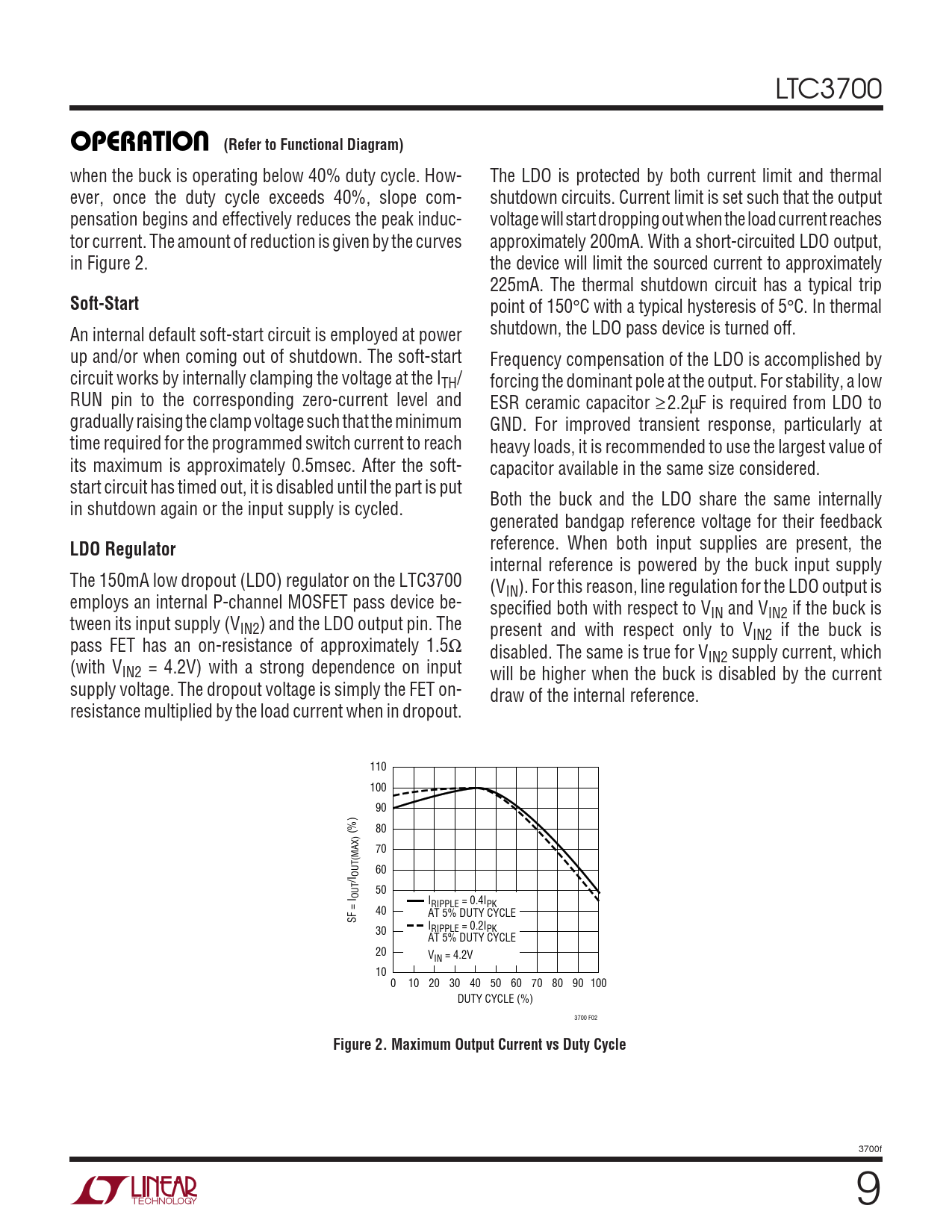 LTC3700 UOPERATIO(Refer to Functional Diagram) when the buck is operating below 40% duty cycle. How- The LDO is protected by both current limit and thermal ever, once the duty cycle exceeds 40%, slope com- shutdown circuits. Current limit is set such that the output pensation begins and effectively reduces the peak induc- voltage will start dropping out when the load current reaches tor current. The amount of reduction is given by the curves approximately 200mA. With a short-circuited LDO output, in Figure 2. the device will limit the sourced current to approximately 225mA. The thermal shutdown circuit has a typical trip Soft-Start point of 150°C with a typical hysteresis of 5°C. In thermal shutdown, the LDO pass device is turned off. An internal default soft-start circuit is employed at power up and/or when coming out of shutdown. The soft-start Frequency compensation of the LDO is accomplished by circuit works by internally clamping the voltage at the ITH/ forcing the dominant pole at the output. For stability, a low RUN pin to the corresponding zero-current level and ESR ceramic capacitor ≥ 2.2µF is required from LDO to gradually raising the clamp voltage such that the minimum GND. For improved transient response, particularly at time required for the programmed switch current to reach heavy loads, it is recommended to use the largest value of its maximum is approximately 0.5msec. After the soft- capacitor available in the same size considered. start circuit has timed out, it is disabled until the part is put Both the buck and the LDO share the same internally in shutdown again or the input supply is cycled. generated bandgap reference voltage for their feedback reference. When both input supplies are present, the LDO Regulator internal reference is powered by the buck input supply The 150mA low dropout (LDO) regulator on the LTC3700 (VIN). For this reason, line regulation for the LDO output is employs an internal P-channel MOSFET pass device be- specified both with respect to VIN and VIN2 if the buck is tween its input supply (VIN2) and the LDO output pin. The present and with respect only to VIN2 if the buck is pass FET has an on-resistance of approximately 1.5Ω disabled. The same is true for VIN2 supply current, which (with VIN2 = 4.2V) with a strong dependence on input will be higher when the buck is disabled by the current supply voltage. The dropout voltage is simply the FET on- draw of the internal reference. resistance multiplied by the load current when in dropout. 110 100 90 (%) 80 70 OUT(MAX) 60 /I 50 OUT IRIPPLE = 0.4IPK 40 AT 5% DUTY CYCLE SF = I I 30 RIPPLE = 0.2IPK AT 5% DUTY CYCLE 20 VIN = 4.2V 10 0 10 20 30 40 50 60 70 80 90 100 DUTY CYCLE (%) 3700 F02 Figure 2. Maximum Output Current vs Duty Cycle 3700f 9