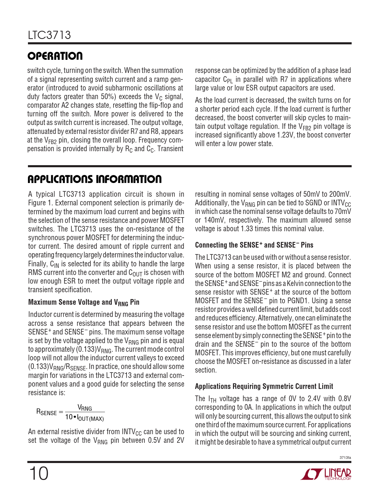 resistor provides a well defined current limit, but adds cost Inductor current is determined by measuring the voltage and reduces efficiency. Alternatively, one can eliminate the across a sense resistance that appears between the sense resistor and use the bottom MOSFET as the current SENSE+ and SENSE– pins. The maximum sense voltage sense element by simply connecting the SENSE+ pin to the is set by the voltage applied to the VRNG pin and is equal drain and the SENSE– pin to the source of the bottom to approximately (0.133)VRNG. The current mode control MOSFET. This improves efficiency, but one must carefully loop will not allow the inductor current valleys to exceed choose the MOSFET on-resistance as discussed in a later (0.133)VRNG/RSENSE. In practice, one should allow some section. margin for variations in the LTC3713 and external com- ponent values and a good guide for selecting the sense