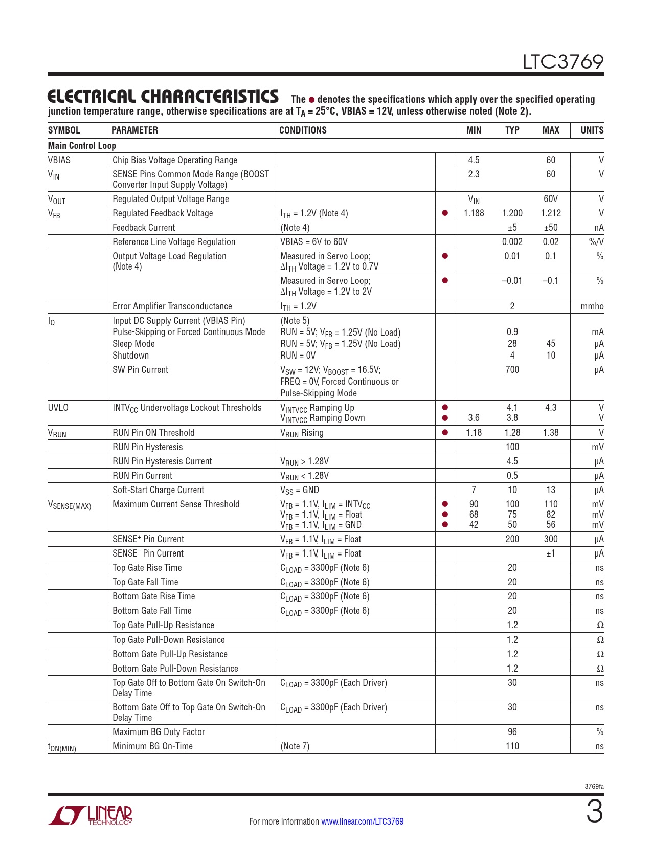 LTC3769 ELECTRICAL CHARACTERISTICSThe l denotes the specifications which apply over the specified operatingjunction temperature range, otherwise specifications are at TA = 25°C, VBIAS = 12V, unless otherwise noted (Note 2). SYMBOLPARAMETERCONDITIONSMINTYPMAXUNITSMain Control Loop VBIAS Chip Bias Voltage Operating Range 4.5 60 V VIN SENSE Pins Common Mode Range (BOOST 2.3 60 V Converter Input Supply Voltage) VOUT Regulated Output Voltage Range VIN 60V V VFB Regulated Feedback Voltage ITH = 1.2V (Note 4) l 1.188 1.200 1.212 V Feedback Current (Note 4) ±5 ±50 nA Reference Line Voltage Regulation VBIAS = 6V to 60V 0.002 0.02 %/V Output Voltage Load Regulation Measured in Servo Loop; l 0.01 0.1 % (Note 4) ΔITH Voltage = 1.2V to 0.7V Measured in Servo Loop; l –0.01 –0.1 % ΔITH Voltage = 1.2V to 2V Error Amplifier Transconductance ITH = 1.2V 2 mmho IQ Input DC Supply Current (VBIAS Pin) (Note 5) Pulse-Skipping or Forced Continuous Mode RUN = 5V; VFB = 1.25V (No Load) 0.9 mA Sleep Mode RUN = 5V; VFB = 1.25V (No Load) 28 45 µA Shutdown RUN = 0V 4 10 µA SW Pin Current VSW = 12V; VBOOST = 16.5V; 700 µA FREQ = 0V, Forced Continuous or Pulse-Skipping Mode UVLO INTVCC Undervoltage Lockout Thresholds VINTVCC Ramping Up l 4.1 4.3 V VINTVCC Ramping Down l 3.6 3.8 V VRUN RUN Pin ON Threshold VRUN Rising l 1.18 1.28 1.38 V RUN Pin Hysteresis 100 mV RUN Pin Hysteresis Current VRUN > 1.28V 4.5 µA RUN Pin Current VRUN < 1.28V 0.5 µA Soft-Start Charge Current VSS = GND 7 10 13 µA VSENSE(MAX) Maximum Current Sense Threshold VFB = 1.1V, ILIM = INTVCC l 90 100 110 mV VFB = 1.1V, ILIM = Float l 68 75 82 mV VFB = 1.1V, ILIM = GND l 42 50 56 mV SENSE+ Pin Current VFB = 1.1V, ILIM = Float 200 300 µA SENSE– Pin Current VFB = 1.1V, ILIM = Float ±1 µA Top Gate Rise Time CLOAD = 3300pF (Note 6) 20 ns Top Gate Fall Time CLOAD = 3300pF (Note 6) 20 ns Bottom Gate Rise Time CLOAD = 3300pF (Note 6) 20 ns Bottom Gate Fall Time CLOAD = 3300pF (Note 6) 20 ns Top Gate Pull-Up Resistance 1.2 Ω Top Gate Pull-Down Resistance 1.2 Ω Bottom Gate Pull-Up Resistance 1.2 Ω Bottom Gate Pull-Down Resistance 1.2 Ω Top Gate Off to Bottom Gate On Switch-On CLOAD = 3300pF (Each Driver) 30 ns Delay Time Bottom Gate Off to Top Gate On Switch-On CLOAD = 3300pF (Each Driver) 30 ns Delay Time Maximum BG Duty Factor 96 % tON(MIN) Minimum BG On-Time (Note 7) 110 ns 3769fa For more information www.linear.com/LTC3769 3 Document Outline Features Applications Description Typical Application Absolute Maximum Ratings Pin Configuration Order Information Electrical Characteristics Typical Performance Characteristics Pin Functions Block Diagram Operation Applications Information Typical Applications Revision History Typical Application Related Parts