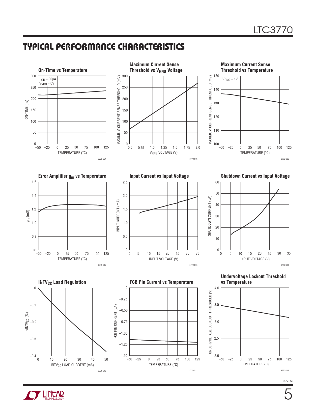 0 0 4.0 –0.25 –0.1 3.5 –0.50 (%) CC –0.2 –0.75 3.0 INTV $ –1.00 FCB PIN CURRENT (μA) –0.3 2.5 –1.25 UNDERVOLTAGE LOCKOUT THRESHOLD (V) –0.4 –1.50 2.0 0 10 20 30 40 50 –50 –25 0 25 50 75 100 125 –50 –25 0 25 50 75 100 125 INTV TEMPERATURE (C) CC LOAD CURRENT (mA) TEMPERATURE (°C) 3770 G10 3770 G11 3770 G12 3770fc 5