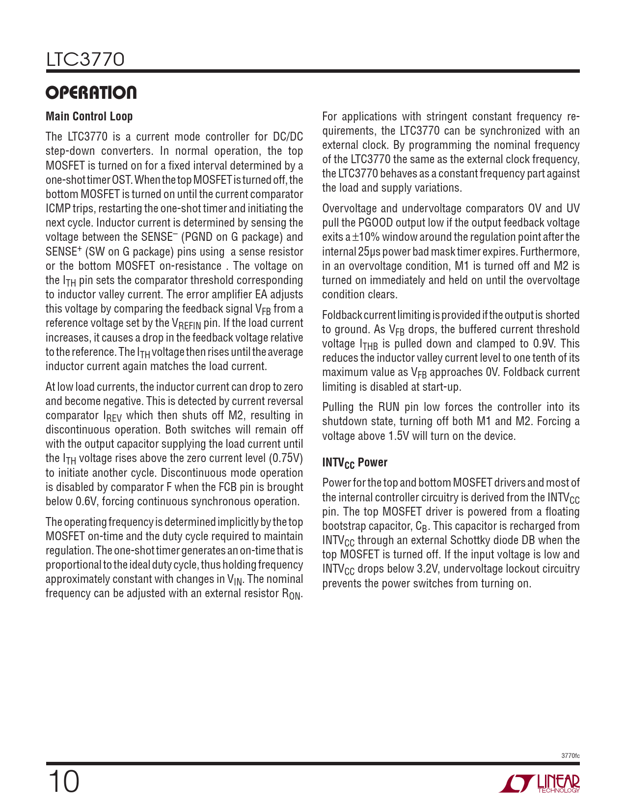 LTC3770 OPERATIONMain Control Loop For applications with stringent constant frequency re- quirements, the LTC3770 can be synchronized with an The LTC3770 is a current mode controller for DC/DC external clock. By programming the nominal frequency step-down converters. In normal operation, the top of the LTC3770 the same as the external clock frequency, MOSFET is turned on for a fi xed interval determined by a the LTC3770 behaves as a constant frequency part against one-shot timer OST. When the top MOSFET is turned off, the the load and supply variations. bottom MOSFET is turned on until the current comparator ICMP trips, restarting the one-shot timer and initiating the Overvoltage and undervoltage comparators OV and UV next cycle. Inductor current is determined by sensing the pull the PGOOD output low if the output feedback voltage voltage between the SENSE– (PGND on G package) and exits a ±10% window around the regulation point after the SENSE+ (SW on G package) pins using a sense resistor internal 25μs power bad mask timer expires. Furthermore, or the bottom MOSFET on-resistance . The voltage on in an overvoltage condition, M1 is turned off and M2 is the ITH pin sets the comparator threshold corresponding turned on immediately and held on until the overvoltage to inductor valley current. The error amplifi er EA adjusts condition clears. this voltage by comparing the feedback signal VFB from a Foldback current limiting is provided if the output is shorted reference voltage set by the VREFIN pin. If the load current to ground. As V increases, it causes a drop in the feedback voltage relative FB drops, the buffered current threshold voltage I to the reference. The I THB is pulled down and clamped to 0.9V. This TH voltage then rises until the average reduces the inductor valley current level to one tenth of its inductor current again matches the load current. maximum value as VFB approaches 0V. Foldback current At low load currents, the inductor current can drop to zero limiting is disabled at start-up. and become negative. This is detected by current reversal Pulling the RUN pin low forces the controller into its comparator IREV which then shuts off M2, resulting in shutdown state, turning off both M1 and M2. Forcing a discontinuous operation. Both switches will remain off voltage above 1.5V will turn on the device. with the output capacitor supplying the load current until the ITH voltage rises above the zero current level (0.75V) INTVCC Power to initiate another cycle. Discontinuous mode operation is disabled by comparator F when the FCB pin is brought Power for the top and bottom MOSFET drivers and most of below 0.6V, forcing continuous synchronous operation. the internal controller circuitry is derived from the INTVCC pin. The top MOSFET driver is powered from a fl oating The operating frequency is determined implicitly by the top bootstrap capacitor, CB. This capacitor is recharged from MOSFET on-time and the duty cycle required to maintain INTVCC through an external Schottky diode DB when the regulation. The one-shot timer generates an on-time that is top MOSFET is turned off. If the input voltage is low and proportional to the ideal duty cycle, thus holding frequency INTVCC drops below 3.2V, undervoltage lockout circuitry approximately constant with changes in VIN. The nominal prevents the power switches from turning on. frequency can be adjusted with an external resistor RON. 3770fc 10