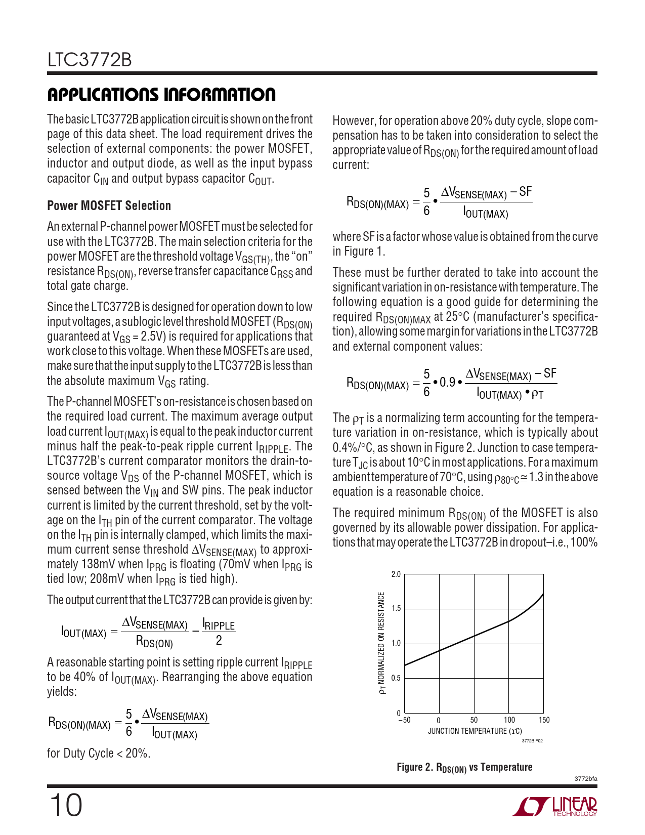 RDS ON ( ) MAX ( ) = • 6 IOUT MAX ( ) An external P-channel power MOSFET must be selected for use with the LTC3772B. The main selection criteria for the where SF is a factor whose value is obtained from the curve power MOSFET are the threshold voltage V in Figure 1. GS(TH), the “on” resistance RDS(ON), reverse transfer capacitance CRSS and These must be further derated to take into account the total gate charge. significant variation in on-resistance with temperature. The Since the LTC3772B is designed for operation down to low following equation is a good guide for determining the input voltages, a sublogic level threshold MOSFET (R required RDS(ON)MAX at 25°C (manufacturer’s specifica- DS(ON) guaranteed at V tion), allowing some margin for variations in the LTC3772B GS = 2.5V) is required for applications that work close to this voltage. When these MOSFETs are used, and external component values: make sure that the input supply to the LTC3772B is less than 5 ∆V – SF the absolute maximum V SENSE MAX ( ) GS rating. RDS ON ( ) MAX ( ) = • . 0 9 • 6 IOUT MAX ( ) • ρT The P-channel MOSFET’s on-resistance is chosen based on the required load current. The maximum average output The ρT is a normalizing term accounting for the tempera- load current IOUT(MAX) is equal to the peak inductor current ture variation in on-resistance, which is typically about minus half the peak-to-peak ripple current IRIPPLE. The 0.4%/°C, as shown in Figure 2. Junction to case tempera- LTC3772B’s current comparator monitors the drain-to- ture TJC is about 10°C in most applications. For a maximum source voltage VDS of the P-channel MOSFET, which is ambient temperature of 70°C, using ρ80°C ≅ 1.3 in the above sensed between the VIN and SW pins. The peak inductor equation is a reasonable choice. current is limited by the current threshold, set by the volt- The required minimum R age on the I DS(ON) of the MOSFET is also TH pin of the current comparator. The voltage governed by its allowable power dissipation. For applica- on the ITH pin is internally clamped, which limits the maxi- tions that may operate the LTC3772B in dropout–i.e., 100% mum current sense threshold ∆VSENSE(MAX) to approxi- mately 138mV when IPRG is floating (70mV when IPRG is tied low; 208mV when I 2.0 PRG is tied high). The output current that the LTC3772B can provide is given by: 1.5 ∆VSENSE MAX ( ) I I RIPPLE OUT MAX ( ) = – RDS ON ( ) 2 1.0 A reasonable starting point is setting ripple current IRIPPLE to be 40% of IOUT(MAX). Rearranging the above equation 0.5 NORMALIZED ON RESISTANCE yields: ρ T 5 ∆V 0 R SENSE MAX ( ) – 50 0 50 100 150 DS ON ( ) MAX ( ) = • 6 IOUT MAX ( ) JUNCTION TEMPERATURE (ϒC) 3772B F02 for Duty Cycle < 20%.