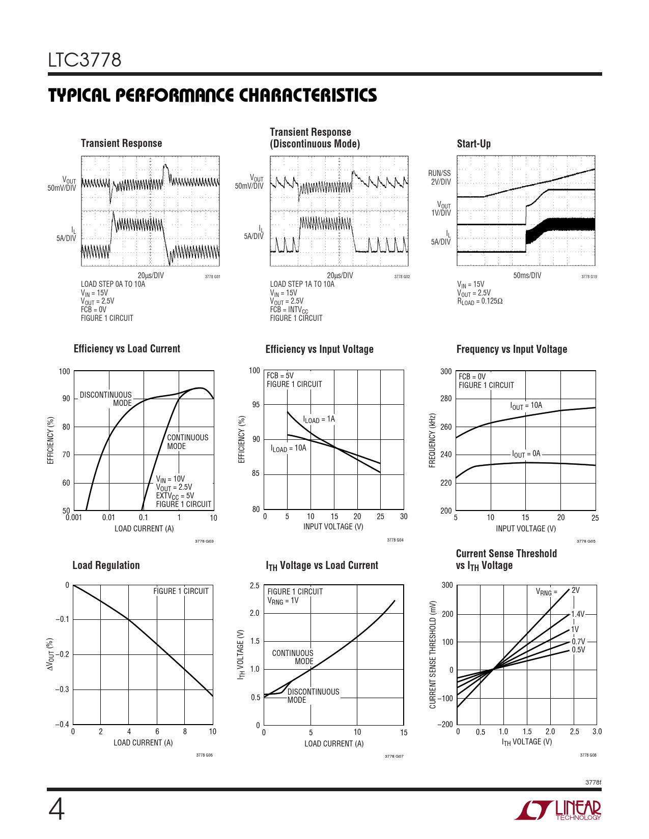 0 2.5 300 FIGURE 1 CIRCUIT FIGURE 1 CIRCUIT V 2V RNG = VRNG = 1V 2.0 200 1.4V –0.1 1V 1.5 100 0.7V (%) 0.5V –0.2 CONTINUOUS OUT MODE ∆V VOLTAGE (V) 1.0 0 I TH –0.3 DISCONTINUOUS 0.5 MODE –100 CURRENT SENSE THRESHOLD (mV) –0.4 0 –200 0 2 4 6 8 10 0 5 10 15 0 0.5 1.0 1.5 2.0 2.5 3.0 LOAD CURRENT (A) LOAD CURRENT (A) ITH VOLTAGE (V) 3778 G06 3778 G07 3778 G08 3778f 4