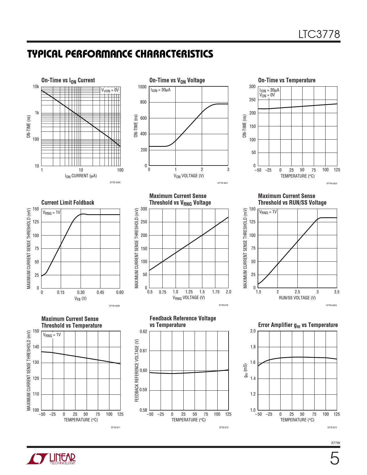 150 0.62 2.0 VRNG = 1V 140 1.8 0.61 130 1.6 0.60 (mS) g m 120 1.4 0.59 110 1.2 FEEDBACK REFERENCE VOLTAGE (V) MAXIMUM CURRENT SENSE THRESHOLD (mV) 100 0.58 1.0 –50 –25 0 25 50 75 100 125 –50 –25 0 25 50 75 100 125 –50 –25 0 25 50 75 100 125 TEMPERATURE (°C) TEMPERATURE (°C) TEMPERATURE (°C) 3778 G11 3778 G12 3778 G13 3778f 5