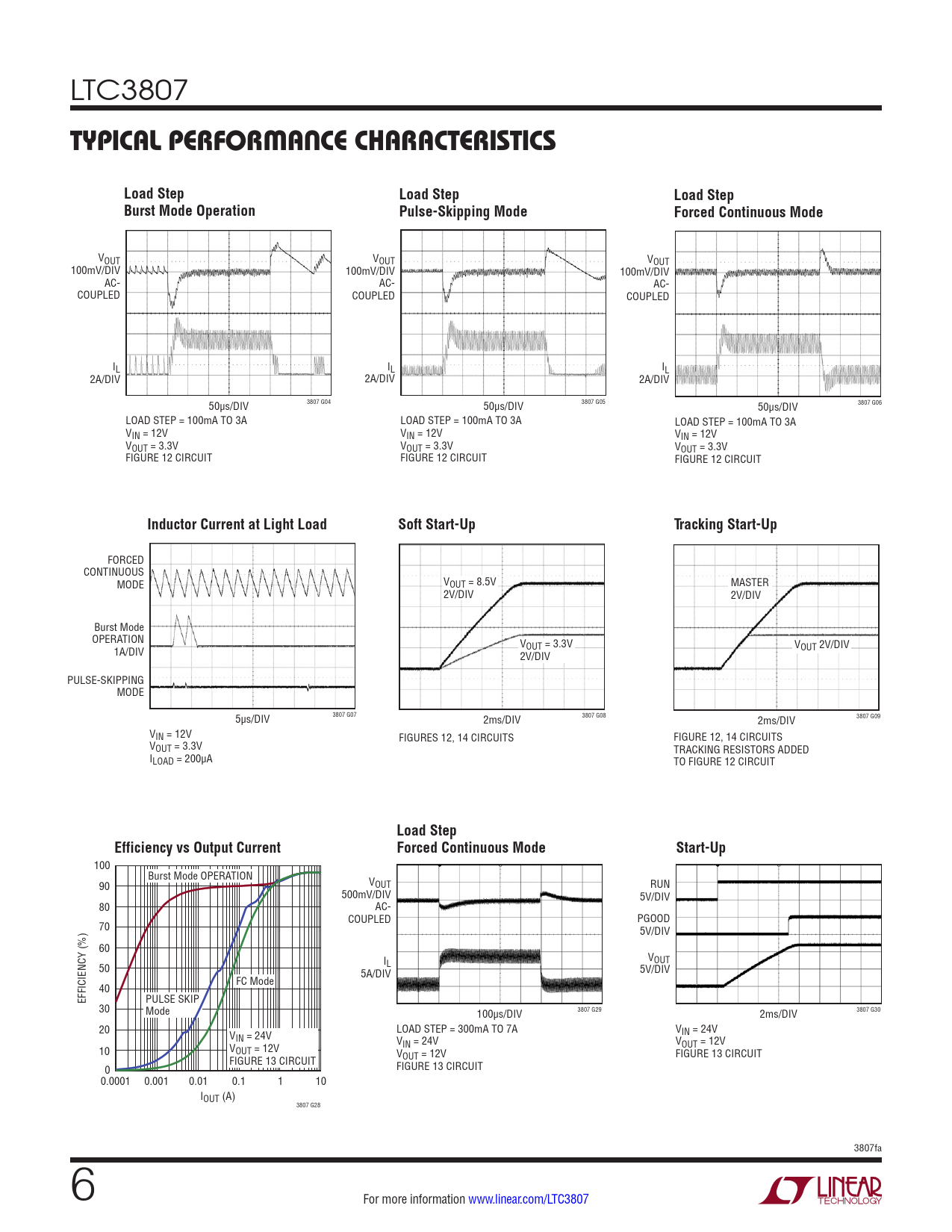 FORCED CONTINUOUS MODE VOUT = 8.5V MASTER 2V/DIV 2V/DIV Burst Mode OPERATION V V 1A/DIV OUT = 3.3V OUT 2V/DIV 2V/DIV PULSE-SKIPPING MODE 5µs/DIV 3807 G07 2ms/DIV 3807 G08 2ms/DIV 3807 G09 VIN = 12V FIGURES 12, 14 CIRCUITS FIGURE 12, 14 CIRCUITS VOUT = 3.3V TRACKING RESISTORS ADDED ILOAD = 200µA TO FIGURE 12 CIRCUIT