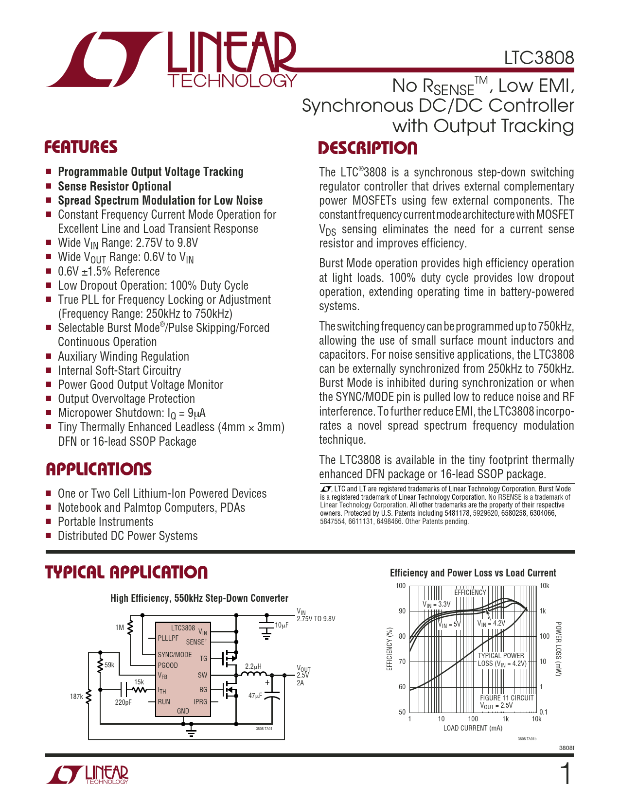 LTC3808 No R TM SENSE , Low EMI, Synchronous DC/DC Controller with Output Tracking