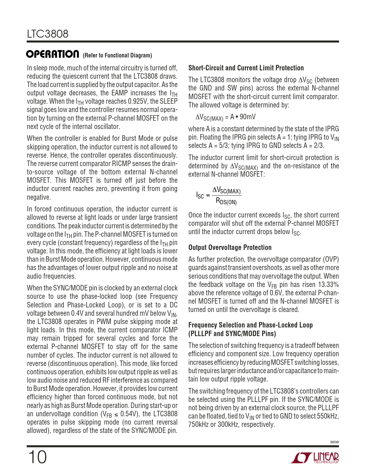 reducing the quiescent current that the LTC3808 draws. The LTC3808 monitors the voltage drop ∆V The load current is supplied by the output capacitor. As the SC (between the GND and SW pins) across the external N-channel output voltage decreases, the EAMP increases the ITH MOSFET with the short-circuit current limit comparator. voltage. When the ITH voltage reaches 0.925V, the SLEEP The allowed voltage is determined by: signal goes low and the controller resumes normal opera- tion by turning on the external P-channel MOSFET on the ∆VSC(MAX) = A • 90mV next cycle of the internal oscillator. where A is a constant determined by the state of the IPRG When the controller is enabled for Burst Mode or pulse pin. Floating the IPRG pin selects A = 1; tying IPRG to VIN skipping operation, the inductor current is not allowed to selects A = 5/3; tying IPRG to GND selects A = 2/3. reverse. Hence, the controller operates discontinuously. The inductor current limit for short-circuit protection is The reverse current comparator RICMP senses the drain- determined by ∆VSC(MAX) and the on-resistance of the to-source voltage of the bottom external N-channel external N-channel MOSFET: MOSFET. This MOSFET is turned off just before the inductor current reaches zero, preventing it from going V ∆ SC MAX ( ) negative. ISC = RDS ON ( ) In forced continuous operation, the inductor current is allowed to reverse at light loads or under large transient Once the inductor current exceeds ISC, the short current conditions. The peak inductor current is determined by the comparator will shut off the external P-channel MOSFET voltage on the I until the inductor current drops below I TH pin. The P-channel MOSFET is turned on SC. every cycle (constant frequency) regardless of the ITH pin
