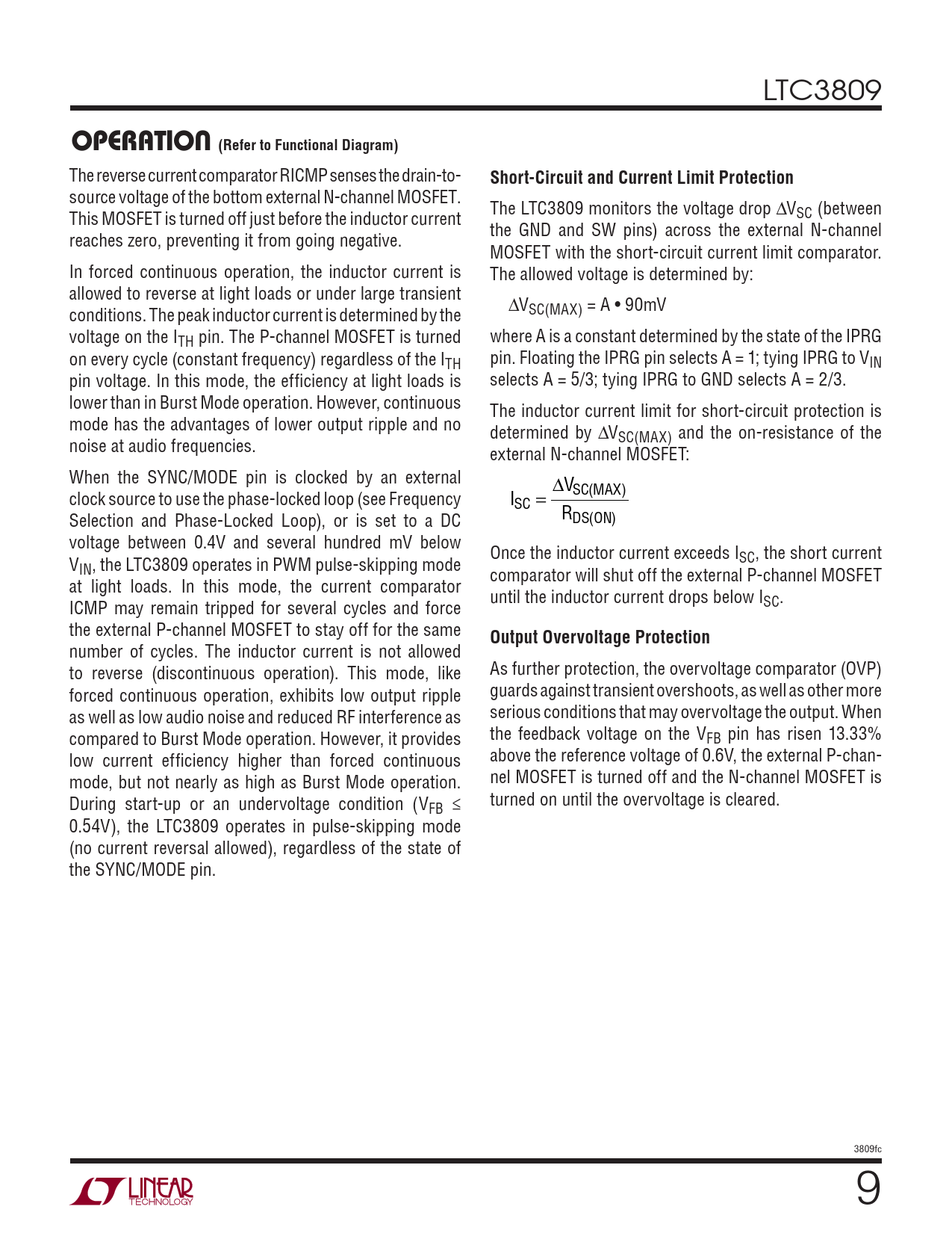 LTC3809 OPERATION (Refer to Functional Diagram) The reverse current comparator RICMP senses the drain-to- Short-Circuit and Current Limit Protection source voltage of the bottom external N-channel MOSFET. The LTC3809 monitors the voltage drop ΔV This MOSFET is turned off just before the inductor current SC (between the GND and SW pins) across the external N-channel reaches zero, preventing it from going negative. MOSFET with the short-circuit current limit comparator. In forced continuous operation, the inductor current is The allowed voltage is determined by: allowed to reverse at light loads or under large transient ΔV conditions. The peak inductor current is determined by the SC(MAX) = A • 90mV voltage on the ITH pin. The P-channel MOSFET is turned where A is a constant determined by the state of the IPRG on every cycle (constant frequency) regardless of the ITH pin. Floating the IPRG pin selects A = 1; tying IPRG to VIN pin voltage. In this mode, the effi ciency at light loads is selects A = 5/3; tying IPRG to GND selects A = 2/3. lower than in Burst Mode operation. However, continuous The inductor current limit for short-circuit protection is mode has the advantages of lower output ripple and no determined by ΔV noise at audio frequencies. SC(MAX) and the on-resistance of the external N-channel MOSFET: When the SYNC/MODE pin is clocked by an external V Δ SC MAX ( ) clock source to use the phase-locked loop (see Frequency ISC = Selection and Phase-Locked Loop), or is set to a DC R DS ON ( ) voltage between 0.4V and several hundred mV below Once the inductor current exceeds I V SC, the short current IN, the LTC3809 operates in PWM pulse-skipping mode comparator will shut off the external P-channel MOSFET at light loads. In this mode, the current comparator until the inductor current drops below I ICMP may remain tripped for several cycles and force SC. the external P-channel MOSFET to stay off for the same Output Overvoltage Protection number of cycles. The inductor current is not allowed to reverse (discontinuous operation). This mode, like As further protection, the overvoltage comparator (OVP) forced continuous operation, exhibits low output ripple guards against transient overshoots, as well as other more as well as low audio noise and reduced RF interference as serious conditions that may overvoltage the output. When compared to Burst Mode operation. However, it provides the feedback voltage on the VFB pin has risen 13.33% low current effi ciency higher than forced continuous above the reference voltage of 0.6V, the external P-chan- mode, but not nearly as high as Burst Mode operation. nel MOSFET is turned off and the N-channel MOSFET is During start-up or an undervoltage condition (V turned on until the overvoltage is cleared. FB ≤ 0.54V), the LTC3809 operates in pulse-skipping mode (no current reversal allowed), regardless of the state of the SYNC/MODE pin. 3809fc 9