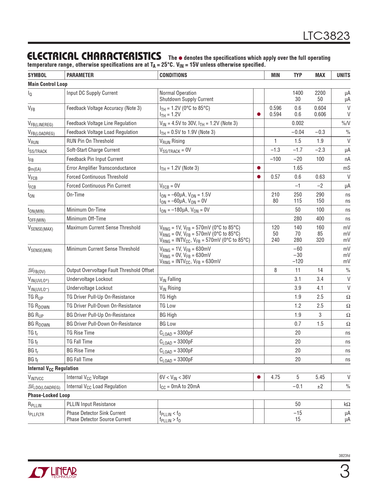denotes the specifi cations which apply over the full operating temperature range, otherwise specifi cations are at TA = 25°C. VIN = 15V unless otherwise specifi ed. SYMBOL PARAMETER CONDITIONS MIN TYP MAX UNITS Main Control Loop