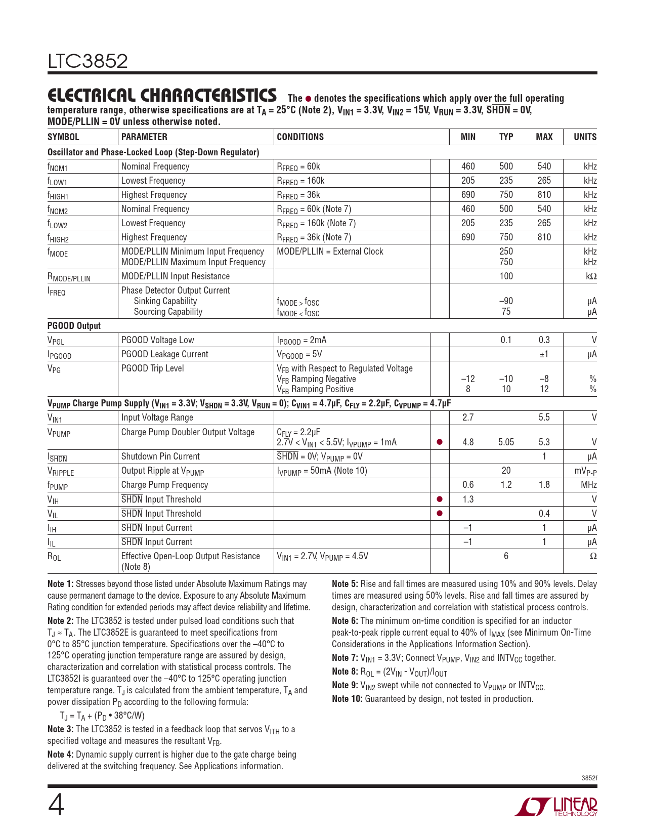 LTC3852 ELECTRICAL CHARACTERISTICSThe l denotes the specifi cations which apply over the full operatingtemperature range, otherwise specifi cations are at TA = 25°C (Note 2), VIN1 = 3.3V, VIN2 = 15V, VRUN = 3.3V, SHDN = 0V,MODE/PLLIN = 0V unless otherwise noted.SYMBOLPARAMETERCONDITIONSMINTYPMAXUNITSOscillator and Phase-Locked Loop (Step-Down Regulator) fNOM1 Nominal Frequency RFREQ = 60k 460 500 540 kHz fLOW1 Lowest Frequency RFREQ = 160k 205 235 265 kHz fHIGH1 Highest Frequency RFREQ = 36k 690 750 810 kHz fNOM2 Nominal Frequency RFREQ = 60k (Note 7) 460 500 540 kHz fLOW2 Lowest Frequency RFREQ = 160k (Note 7) 205 235 265 kHz fHIGH2 Highest Frequency RFREQ = 36k (Note 7) 690 750 810 kHz fMODE MODE/PLLIN Minimum Input Frequency MODE/PLLIN = External Clock 250 kHz MODE/PLLIN Maximum Input Frequency 750 kHz RMODE/PLLIN MODE/PLLIN Input Resistance 100 kΩ IFREQ Phase Detector Output Current Sinking Capability fMODE > fOSC –90 μA Sourcing Capability fMODE < fOSC 75 μA PGOOD Output VPGL PGOOD Voltage Low IPGOOD = 2mA 0.1 0.3 V IPGOOD PGOOD Leakage Current VPGOOD = 5V ±1 μA VPG PGOOD Trip Level VFB with Respect to Regulated Voltage VFB Ramping Negative –12 –10 –8 % VFB Ramping Positive 8 10 12 % VPUMP Charge Pump Supply (VIN1 = 3.3V; VSHDN = 3.3V, VRUN = 0); CVIN1 = 4.7μF, CFLY = 2.2μF, CVPUMP = 4.7μF VIN1 Input Voltage Range 2.7 5.5 V VPUMP Charge Pump Doubler Output Voltage CFLY = 2.2μF 2.7V < VIN1 < 5.5V; IVPUMP = 1mA l 4.8 5.05 5.3 V ISHDN Shutdown Pin Current SHDN = 0V; VPUMP = 0V 1 μA VRIPPLE Output Ripple at VPUMP IVPUMP = 50mA (Note 10) 20 mVP-P fPUMP Charge Pump Frequency 0.6 1.2 1.8 MHz VIH SHDN Input Threshold l 1.3 V VIL SHDN Input Threshold l 0.4 V IIH SHDN Input Current –1 1 μA IIL SHDN Input Current –1 1 μA ROL Effective Open-Loop Output Resistance VIN1 = 2.7V, VPUMP = 4.5V 6 Ω (Note 8) Note 1: Stresses beyond those listed under Absolute Maximum Ratings may Note 5: Rise and fall times are measured using 10% and 90% levels. Delay cause permanent damage to the device. Exposure to any Absolute Maximum times are measured using 50% levels. Rise and fall times are assured by Rating condition for extended periods may affect device reliability and lifetime. design, characterization and correlation with statistical process controls. Note 2: The LTC3852 is tested under pulsed load conditions such that Note 6: The minimum on-time condition is specifi ed for an inductor TJ ≈ TA. The LTC3852E is guaranteed to meet specifi cations from peak-to-peak ripple current equal to 40% of IMAX (see Minimum On-Time 0°C to 85°C junction temperature. Specifi cations over the –40°C to Considerations in the Applications Information Section). 125°C operating junction temperature range are assured by design, Note 7: VIN1 = 3.3V; Connect VPUMP, VIN2 and INTVCC together. characterization and correlation with statistical process controls. The Note 8: ROL = (2VIN - VOUT)/IOUT LTC3852I is guaranteed over the –40°C to 125°C operating junction Note 9: V temperature range. T IN2 swept while not connected to VPUMP or INTVCC. J is calculated from the ambient temperature, TA and power dissipation P Note 10: Guaranteed by design, not tested in production. D according to the following formula: TJ = TA + (PD • 38°C/W) Note 3: The LTC3852 is tested in a feedback loop that servos VITH to a specifi ed voltage and measures the resultant VFB. Note 4: Dynamic supply current is higher due to the gate charge being delivered at the switching frequency. See Applications information. 3852f 4