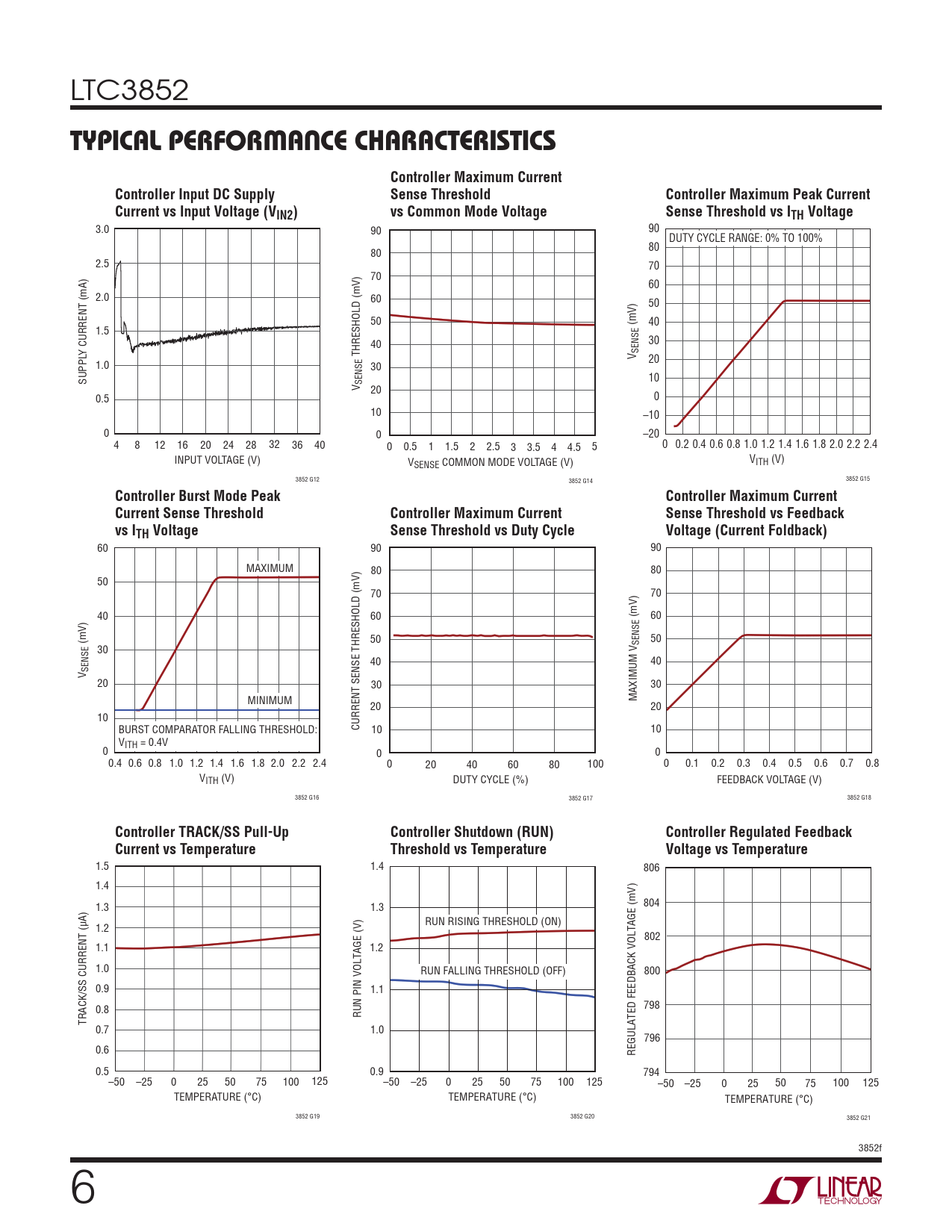60 90 90 MAXIMUM 80 80 50 70 70 40 60 (mV) 60 (mV) 50 SENSE 50 30 40 40 SENSEV 20 30 30 MINIMUM MAXIMUM V 20 20 10 BURST COMPARATOR FALLING THRESHOLD: CURRENT SENSE THRESHOLD (mV) 10 10 VITH = 0.4V 0 0 0 0.4 0.6 0.8 1.0 1.2 1.4 1.6 1.8 2.0 2.2 2.4 0 20 40 60 80 100 0 0.1 0.2 0.3 0.4 0.5 0.6 0.7 0.8 VITH (V) DUTY CYCLE (%) FEEDBACK VOLTAGE (V) 3852 G16 3852 G17 3852 G18