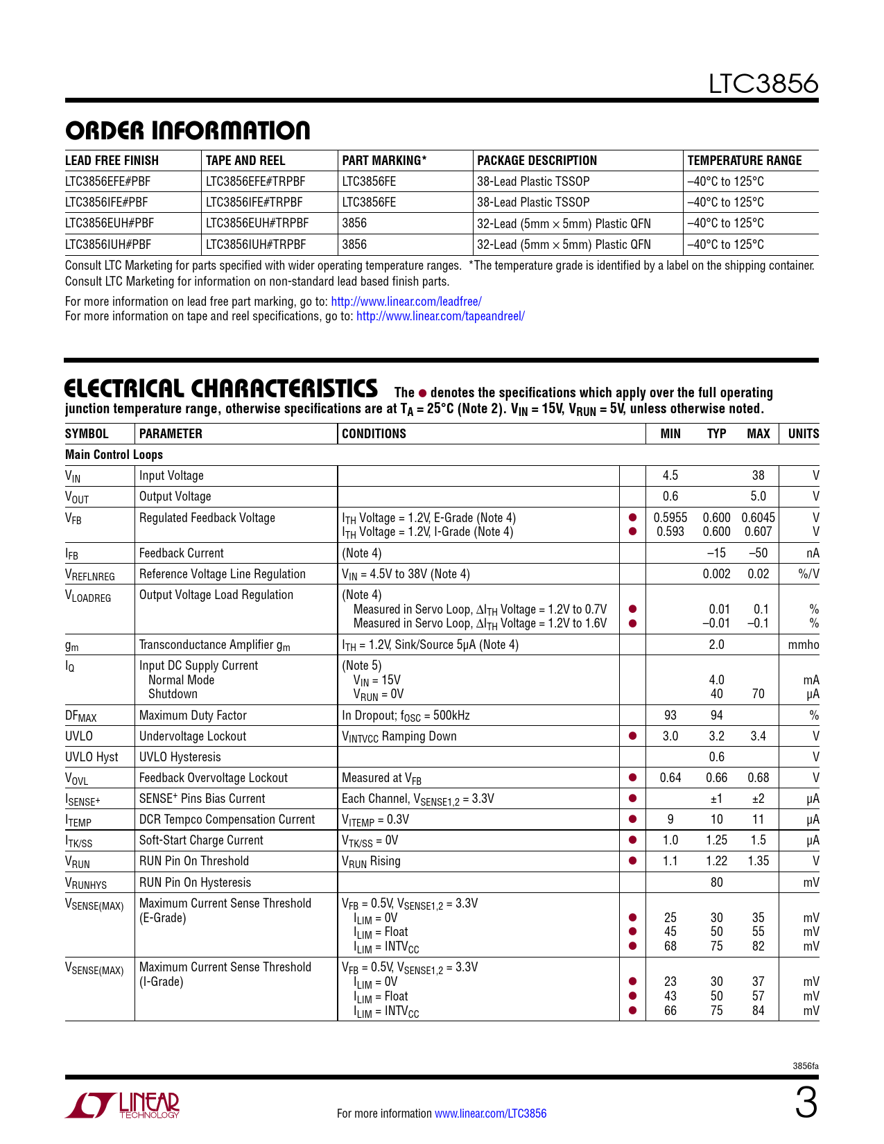 LTC3856 orDer inForMaTion LEAD FREE FINISHTAPE AND REELPART MARKING*PACKAGE DESCRIPTIONTEMPERATURE RANGE LTC3856EFE#PBF LTC3856EFE#TRPBF LTC3856FE 38-Lead Plastic TSSOP –40°C to 125°C LTC3856IFE#PBF LTC3856IFE#TRPBF LTC3856FE 38-Lead Plastic TSSOP –40°C to 125°C LTC3856EUH#PBF LTC3856EUH#TRPBF 3856 32-Lead (5mm × 5mm) Plastic QFN –40°C to 125°C LTC3856IUH#PBF LTC3856IUH#TRPBF 3856 32-Lead (5mm × 5mm) Plastic QFN –40°C to 125°C Consult LTC Marketing for parts specified with wider operating temperature ranges. *The temperature grade is identified by a label on the shipping container. Consult LTC Marketing for information on non-standard lead based finish parts. For more information on lead free part marking, go to: http://www.linear.com/leadfree/ For more information on tape and reel specifications, go to: http://www.linear.com/tapeandreel/ elecTrical characTerisTicsThe l denotes the specifications which apply over the full operatingjunction temperature range, otherwise specifications are at TA = 25°C (Note 2). VIN = 15V, VRUN = 5V, unless otherwise noted. SYMBOLPARAMETERCONDITIONSMINTYPMAXUNITSMain Control Loops VIN Input Voltage 4.5 38 V VOUT Output Voltage 0.6 5.0 V VFB Regulated Feedback Voltage ITH Voltage = 1.2V, E-Grade (Note 4) l 0.5955 0.600 0.6045 V ITH Voltage = 1.2V, I-Grade (Note 4) l 0.593 0.600 0.607 V IFB Feedback Current (Note 4) –15 –50 nA VREFLNREG Reference Voltage Line Regulation VIN = 4.5V to 38V (Note 4) 0.002 0.02 %/V VLOADREG Output Voltage Load Regulation (Note 4) Measured in Servo Loop, ∆ITH Voltage = 1.2V to 0.7V l 0.01 0.1 % Measured in Servo Loop, ∆ITH Voltage = 1.2V to 1.6V l –0.01 –0.1 % gm Transconductance Amplifier gm ITH = 1.2V, Sink/Source 5µA (Note 4) 2.0 mmho IQ Input DC Supply Current (Note 5) Normal Mode VIN = 15V 4.0 mA Shutdown VRUN = 0V 40 70 µA DFMAX Maximum Duty Factor In Dropout; fOSC = 500kHz 93 94 % UVLO Undervoltage Lockout VINTVCC Ramping Down l 3.0 3.2 3.4 V UVLO Hyst UVLO Hysteresis 0.6 V VOVL Feedback Overvoltage Lockout Measured at VFB l 0.64 0.66 0.68 V ISENSE+ SENSE+ Pins Bias Current Each Channel, VSENSE1,2 = 3.3V l ±1 ±2 µA ITEMP DCR Tempco Compensation Current VITEMP = 0.3V l 9 10 11 µA ITK/SS Soft-Start Charge Current VTK/SS = 0V l 1.0 1.25 1.5 µA VRUN RUN Pin On Threshold VRUN Rising l 1.1 1.22 1.35 V VRUNHYS RUN Pin On Hysteresis 80 mV VSENSE(MAX) Maximum Current Sense Threshold VFB = 0.5V, VSENSE1,2 = 3.3V (E-Grade) ILIM = 0V l 25 30 35 mV ILIM = Float l 45 50 55 mV ILIM = INTVCC l 68 75 82 mV VSENSE(MAX) Maximum Current Sense Threshold VFB = 0.5V, VSENSE1,2 = 3.3V (I-Grade) ILIM = 0V l 23 30 37 mV ILIM = Float l 43 50 57 mV ILIM = INTVCC l 66 75 84 mV 3856fa For more information www.linear.com/LTC3856 3 Document Outline Features Applications Description Typical Application Absolute Maximum Ratings Pin Configuration Order Information Electrical Characteristics Typical Performance Characteristics Pin Functions FUNCTIONAL Diagram Operation Applications Information Typical Application Typical Application Related Parts