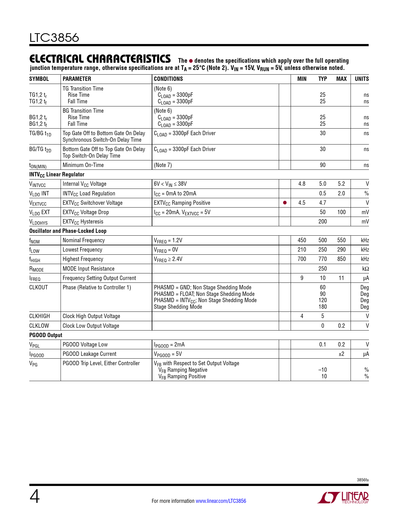 VPGL PGOOD Voltage Low IPGOOD = 2mA 0.1 0.2 V IPGOOD PGOOD Leakage Current VPGOOD = 5V ±2 µA VPG PGOOD Trip Level, Either Controller VFB with Respect to Set Output Voltage VFB Ramping Negative –10 % VFB Ramping Positive 10 % 3856fa 4 For more information www.linear.com/LTC3856 Document Outline Features Applications Description Typical Application Absolute Maximum Ratings Pin Configuration Order Information Electrical Characteristics Typical Performance Characteristics Pin Functions FUNCTIONAL Diagram Operation Applications Information Typical Application Typical Application Related Parts