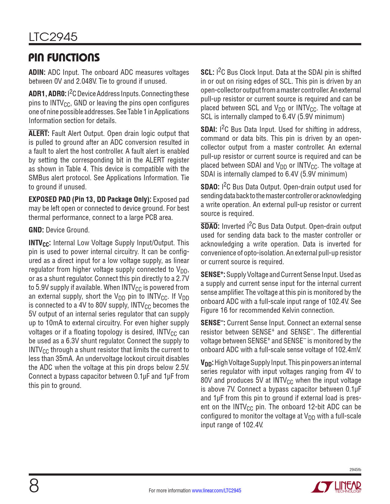 PIN FUNCTIONS. ADIN:. SCL:. ADR1, ADR0:. ALERT:. SDAI:. SDAO:. EXPOSED PAD (Pin 13, DD Package Only):. GND:. INTVCC:. SENSE+:. SENSE–:. DD: