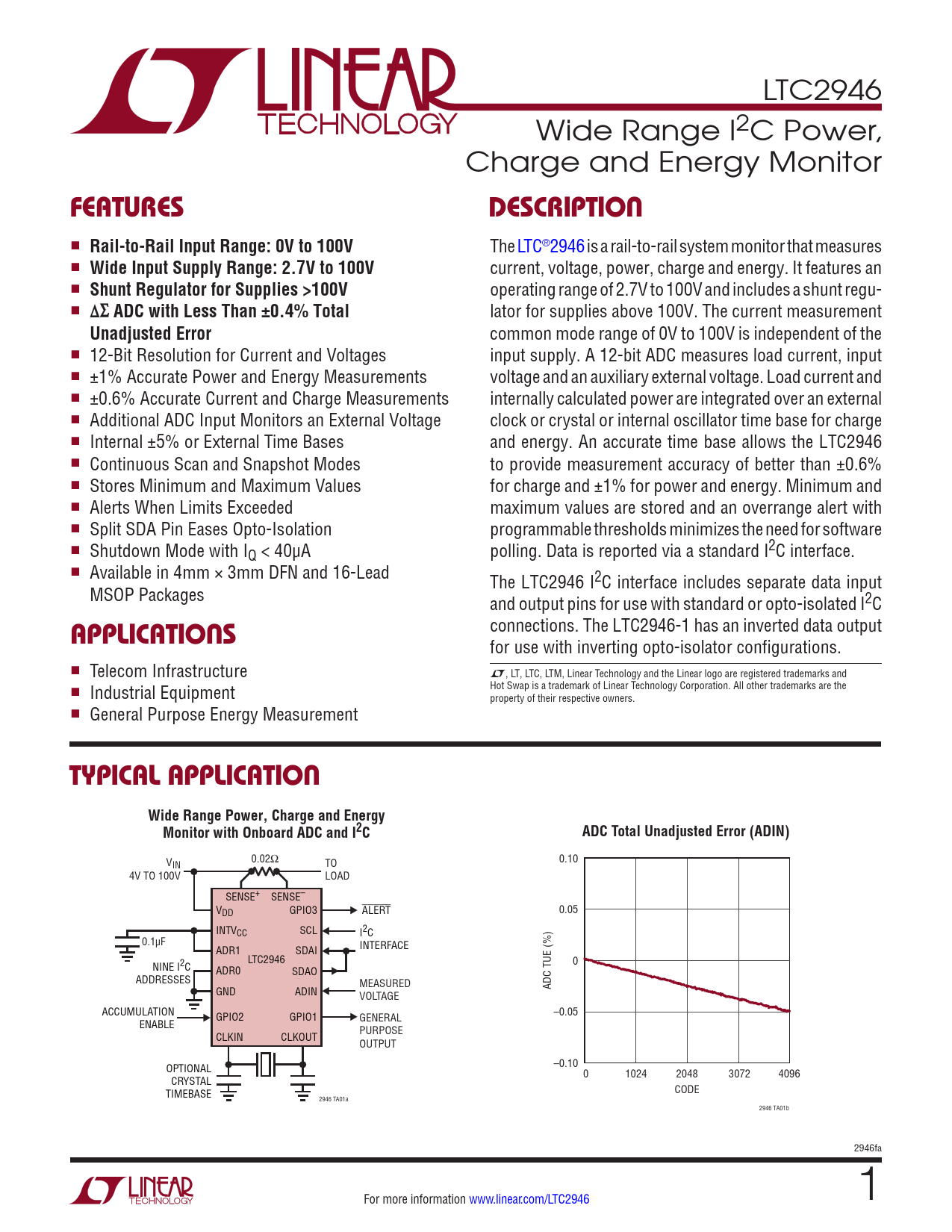 LTC2946 Wide Range I2C Power, Charge and Energy Monitor FEATURESDESCRIPTION n Rail-to-Rail Input Range: 0V to 100V The LTC®2946 is a rail-to-rail system monitor that measures n Wide Input Supply Range: 2.7V to 100V current, voltage, power, charge and energy. It features an n Shunt Regulator for Supplies >100V operating range of 2.7V to 100V and includes a shunt regu- n Δ∑ ADC with Less Than ±0.4% Total lator for supplies above 100V. The current measurement Unadjusted Error common mode range of 0V to 100V is independent of the n 12-Bit Resolution for Current and Voltages input supply. A 12-bit ADC measures load current, input n ±1% Accurate Power and Energy Measurements voltage and an auxiliary external voltage. Load current and n ±0.6% Accurate Current and Charge Measurements internally calculated power are integrated over an external n Additional ADC Input Monitors an External Voltage clock or crystal or internal oscillator time base for charge n Internal ±5% or External Time Bases and energy. An accurate time base allows the LTC2946 n Continuous Scan and Snapshot Modes to provide measurement accuracy of better than ±0.6% n Stores Minimum and Maximum Values for charge and ±1% for power and energy. Minimum and n Alerts When Limits Exceeded maximum values are stored and an overrange alert with n Split SDA Pin Eases Opto-Isolation programmable thresholds minimizes the need for software n Shutdown Mode with IQ < 40µA polling. Data is reported via a standard I2C interface. n Available in 4mm × 3mm DFN and 16-Lead The LTC2946 I2C interface includes separate data input MSOP Packages and output pins for use with standard or opto-isolated I2C connections. The LTC2946-1 has an inverted data output APPLICATIONS for use with inverting opto-isolator configurations. n Telecom Infrastructure L, LT, LTC, LTM, Linear Technology and the Linear logo are registered trademarks and Hot Swap is a trademark of Linear Technology Corporation. All other trademarks are the n Industrial Equipment property of their respective owners. n General Purpose Energy Measurement TYPICAL APPLICATIONWide Range Power, Charge and EnergyMonitor with Onboard ADC and I2CADC Total Unadjusted Error (ADIN) 0.02Ω V 0.10 IN TO 4V TO 100V LOAD SENSE+ SENSE– VDD GPIO3 ALERT 0.05 INTVCC SCL I2C 0.1µF INTERFACE ADR1 SDAI LTC2946 NINE I2C 0 ADR0 SDAO ADDRESSES MEASURED GND ADIN ADC TUE (%) VOLTAGE ACCUMULATION GPIO2 GPIO1 –0.05 ENABLE GENERAL PURPOSE CLKIN CLKOUT OUTPUT OPTIONAL –0.10 0 1024 2048 3072 4096 CRYSTAL TIMEBASE CODE 2946 TA01a 2946 TA01b 2946fa For more information www.linear.com/LTC2946 1 Document Outline Features Applications Description Typical Application Absolute Maximum Ratings Pin Configuration Order Information Electrical Characteristics Typical Performance Characteristics Pin Functions Block Diagram Timing Diagram Operation Applications Information Typical Applications Package Description Typical Application Related Parts