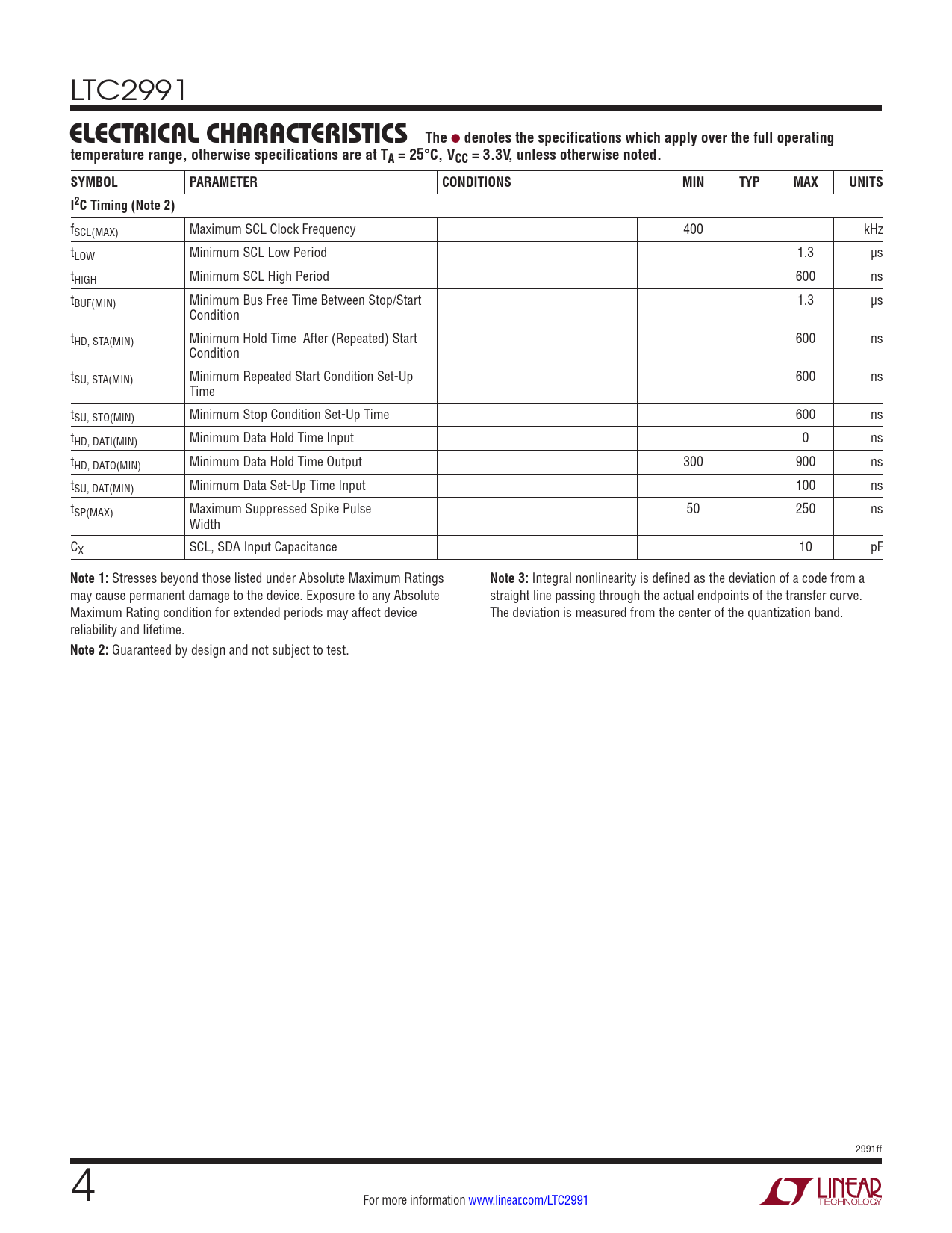 LTC2991 ELECTRICAL CHARACTERISTICSThe l denotes the specifications which apply over the full operatingtemperature range, otherwise specifications are at TA = 25°C, VCC = 3.3V, unless otherwise noted. SYMBOLPARAMETERCONDITIONSMINTYPMAXUNITSI2C Timing (Note 2) fSCL(MAX) Maximum SCL Clock Frequency 400 kHz tLOW Minimum SCL Low Period 1.3 µs tHIGH Minimum SCL High Period 600 ns tBUF(MIN) Minimum Bus Free Time Between Stop/Start 1.3 µs Condition tHD, STA(MIN) Minimum Hold Time After (Repeated) Start 600 ns Condition tSU, STA(MIN) Minimum Repeated Start Condition Set-Up 600 ns Time tSU, STO(MIN) Minimum Stop Condition Set-Up Time 600 ns tHD, DATI(MIN) Minimum Data Hold Time Input 0 ns tHD, DATO(MIN) Minimum Data Hold Time Output 300 900 ns tSU, DAT(MIN) Minimum Data Set-Up Time Input 100 ns tSP(MAX) Maximum Suppressed Spike Pulse 50 250 ns Width CX SCL, SDA Input Capacitance 10 pF Note 1: Stresses beyond those listed under Absolute Maximum Ratings Note 3: Integral nonlinearity is defined as the deviation of a code from a may cause permanent damage to the device. Exposure to any Absolute straight line passing through the actual endpoints of the transfer curve. Maximum Rating condition for extended periods may affect device The deviation is measured from the center of the quantization band. reliability and lifetime. Note 2: Guaranteed by design and not subject to test. 2991ff 4 For more information www.linear.com/LTC2991 Document Outline Features Applications Description Typical Application Absolute Maximum Ratings Pin Configuration Order Information Electrical Characteristics Typical Performance Characteristics Pin Functions Functional Diagram Timing Diagram Operation Applications Information Typical Applications Package Description Revision History Typical Application Related Parts