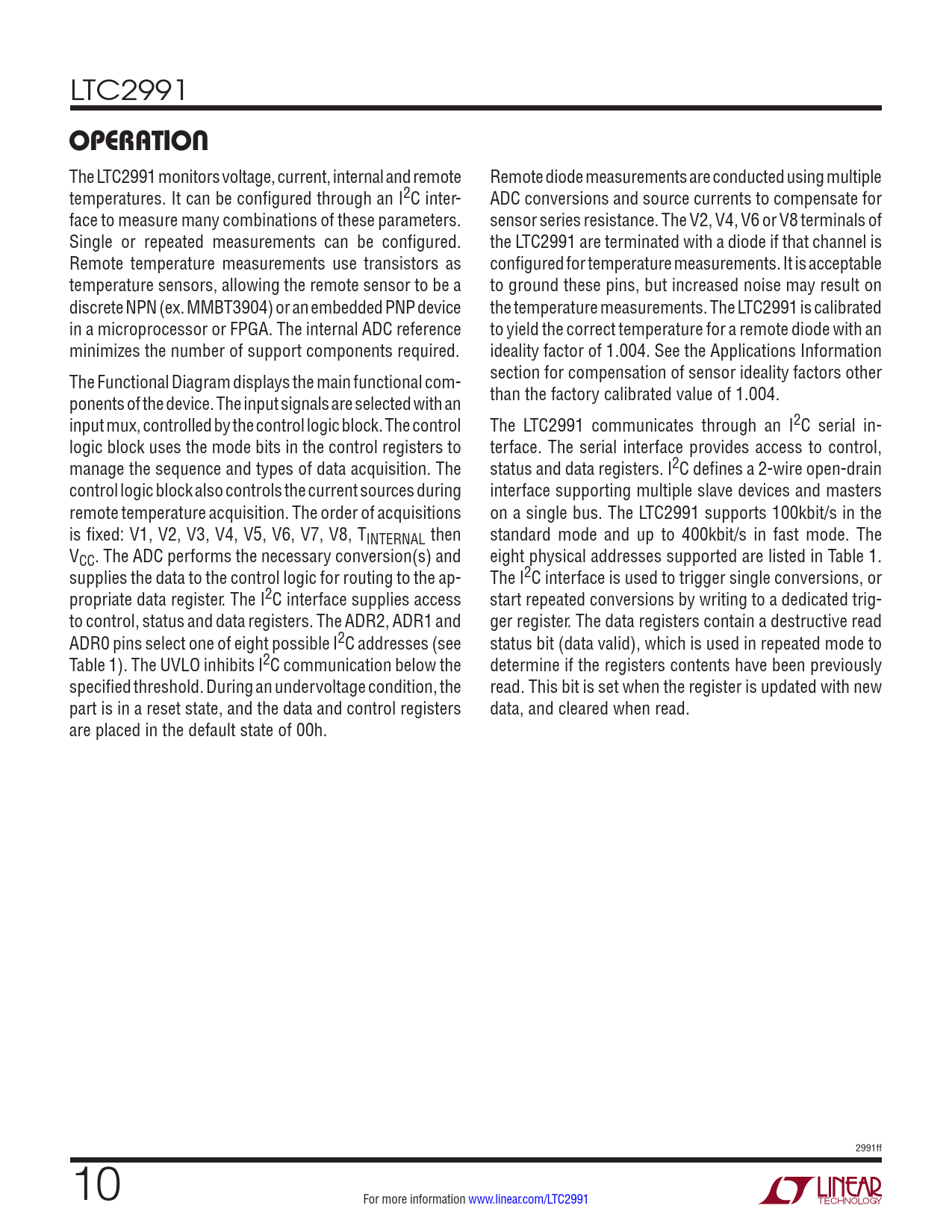 LTC2991 OPERATION The LTC2991 monitors voltage, current, internal and remote Remote diode measurements are conducted using multiple temperatures. It can be configured through an I2C inter- ADC conversions and source currents to compensate for face to measure many combinations of these parameters. sensor series resistance. The V2, V4, V6 or V8 terminals of Single or repeated measurements can be configured. the LTC2991 are terminated with a diode if that channel is Remote temperature measurements use transistors as configured for temperature measurements. It is acceptable temperature sensors, allowing the remote sensor to be a to ground these pins, but increased noise may result on discrete NPN (ex. MMBT3904) or an embedded PNP device the temperature measurements. The LTC2991 is calibrated in a microprocessor or FPGA. The internal ADC reference to yield the correct temperature for a remote diode with an minimizes the number of support components required. ideality factor of 1.004. See the Applications Information The Functional Diagram displays the main functional com- section for compensation of sensor ideality factors other ponents of the device. The input signals are selected with an than the factory calibrated value of 1.004. input mux, controlled by the control logic block. The control The LTC2991 communicates through an I2C serial in- logic block uses the mode bits in the control registers to terface. The serial interface provides access to control, manage the sequence and types of data acquisition. The status and data registers. I2C defines a 2-wire open-drain control logic block also controls the current sources during interface supporting multiple slave devices and masters remote temperature acquisition. The order of acquisitions on a single bus. The LTC2991 supports 100kbit/s in the is fixed: V1, V2, V3, V4, V5, V6, V7, V8, TINTERNAL then standard mode and up to 400kbit/s in fast mode. The VCC. The ADC performs the necessary conversion(s) and eight physical addresses supported are listed in Table 1. supplies the data to the control logic for routing to the ap- The I2C interface is used to trigger single conversions, or propriate data register. The I2C interface supplies access start repeated conversions by writing to a dedicated trig- to control, status and data registers. The ADR2, ADR1 and ger register. The data registers contain a destructive read ADR0 pins select one of eight possible I2C addresses (see status bit (data valid), which is used in repeated mode to Table 1). The UVLO inhibits I2C communication below the determine if the registers contents have been previously specified threshold. During an undervoltage condition, the read. This bit is set when the register is updated with new part is in a reset state, and the data and control registers data, and cleared when read. are placed in the default state of 00h. 2991ff 10 For more information www.linear.com/LTC2991 Document Outline Features Applications Description Typical Application Absolute Maximum Ratings Pin Configuration Order Information Electrical Characteristics Typical Performance Characteristics Pin Functions Functional Diagram Timing Diagram Operation Applications Information Typical Applications Package Description Revision History Typical Application Related Parts