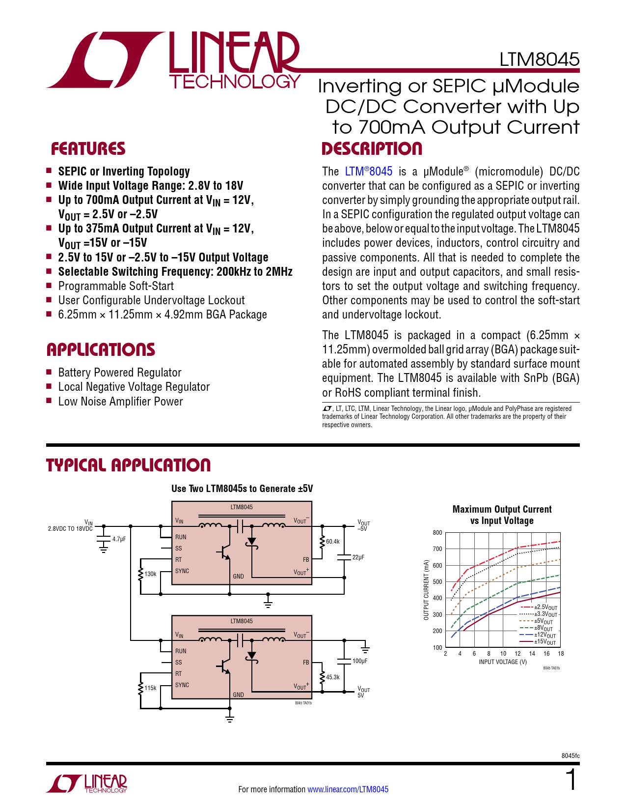 11.25mm) overmolded ball grid array (BGA) package suit- able for automated assembly by standard surface mount n Battery Powered Regulator equipment. The LTM8045 is available with SnPb (BGA) n Local Negative Voltage Regulator or RoHS compliant terminal finish. n Low Noise Amplifier Power L, LT, LTC, LTM, Linear Technology, the Linear logo, µModule and PolyPhase are registered trademarks of Linear Technology Corporation. All other trademarks are the property of their respective owners.