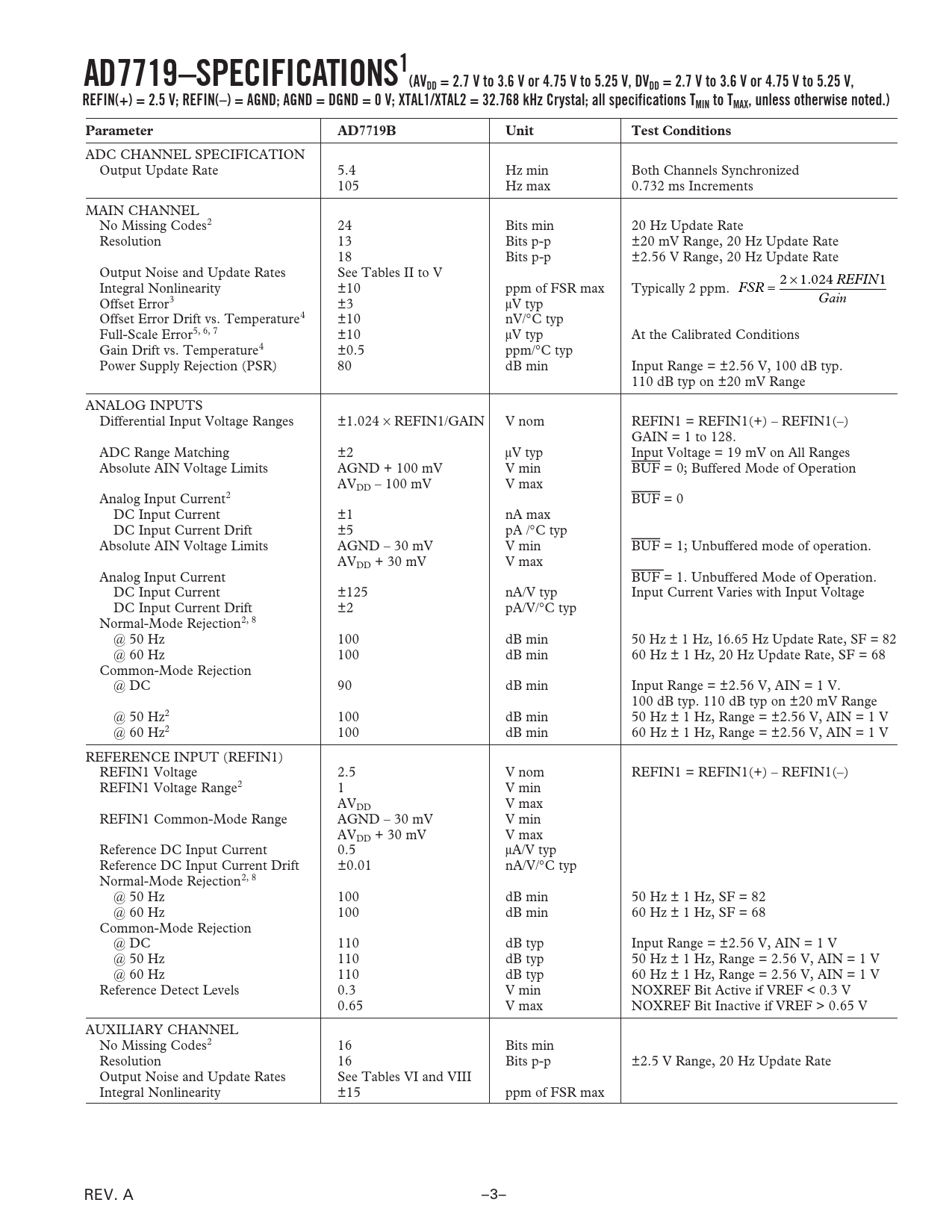 AD7719–SPECIFICATIONS1(AVDD = 2.7 V to 3.6 V or 4.75 V to 5.25 V, DVDD = 2.7 V to 3.6 V or 4.75 V to 5.25 V,