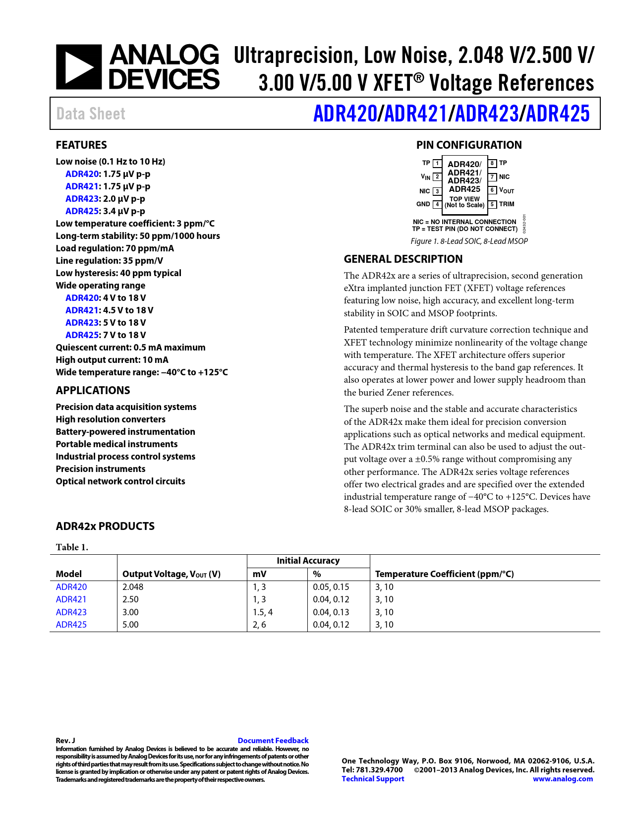 Ultraprecision, Low Noise, 2.048 V/2.500 V/. 3.00 V/5.00 V XFET® Voltage References. Data Sheet. ADR420/. ADR421/. ADR423/. ADR425