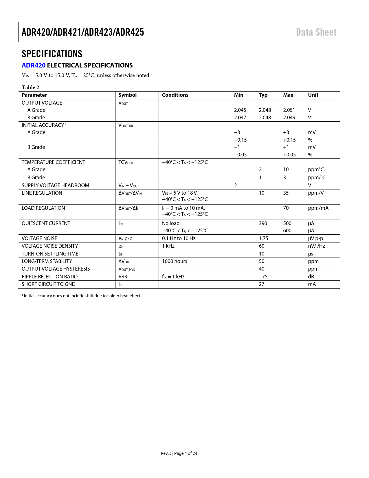 ADR420/ADR421/ADR423/ADR425 Data Sheet SPECIFICATIONS ADR420 ELECTRICAL SPECIFICATIONS Table 2 Parameter Symbol Conditions