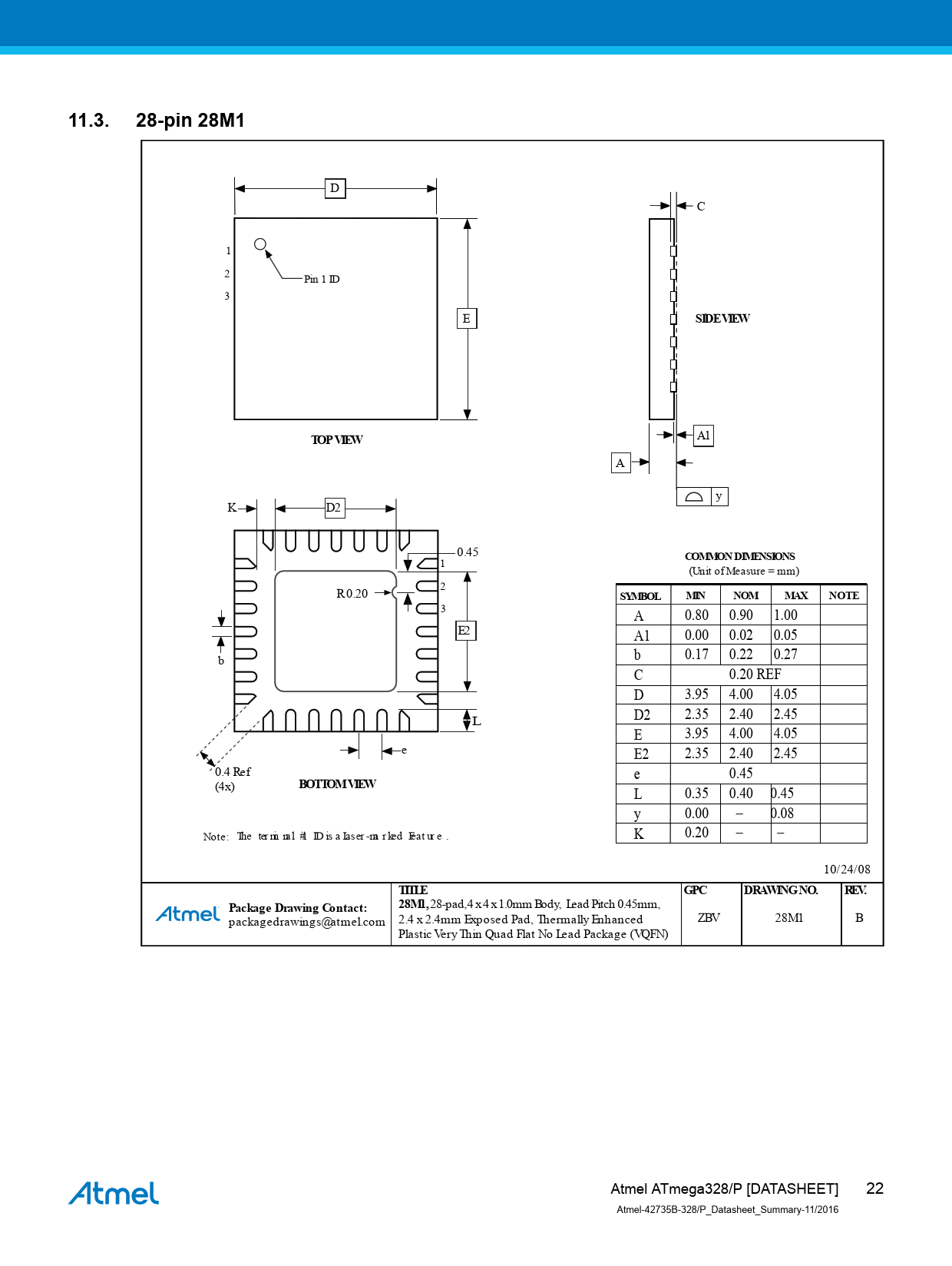 11.3. 28-pin 28M1 D C 1 2 Pin 1 ID 3 E SIDE VIEWTOP VIEW A1 A y K D2 0.45 COMMON DIMENSIONS 1 (Unit of Measure = mm) 2 R 0.20 SYMBOLMINNOMMAXNOTE 3 A 0.80 0.90 1.00 E2 A1 0.00 0.02 0.05 b b 0.17 0.22 0.27 C 0.20 REF D 3.95 4.00 4.05 2.35 2.40 2.45 L D2 E 3.95 4.00 4.05 e E2 2.35 2.40 2.45 0.4 Ref e 0.45 (4x) BOTTOM VIEW L 0.35 0.40 0.45 y 0.00 – 0.08 Note: The ter mi nal #1 ID is a Laser -ma r ked Feat ur e . K 0.20 – – 10/24/08 TITLEGPCDRAWING NO.REV.Package Drawing Contact:28M1, 28-pad, 4 x 4 x 1.0mm Body, Lead Pitch 0.45mm, packagedrawings@atmel.com 2.4 x 2.4mm Exposed Pad, Thermally Enhanced ZBV 28M1 B Plastic Very Thin Quad Flat No Lead Package (VQFN) Atmel ATmega328/P [DATASHEET] 22 Atmel-42735B-328/P_Datasheet_Summary-11/2016 Document Outline Introduction Feature Table of Contents 1. Description 2. Configuration Summary 3. Ordering Information 3.1. ATmega328 3.2. ATmega328P 4. Block Diagram 5. Pin Configurations 5.1. Pin-out 5.2. Pin Descriptions 5.2.1. VCC 5.2.2. GND 5.2.3. Port B (PB[7:0]) XTAL1/XTAL2/TOSC1/TOSC2 5.2.4. Port C (PC[5:0]) 5.2.5. PC6/RESET 5.2.6. Port D (PD[7:0]) 5.2.7. AVCC 5.2.8. AREF 5.2.9. ADC[7:6] (TQFP and VFQFN Package Only) 6. I/O Multiplexing 7. Resources 8. Data Retention 9. About Code Examples 10. Capacitive Touch Sensing 10.1. QTouch Library 11. Packaging Information 11.1. 32-pin 32A 11.2. 32-pin 32M1-A 11.3. 28-pin 28M1 11.4. 28-pin 28P3