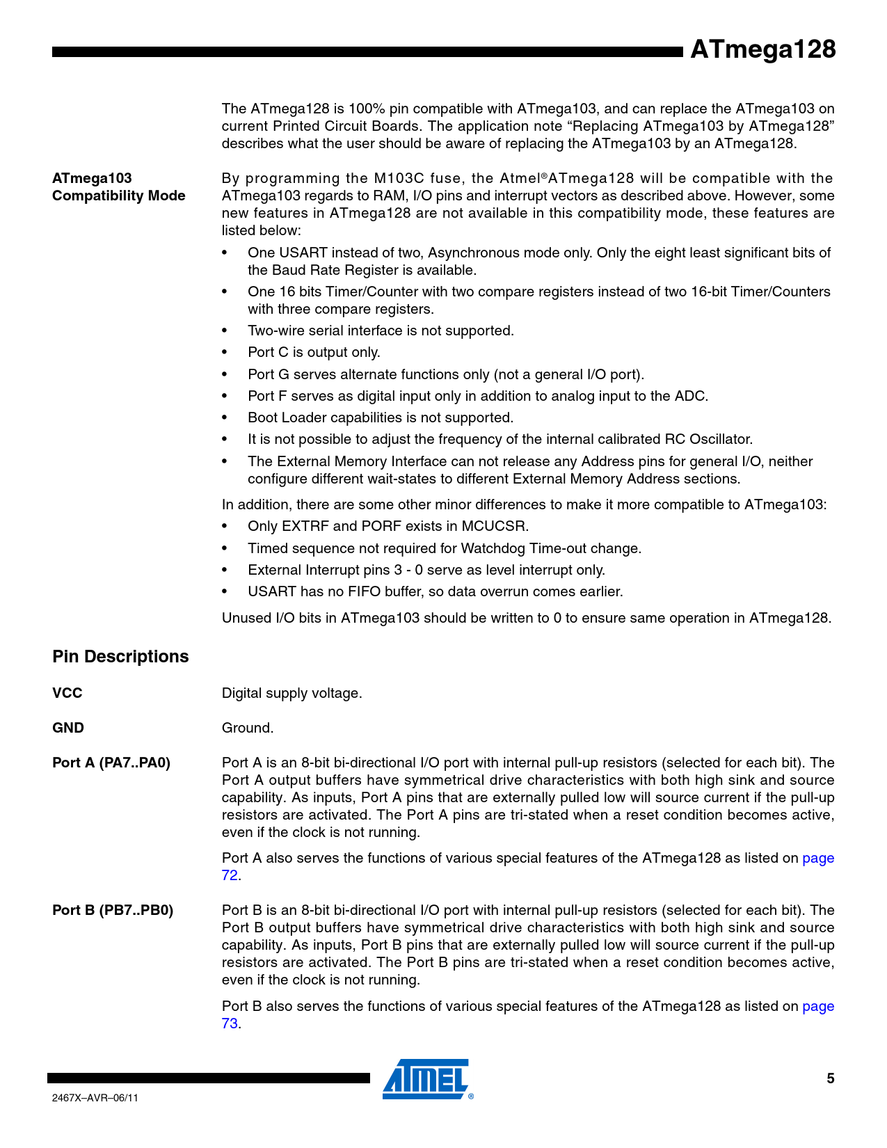 link to page 72 link to page 72 link to page 73 link to page 73 ATmega128 The ATmega128 is 100% pin compatible with ATmega103, and can replace the ATmega103 on current Printed Circuit Boards. The application note “Replacing ATmega103 by ATmega128” describes what the user should be aware of replacing the ATmega103 by an ATmega128. ATmega103 By programming the M103C fuse, the Atmel®ATmega128 will be compatible with the Compatibility Mode ATmega103 regards to RAM, I/O pins and interrupt vectors as described above. However, some new features in ATmega128 are not available in this compatibility mode, these features are listed below: • One USART instead of two, Asynchronous mode only. Only the eight least significant bits of the Baud Rate Register is available. • One 16 bits Timer/Counter with two compare registers instead of two 16-bit Timer/Counters with three compare registers. • Two-wire serial interface is not supported. • Port C is output only. • Port G serves alternate functions only (not a general I/O port). • Port F serves as digital input only in addition to analog input to the ADC. • Boot Loader capabilities is not supported. • It is not possible to adjust the frequency of the internal calibrated RC Oscillator. • The External Memory Interface can not release any Address pins for general I/O, neither configure different wait-states to different External Memory Address sections. In addition, there are some other minor differences to make it more compatible to ATmega103: • Only EXTRF and PORF exists in MCUCSR. • Timed sequence not required for Watchdog Time-out change. • External Interrupt pins 3 - 0 serve as level interrupt only. • USART has no FIFO buffer, so data overrun comes earlier. Unused I/O bits in ATmega103 should be written to 0 to ensure same operation in ATmega128. Pin DescriptionsVCC Digital supply voltage. GND Ground. Port A (PA7..PA0) Port A is an 8-bit bi-directional I/O port with internal pull-up resistors (selected for each bit). The Port A output buffers have symmetrical drive characteristics with both high sink and source capability. As inputs, Port A pins that are externally pulled low will source current if the pull-up resistors are activated. The Port A pins are tri-stated when a reset condition becomes active, even if the clock is not running. Port A also serves the functions of various special features of the ATmega128 as listed on page 72. Port B (PB7..PB0) Port B is an 8-bit bi-directional I/O port with internal pull-up resistors (selected for each bit). The Port B output buffers have symmetrical drive characteristics with both high sink and source capability. As inputs, Port B pins that are externally pulled low will source current if the pull-up resistors are activated. The Port B pins are tri-stated when a reset condition becomes active, even if the clock is not running. Port B also serves the functions of various special features of the ATmega128 as listed on page 73. 5 2467X–AVR–06/11 Document Outline Features Pin Configurations Overview Block Diagram ATmega103 and ATmega128 Compatibility ATmega103 Compatibility Mode Pin Descriptions VCC GND Port A (PA7..PA0) Port B (PB7..PB0) Port C (PC7..PC0) Port D (PD7..PD0) Port E (PE7..PE0) Port F (PF7..PF0) Port G (PG4..PG0) RESET XTAL1 XTAL2 AVCC AREF PEN Resources Data Retention About Code Examples Capacitive touch sensing AVR CPU Core Introduction Architectural Overview ALU – Arithmetic Logic Unit Status Register General Purpose Register File X-register, Y-register, and Z-register Stack Pointer RAM Page Z Select Register – RAMPZ Instruction Execution Timing Reset and Interrupt Handling Interrupt Response Time AVR ATmega128 Memories In-System Reprogrammable Flash Program Memory SRAM Data Memory Data Memory Access Times EEPROM Data Memory EEPROM Read/Write Access EEPROM Address Register – EEARH and EEARL EEPROM Data Register – EEDR EEPROM Control Register – EECR EEPROM Write During Power-down Sleep Mode Preventing EEPROM Corruption I/O Memory External Memory Interface Overview ATmega103 Compatibility Using the External Memory Interface Address Latch Requirements Pull-up and Bus- keeper Timing XMEM Register Description MCU Control Register – MCUCR External Memory Control Register A – XMCRA External Memory Control Register B – XMCRB Using all Locations of External Memory Smaller than 64 Kbyte Using all 64 Kbyte Locations of External Memory System Clock and Clock Options Clock Systems and their Distribution CPU Clock – clkCPU I/O Clock – clkI/O Flash Clock – clkFLASH Asynchronous Timer Clock – clkASY ADC Clock – clkADC XTAL Divide Control Register – XDIV Clock Sources Default Clock Source Crystal Oscillator Low-frequency Crystal Oscillator External RC Oscillator Calibrated Internal RC Oscillator Oscillator Calibration Register – OSCCAL External Clock Timer/Counter Oscillator Power Management and Sleep Modes MCU Control Register – MCUCR Idle Mode ADC Noise Reduction Mode Power-down Mode Power-save Mode Standby Mode Extended Standby Mode Minimizing Power Consumption Analog to Digital Converter Analog Comparator Brown-out Detector Internal Voltage Reference Watchdog Timer Port Pins JTAG Interface and On-chip Debug System System Control and Reset Resetting the AVR Reset Sources Power-on Reset External Reset Brown-out Detection Watchdog Reset MCU Control and Status Register – MCUCSR Internal Voltage Reference Voltage Reference Enable Signals and Start-up Time Watchdog Timer Watchdog Timer Control Register – WDTCR Timed Sequences for Changing the Configuration of the Watchdog Timer Safety Level 0 Safety Level 1 Safety Level 2 Interrupts Interrupt Vectors in ATmega128 Moving Interrupts Between Application and Boot Space MCU Control Register – MCUCR I/O Ports Introduction Ports as General Digital I/O Configuring the Pin Reading the Pin Value Digital Input Enable and Sleep Modes Unconnected pins Alternate Port Functions Special Function IO Register –