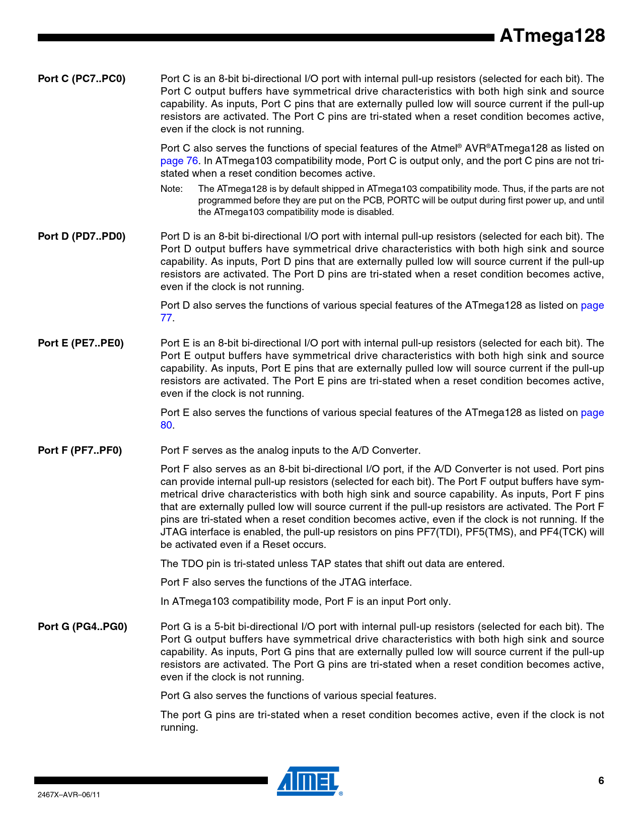 link to page 76 link to page 77 link to page 77 link to page 80 link to page 80 ATmega128Port C (PC7..PC0) Port C is an 8-bit bi-directional I/O port with internal pull-up resistors (selected for each bit). The Port C output buffers have symmetrical drive characteristics with both high sink and source capability. As inputs, Port C pins that are externally pulled low will source current if the pull-up resistors are activated. The Port C pins are tri-stated when a reset condition becomes active, even if the clock is not running. Port C also serves the functions of special features of the Atmel® AVR®ATmega128 as listed on page 76. In ATmega103 compatibility mode, Port C is output only, and the port C pins are not tri- stated when a reset condition becomes active. Note: The ATmega128 is by default shipped in ATmega103 compatibility mode. Thus, if the parts are not programmed before they are put on the PCB, PORTC will be output during first power up, and until the ATmega103 compatibility mode is disabled. Port D (PD7..PD0) Port D is an 8-bit bi-directional I/O port with internal pull-up resistors (selected for each bit). The Port D output buffers have symmetrical drive characteristics with both high sink and source capability. As inputs, Port D pins that are externally pulled low will source current if the pull-up resistors are activated. The Port D pins are tri-stated when a reset condition becomes active, even if the clock is not running. Port D also serves the functions of various special features of the ATmega128 as listed on page 77. Port E (PE7..PE0) Port E is an 8-bit bi-directional I/O port with internal pull-up resistors (selected for each bit). The Port E output buffers have symmetrical drive characteristics with both high sink and source capability. As inputs, Port E pins that are externally pulled low will source current if the pull-up resistors are activated. The Port E pins are tri-stated when a reset condition becomes active, even if the clock is not running. Port E also serves the functions of various special features of the ATmega128 as listed on page 80. Port F (PF7..PF0) Port F serves as the analog inputs to the A/D Converter. Port F also serves as an 8-bit bi-directional I/O port, if the A/D Converter is not used. Port pins can provide internal pull-up resistors (selected for each bit). The Port F output buffers have sym- metrical drive characteristics with both high sink and source capability. As inputs, Port F pins that are externally pulled low will source current if the pull-up resistors are activated. The Port F pins are tri-stated when a reset condition becomes active, even if the clock is not running. If the JTAG interface is enabled, the pull-up resistors on pins PF7(TDI), PF5(TMS), and PF4(TCK) will be activated even if a Reset occurs. The TDO pin is tri-stated unless TAP states that shift out data are entered. Port F also serves the functions of the JTAG interface. In ATmega103 compatibility mode, Port F is an input Port only. Port G (PG4..PG0) Port G is a 5-bit bi-directional I/O port with internal pull-up resistors (selected for each bit). The Port G output buffers have symmetrical drive characteristics with both high sink and source capability. As inputs, Port G pins that are externally pulled low will source current if the pull-up resistors are activated. The Port G pins are tri-stated when a reset condition becomes active, even if the clock is not running. Port G also serves the functions of various special features. The port G pins are tri-stated when a reset condition becomes active, even if the clock is not running. 6 2467X–AVR–06/11 Document Outline Features Pin Configurations Overview Block Diagram ATmega103 and ATmega128 Compatibility ATmega103 Compatibility Mode Pin Descriptions VCC GND Port A (PA7..PA0) Port B (PB7..PB0) Port C (PC7..PC0) Port D (PD7..PD0) Port E (PE7..PE0) Port F (PF7..PF0) Port G (PG4..PG0) RESET XTAL1 XTAL2 AVCC AREF PEN Resources Data Retention About Code Examples Capacitive touch sensing AVR CPU Core Introduction Architectural Overview ALU – Arithmetic Logic Unit Status Register General Purpose Register File X-register, Y-register, and Z-register Stack Pointer RAM Page Z Select Register – RAMPZ Instruction Execution Timing Reset and Interrupt Handling Interrupt Response Time AVR ATmega128 Memories In-System Reprogrammable Flash Program Memory SRAM Data Memory Data Memory Access Times EEPROM Data Memory EEPROM Read/Write Access EEPROM Address Register – EEARH and EEARL EEPROM Data Register – EEDR EEPROM Control Register – EECR EEPROM Write During Power-down Sleep Mode Preventing EEPROM Corruption I/O Memory External Memory Interface Overview ATmega103 Compatibility Using the External Memory Interface Address Latch Requirements Pull-up and Bus- keeper Timing XMEM Register Description MCU Control Register – MCUCR External Memory Control Register A – XMCRA External Memory Control Register B – XMCRB Using all Locations of External Memory Smaller than 64 Kbyte Using all 64 Kbyte Locations of External Memory System Clock and Clock Options Clock Systems and their Distribution CPU Clock – clkCPU I/O Clock – clkI/O Flash Clock – clkFLASH Asynchronous Timer Clock – clkASY ADC Clock – clkADC XTAL Divide Control Register – XDIV Clock Sources Default Clock Source Crystal Oscillator Low-frequency Crystal Oscillator External RC Oscillator Calibrated Internal RC Oscillator Oscillator Calibration Register – OSCCAL External Clock Timer/Counter Oscillator Power Management and Sleep Modes MCU Control Register – MCUCR Idle Mode ADC Noise Reduction Mode Power-down Mode Power-save Mode Standby Mode Extended Standby Mode Minimizing Power Consumption Analog to Digital Converter Analog Comparator Brown-out Detector Internal Voltage Reference Watchdog Timer Port Pins JTAG Interface and On-chip Debug System System Control and Reset Resetting the AVR Reset Sources Power-on Reset External Reset Brown-out Detection Watchdo