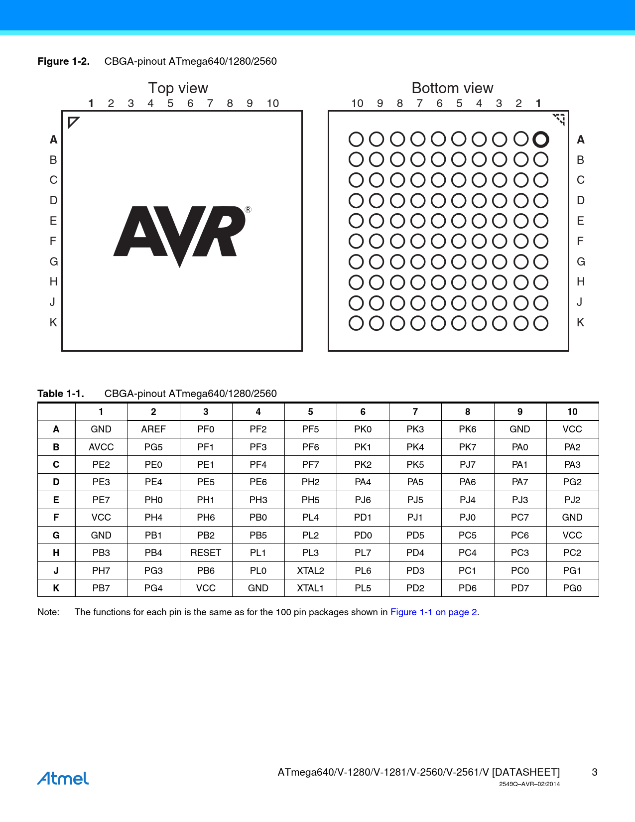 link to page 2 Figure 1-2. CBGA-pinout ATmega640/1280/2560 Top view Bottom view 1 2 3 4 5 6 7 8 9 10 10 9 8 7 6 5 4 3 2 1AA B B C C D D E E F F G G H H J J K K Table 1-1. CBGA-pinout ATmega640/1280/2560 12345678910A GND AREF PF0 PF2 PF5 PK0 PK3 PK6 GND VCC B AVCC PG5 PF1 PF3 PF6 PK1 PK4 PK7 PA0 PA2 C PE2 PE0 PE1 PF4 PF7 PK2 PK5 PJ7 PA1 PA3 D PE3 PE4 PE5 PE6 PH2 PA4 PA5 PA6 PA7 PG2 E PE7 PH0 PH1 PH3 PH5 PJ6 PJ5 PJ4 PJ3 PJ2 F VCC PH4 PH6 PB0 PL4 PD1 PJ1 PJ0 PC7 GND G GND PB1 PB2 PB5 PL2 PD0 PD5 PC5 PC6 VCC H PB3 PB4 RESET PL1 PL3 PL7 PD4 PC4 PC3 PC2 J PH7 PG3 PB6 PL0 XTAL2 PL6 PD3 PC1 PC0 PG1 K PB7 PG4 VCC GND XTAL1 PL5 PD2 PD6 PD7 PG0 Note: The functions for each pin is the same as for the 100 pin packages shown in Figure 1-1 on page 2. ATmega640/V-1280/V-1281/V-2560/V-2561/V [DATASHEET] 3 2549Q–AVR–02/2014 Document Outline 1. Pin Configurations 2. Overview 2.1 Block Diagram 2.2 Comparison Between ATmega1281/2561 and ATmega640/1280/2560 2.3 Pin Descriptions 2.3.1 VCC 2.3.2 GND 2.3.3 Port A (PA7..PA0) 2.3.4 Port B (PB7..PB0) 2.3.5 Port C (PC7..PC0) 2.3.6 Port D (PD7..PD0) 2.3.7 Port E (PE7..PE0) 2.3.8 Port F (PF7..PF0) 2.3.9 Port G (PG5..PG0) 2.3.10 Port H (PH7..PH0) 2.3.11 Port J (PJ7..PJ0) 2.3.12 Port K (PK7..PK0) 2.3.13 Port L (PL7..PL0) 2.3.14 RESET 2.3.15 XTAL1 2.3.16 XTAL2 2.3.17 AVCC 2.3.18 AREF 3. Resources 4. About Code Examples 5. Data Retention 6. Capacitive touch sensing 7. AVR CPU Core 7.1 Introduction 7.2 Architectural Overview 7.3 ALU – Arithmetic Logic Unit 7.4 Status Register 7.4.1 SREG – AVR Status Register 7.5 General Purpose Register File 7.5.1 The X-register, Y-register, and Z-register 7.6 Stack Pointer 7.6.1 RAMPZ – Extended Z-pointer Register for ELPM/SPM 7.6.2 EIND – Extended Indirect Register 7.7 Instruction Execution Timing 7.8 Reset and Interrupt Handling 7.8.1 Interrupt Response Time 8. AVR Memories 8.1 In-System Reprogrammable Flash Program Memory 8.2 SRAM Data Memory 8.2.1 Data Memory Access Times 8.3 EEPROM Data Memory 8.3.1 EEPROM Read/Write Access 8.3.2 Preventing EEPROM Corruption 8.4 I/O Memory 8.4.1 General Purpose I/O Registers 9. External Memory Interface 9.1 Overview 9.1.1 Using the External Memory Interface 9.1.2 Address Latch Requirements 9.1.3 Pull-up and Bus-keeper 9.1.4 Timing 9.1.5 Using all Locations of External Memory Smaller than 64Kbytes 9.1.6 Using all 64Kbytes Locations of External Memory 9.2 Register Description 9.2.1 EEPROM registers 9.3 General Purpose registers 9.3.1 GPIOR2 – General Purpose I/O Register 2 9.3.2 GPIOR1 – General Purpose I/O Register 1 9.3.3 GPIOR0 – General Purpose I/O Register 0 9.4 External Memory registers 9.4.1 XMCRA – External Memory Control Register A 9.4.2 XMCRB – External Memory Control Register B 10. System Clock and Clock Options 10.1 Overview 10.2 Clock Systems and their Distribution 10.2.1 CPU Clock – clkCPU 10.2.2 I/O Clock – clkI/O 10.2.3 Flash Clock – clkFLASH 10.2.4 Asynchronous Timer Clock – clkASY 10.2.5 ADC Clock – clkADC 10.3 Clock Sources 10.3.1 Default Clock Source 10.3.2 Clock Start-up Sequence 10.4 Low Power Crystal Oscillator 10.5 Full Swing Crystal Oscillator 10.6 Low Frequency Crystal Oscillator 10.7 Calibrated Internal RC Oscillator 10.8 128kHz Internal Oscillator 10.9 External Clock 10.10 Clock Output Buffer 10.11 Timer/Counter Oscillator 10.12 System Clock Prescaler 10.13 Register Description 10.13.1 OSCCAL – Oscillator Calibration Register 10.13.2 CLKPR – Clock Prescale Register 11. Power Management and Sleep Modes 11.1 Sleep Modes 11.2 Idle Mode 11.3 ADC Noise Reduction Mode 11.4 Power-down Mode 11.5 Power-save Mode 11.6 Standby Mode 11.7 Extended Standby Mode 11.8 Power Reduction Register 11.9 Minimizing Power Consumption 11.9.1 Analog to Digital Converter 11.9.2 Analog Comparator 11.9.3 Brown-out Detector 11.9.4 Internal Voltage Reference 11.9.5 Watchdog Timer 11.9.6 Port Pins 11.9.7 On-chip Debug System 11.10 Register Description 11.10.1 SMCR – Sleep Mode Control Register 11.10.2 PRR0 – Power Reduction Register 0 11.10.3 PRR1 – Power Reduction Register 1 12. System Control and Reset 12.1 Resetting the AVR 12.2 Reset Sources 12.2.1 Power-on Reset 12.2.2 External Reset 12.2.3 Brown-out Detection 12.2.4 Watchdog Reset 12.3 Internal Voltage Reference 12.3.1 Voltage Reference Enable Signals and Start-up Time 12.4 Watchdog Timer 12.4.1 Features 12.4.2 Overview 12.5 Register Description 12.5.1 MCUSR – MCU Status Register 12.5.2 WDTCSR – Watchdog Timer Control Register 13. I/O-Ports 13.1 Introduction 13.2 Ports as General Digital I/O 13.2.1 Configuring the Pin 13.2.2 Toggling the Pin 13.2.3 Switching Between Input and Output 13.2.4 Reading the Pin Value 13.2.5 Digital Input Enable and Sleep Modes 13.2.6 Unconnected Pins 13.3 Alternate Port Functions 13.3.1 Alternate Functions of Port A 13.3.2 Alternate Functions of Port B 13.3.3 Alternate Functions of Port C 13.3.4 Alternate Functions of Port D 13.3.5 Alternate Functions of Port E 13.3.6 Alternate Functions of Port F 13.3.7 Alternate Functions of Port G 13.3.8 Alternate Functions of Port H 13.3.9 Alternate Functions of Port J 13.3.10 Alternate Functions of Port K 13.3.11 Alternate Functions of Port L 13.4 Register Description for I/O-Ports 13.4.1 MCUCR – MCU Control Register 13.4.2 PORTA – Port A Data Register 13.4.3 DDRA – Port A Data Direction Register 13.4.4 PINA – Port A Input Pins Address 13.4.5 PORTB – Port B Data Register 13.4.6 DDRB – Port B Data Direction Register 13.4.7 PINB – Port B Input Pins Address 13.4.8 PORTC – Port C Data Register 13.4.9 DDRC – Port C Data Direction Register 13.4.10 PINC– Port C Input Pins Address 13.4.11 PORTD – Port D Data Register 13.4.12 DDRD – Port D Data Direction Register 13.4.13 PIND – Port D Input Pins Address 13.4.14 PORTE – Port E Data Register 13.4.15 DDRE – Port E Data Direction Register 13.4.16 PINE – Port E Input Pins Address 13.4.17 PORTF – Port F Data Register 13.4.18 DDRF – Port F Data Direction Register 13.4.1