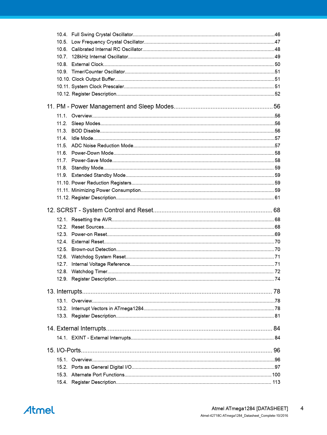 link to page 46 link to page 47 link to page 48 link to page 49 link to page 50 link to page 51 link to page 51 link to page 51 link to page 52 link to page 56 link to page 56 link to page 56 link to page 56 link to page 57 link to page 57 link to page 58 link to page 58 link to page 59 link to page 59 link to page 59 link to page 59 link to page 61 link to page 68 link to page 68 link to page 68 link to page 69 link to page 70 link to page 70 link to page 71 link to page 71 link to page 72 link to page 74 link to page 78 link to page 78 link to page 78 link to page 81 link to page 84 link to page 84 link to page 96 link to page 96 link to page 97 link to page 100 link to page 113 10.4. Full Swing Crystal Oscillator...46 10.5. Low Frequency Crystal Oscillator...47 10.6. Calibrated Internal RC Oscillator..48 10.7. 128kHz Internal Oscillator.. 49 10.8. External Clock.. 50 10.9. Timer/Counter Oscillator...51 10.10. Clock Output Buffer..51 10.11. System Clock Prescaler... 51 10.12. Register Description...52 11. PM - Power Management and Sleep Modes... 56 11.1. Overview...56 11.2. Sleep Modes...56 11.3. BOD Disable...56 11.4. Idle Mode..57 11.5. ADC Noise Reduction Mode...57 11.6. Power-Down Mode...58 11.7. Power-Save Mode..58 11.8. Standby Mode.. 59 11.9. Extended Standby Mode.. 59 11.10. Power Reduction Registers..59 11.11. Minimizing Power Consumption... 59 11.12. Register Description... 61 12. SCRST - System Control and Reset... 68 12.1. Resetting the AVR.. 68 12.2. Reset Sources..68 12.3. Power-on Reset..69 12.4. External Reset..70 12.5. Brown-out Detection...70 12.6. Watchdog System Reset.. 71 12.7. Internal Voltage Reference...71 12.8. Watchdog Timer... 72 12.9. Register Description... 74 13. Interrupts... 78 13.1. Overview...78 13.2. Interrupt Vectors in ATmega1284... 78 13.3. Register Description... 81 14. External Interrupts... 84 14.1. EXINT - External Interrupts.. 84 15. I/O-Ports.. 96 15.1. Overview...96 15.2. Ports as General Digital I/O..97 15.3. Alternate Port Functions...100 15.4. Register Description... 113 Atmel ATmega1284 [DATASHEET] 4 Atmel-42718C-ATmega1284_Datasheet_Complete-10/2016 Document Outline Introduction Feature Table of Contents 1. Description 2. Configuration Summary 3. Ordering Information 4. Block Diagram 5. Pin Configurations 5.1. Pinout 5.1.1. PDIP 5.1.2. TQFN and QFN 5.2. Pin Descriptions 5.2.1. VCC 5.2.2. GND 5.2.3. Port A (PA[7:0]) 5.2.4. Port B (PB[7:0]) 5.2.5. Port C (PC[7:0]) 5.2.6. Port D (PD[7:0]) 5.2.7. RESET 5.2.8. XTAL1 5.2.9. XTAL2 5.2.10. AVCC 5.2.11. AREF 6. I/O Multiplexing 7. General Information 7.1. Resources 7.2. Data Retention 7.3. About Code Examples 7.4. Capacitive Touch Sensing 7.4.1. QTouch Library 8. AVR CPU Core 8.1. Overview 8.2. ALU – Arithmetic Logic Unit 8.3. Status Register 8.3.1. Status Register 8.4. General Purpose Register File 8.4.1. The X-register, Y-register, and Z-register 8.5. Stack Pointer 8.5.1. Stack Pointer Register Low and High byte 8.5.2. Extended Z-pointer Register for ELPM/SPM 8.6. Accessing 16-bit Registers 8.7. Instruction Execution Timing 8.8. Reset and Interrupt Handling 8.8.1. Interrupt Response Time 9. AVR Memories 9.1. Overview 9.2. In-System Reprogrammable Flash Program Memory 9.3. SRAM Data Memory 9.3.1. Data Memory Access Times 9.4. EEPROM Data Memory 9.4.1. EEPROM Read/Write Access 9.4.2. Preventing EEPROM Corruption 9.5. I/O Memory 9.5.1. General Purpose I/O Registers 9.6. Register Description 9.6.1. Accessing 16-bit Registers 9.6.2. EEPROM Address Register Low and High Byte 9.6.3. EEPROM Data Register 9.6.4. EEPROM Control Register 9.6.5. GPIOR2 – General Purpose I/O Register 2 9.6.6. GPIOR1 – General Purpose I/O Register 1 9.6.7. GPIOR0 – General Purpose I/O Register 0 10. System Clock and Clock Options 10.1. Clock Systems and Their Distribution 10.1.1. CPU Clock – clkCPU 10.1.2. I/O Clock – clkI/O 10.1.3. Flash Clock – clkFLASH 10.1.4. Asynchronous Timer Clock – clkASY 10.1.5. ADC Clock – clkADC 10.2. Clock Sources 10.2.1. Default Clock Source 10.2.2. Clock Startup Sequence 10.2.3. Clock Source Connections 10.3. Low Power Crystal Oscillator 10.4. Full Swing Crystal Oscillator 10.5. Low Frequency Crystal Oscillator 10.6. Calibrated Internal RC Oscillator 10.7. 128kHz Internal Oscillator 10.8. External Clock 10.9. Timer/Counter Oscillator 10.10. Clock Output Buffer 10.11. System Clock Prescaler 10.12. Register Description 10.12.1. Oscillator Calibration Register 10.12.2. Clock Prescaler Register 11. PM - Power Management and Sleep Modes 11.1. Overview 11.2. Sleep Modes 11.3. BOD Disable 11.4. Idle Mode 11.5. ADC Noise Reduction Mode 11.6. Power-Down Mode 11.7. Power-Save Mode 11.8. Standby Mode 11.9. Extended Standby Mode 11.10. Power Reduction Registers 11.11. Minimizing Power Consumption 11.11.1. Analog to Digital Converter 11.11.2. Analog Comparator 11.11.3. Brown-Out Detector 11.11.4. Internal Voltage Reference 11.11.5. Watchdog Timer 11.11.6. Port Pins 11.11.7. On-chip Debug System 11.12. Register Description 11.12.1. Sleep Mode Control Register 11.12.2. MCU Control Register 11.12.3. Power Reduction Register 0 11.12.4. Power Reduction Register 1 12. SCRST - System Control and Reset 12.1. Resetting the AVR 12.2. Reset Sources 12.3. Power-on Reset 12.4. External Reset 12.5. Brown-out Detection 12.6. Watchdog System Reset 12.7. Internal Voltage Reference 12.7.1. Voltage Reference Enable Signals and Start-up Time 12.8. Watchdog Timer 12.8.1. Features 12.8.2. Overview 12.9. Register Description 12.9.1. MCU Status Register 12.9.2. WDTCSR – Watchdog Timer Control Register 13. Interrupts 13.1. Overview 13.2. Interrupt Vectors in ATmega1284 13.3. Register Description 13.3.1. Moving Interrupts Between Application and Boot Space 13.3.2. MCU Control Register 14. External Interrupts 14.1. EXINT - External Interrupts 14.1.1. Pin Change Interrupt Timing 14.1.2. Register Description 14.1.2.1. External Interrupt Control Register A 14.1.2.2. External Interrupt Mask Register 14.1.2.3. Externa