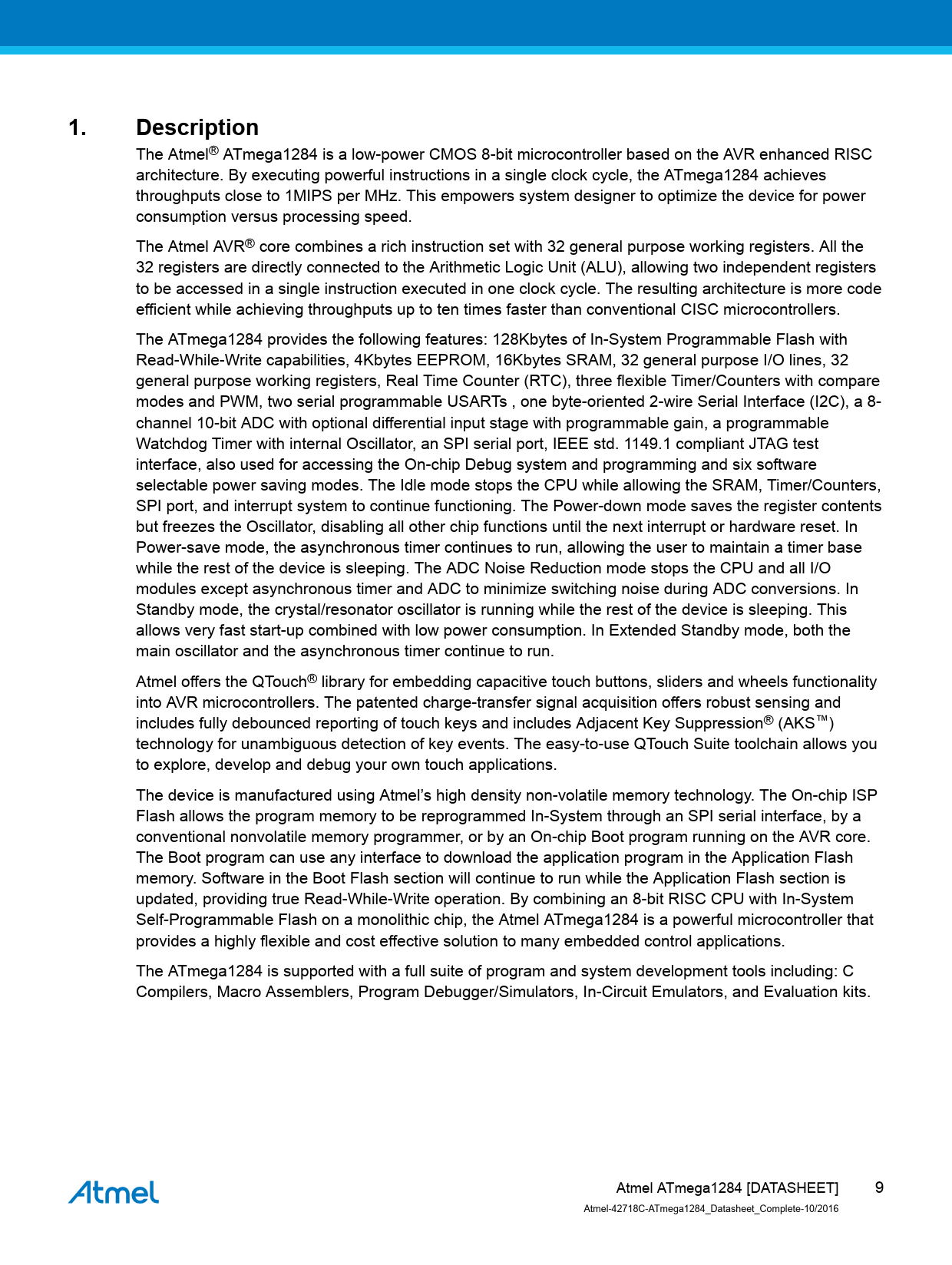 The Atmel® ATmega1284 is a low-power CMOS 8-bit microcontroller based on the AVR enhanced RISC architecture. By executing powerful instructions in a single clock cycle, the ATmega1284 achieves throughputs close to 1MIPS per MHz. This empowers system designer to optimize the device for power consumption versus processing speed. The Atmel AVR® core combines a rich instruction set with 32 general purpose working registers. All the 32 registers are directly connected to the Arithmetic Logic Unit (ALU), allowing two independent registers to be accessed in a single instruction executed in one clock cycle. The resulting architecture is more code efficient while achieving throughputs up to ten times faster than conventional CISC microcontrollers. The ATmega1284 provides the following features: 128Kbytes of In-System Programmable Flash with Read-While-Write capabilities, 4Kbytes EEPROM, 16Kbytes SRAM, 32 general purpose I/O lines, 32 general purpose working registers, Real Time Counter (RTC), three flexible Timer/Counters with compare modes and PWM, two serial programmable USARTs , one byte-oriented 2-wire Serial Interface (I2C), a 8- channel 10-bit ADC with optional differential input stage with programmable gain, a programmable Watchdog Timer with internal Oscillator, an SPI serial port, IEEE std. 1149.1 compliant JTAG test interface, also used for accessing the On-chip Debug system and programming and six software selectable power saving modes. The Idle mode stops the CPU while allowing the SRAM, Timer/Counters, SPI port, and interrupt system to continue functioning. The Power-down mode saves the register contents but freezes the Oscillator, disabling all other chip functions until the next interrupt or hardware reset. In Power-save mode, the asynchronous timer continues to run, allowing the user to maintain a timer base while the rest of the device is sleeping. The ADC Noise Reduction mode stops the CPU and all I/O modules except asynchronous timer and ADC to minimize switching noise during ADC conversions. In Standby mode, the crystal/resonator oscillator is running while the rest of the device is sleeping. This allows very fast start-up combined with low power consumption. In Extended Standby mode, both the main oscillator and the asynchronous timer continue to run. Atmel offers the QTouch® library for embedding capacitive touch buttons, sliders and wheels functionality into AVR microcontrollers. The patented charge-transfer signal acquisition offers robust sensing and includes fully debounced reporting of touch keys and includes Adjacent Key Suppression® (AKS™) technology for unambiguous detection of key events. The easy-to-use QTouch Suite toolchain allows you to explore, develop and debug your own touch applications. The device is manufactured using Atmel’s high density non-volatile memory technology. The On-chip ISP Flash allows the program memory to be reprogrammed In-System through an SPI serial interface, by a conventional nonvolatile memory programmer, or by an On-chip Boot program running on the AVR core. The Boot program can use any interface to download the application program in the Application Flash memory. Software in the Boot Flash section will continue to run while the Application Flash section is updated, providing true Read-While-Write operation. By combining an 8-bit RISC CPU with In-System Self-Programmable Flash on a monolithic chip, the Atmel ATmega1284 is a powerful microcontroller that provides a highly flexible and cost effective solution to many embedded control applications. The ATmega1284 is supported with a full suite of program and system development tools including: C Compilers, Macro Assemblers, Program Debugger/Simulators, In-Circuit Emulators, and Evaluation kits. Atmel ATmega1284 [DATASHEET] 9 Atmel-42718C-ATmega1284_Datasheet_Complete-10/2016 Document Outline Introduction Feature Table of Contents 1. Description 2. Configuration Summary 3. Ordering Information 4. Block Diagram 5. Pin Configurations 5.1. Pinout 5.1.1. PDIP 5.1.2. TQFN and QFN 5.2. Pin Descriptions 5.2.1. VCC 5.2.2. GND 5.2.3. Port A (PA[7:0]) 5.2.4. Port B (PB[7:0]) 5.2.5. Port C (PC[7:0]) 5.2.6. Port D (PD[7:0]) 5.2.7. RESET 5.2.8. XTAL1 5.2.9. XTAL2 5.2.10. AVCC 5.2.11. AREF 6. I/O Multiplexing 7. General Information 7.1. Resources 7.2. Data Retention 7.3. About Code Examples 7.4. Capacitive Touch Sensing 7.4.1. QTouch Library 8. AVR CPU Core 8.1. Overview 8.2. ALU – Arithmetic Logic Unit 8.3. Status Register 8.3.1. Status Register 8.4. General Purpose Register File 8.4.1. The X-register, Y-register, and Z-register 8.5. Stack Pointer 8.5.1. Stack Pointer Register Low and High byte 8.5.2. Extended Z-pointer Register for ELPM/SPM 8.6. Accessing 16-bit Registers 8.7. Instruction Execution Timing 8.8. Reset and Interrupt Handling 8.8.1. Interrupt Response Time 9. AVR Memories 9.1. Overview 9.2. In-System Reprogrammable Flash Program Memory 9.3. SRAM Data Memory 9.3.1. Data Memory Access Times 9.4. EEPROM Data Memory 9.4.1. EEPROM Read/Write Access 9.4.2. Preventing EEPROM Corruption 9.5. I/O Memory 9.5.1. General Purpose I/O Registers 9.6. Register Description 9.6.1. Accessing 16-bit Registers 9.6.2. EEPROM Address Register Low and High Byte 9.6.3. EEPROM Data Register 9.6.4. EEPROM Control Register 9.6.5. GPIOR2 – General Purpose I/O Register 2 9.6.6. GPIOR1 – General Purpose I/O Register 1 9.6.7. GPIOR0 – General Purpose I/O Register 0 10. System Clock and Clock Options 10.1. Clock Systems and Their Distribution 10.1.1. CPU Clock – clkCPU 10.1.2. I/O Clock – clkI/O 10.1.3. Flash Clock – clkFLASH 10.1.4. Asynchronous Timer Clock – clkASY 10.1.5. ADC Clock – clkADC 10.2. Clock Sources 10.2.1. Default Clock Source 10.2.2. Clock Startup Sequence 10.2.3. Clock Source Connections 10.3. Low Power Crystal Oscillator 10.4. Full Swing Crystal Oscillator 10.5. Low Frequency Crystal Oscillator 10.6. Cal