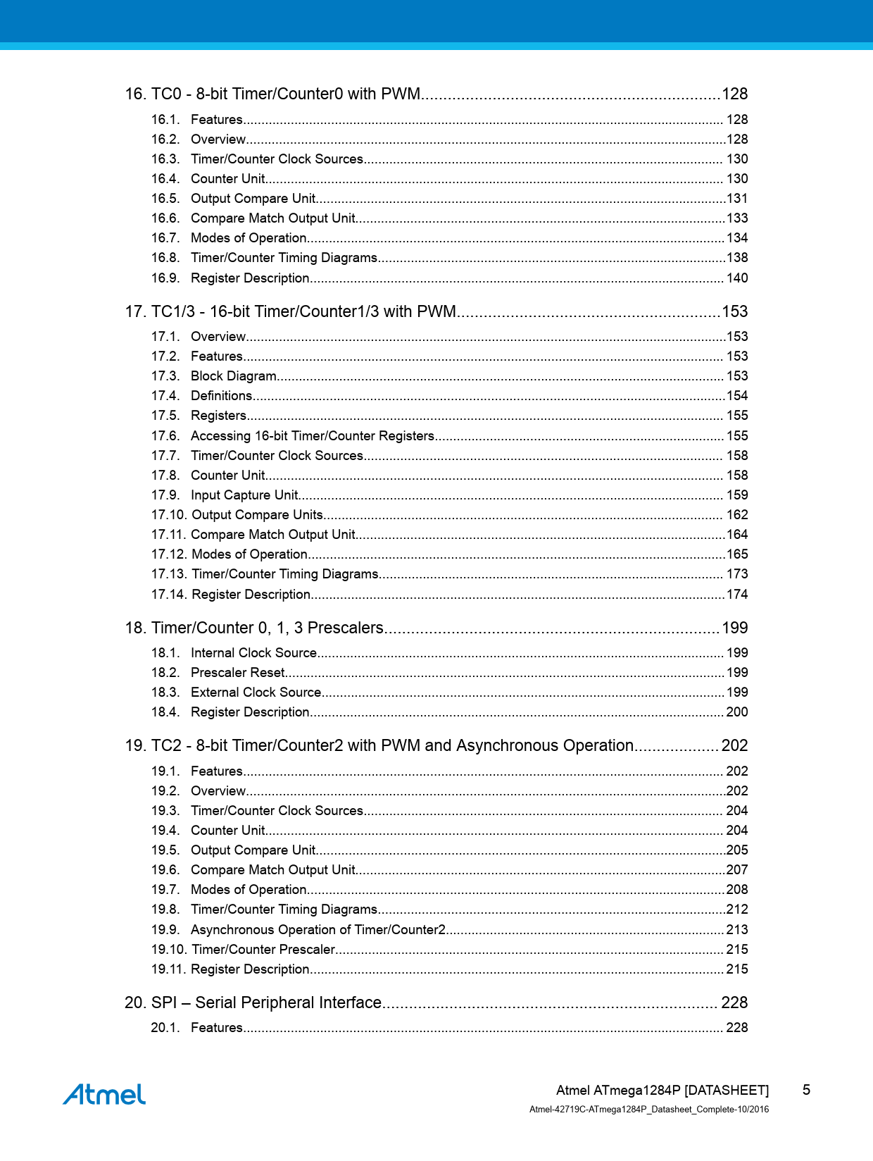 link to page 128 link to page 128 link to page 128 link to page 130 link to page 130 link to page 131 link to page 133 link to page 134 link to page 138 link to page 140 link to page 153 link to page 153 link to page 153 link to page 153 link to page 154 link to page 155 link to page 155 link to page 158 link to page 158 link to page 159 link to page 162 link to page 164 link to page 165 link to page 173 link to page 174 link to page 199 link to page 199 link to page 199 link to page 199 link to page 200 link to page 202 link to page 202 link to page 202 link to page 204 link to page 204 link to page 205 link to page 207 link to page 208 link to page 212 link to page 213 link to page 215 link to page 215 link to page 228 link to page 228 16. TC0 - 8-bit Timer/Counter0 with PWM...128 16.1. Features... 128 16.2. Overview...128 16.3. Timer/Counter Clock Sources.. 130 16.4. Counter Unit... 130 16.5. Output Compare Unit..131 16.6. Compare Match Output Unit...133 16.7. Modes of Operation..134 16.8. Timer/Counter Timing Diagrams...138 16.9. Register Description... 140 17. TC1/3 - 16-bit Timer/Counter1/3 with PWM...153 17.1. Overview...153 17.2. Features... 153 17.3. Block Diagram.. 153 17.4. Definitions...154 17.5. Registers.. 155 17.6. Accessing 16-bit Timer/Counter Registers... 155 17.7. Timer/Counter Clock Sources.. 158 17.8. Counter Unit... 158 17.9. Input Capture Unit.. 159 17.10. Output Compare Units... 162 17.11. Compare Match Output Unit...164 17.12. Modes of Operation..165 17.13. Timer/Counter Timing Diagrams.. 173 17.14. Register Description...174 18. Timer/Counter 0, 1, 3 Prescalers...199 18.1. Internal Clock Source... 199 18.2. Prescaler Reset..199 18.3. External Clock Source..199 18.4. Register Description... 200 19. TC2 - 8-bit Timer/Counter2 with PWM and Asynchronous Operation... 202 19.1. Features... 202 19.2. Overview...202 19.3. Timer/Counter Clock Sources.. 204 19.4. Counter Unit... 204 19.5. Output Compare Unit..205 19.6. Compare Match Output Unit...207 19.7. Modes of Operation..208 19.8. Timer/Counter Timing Diagrams...212 19.9. Asynchronous Operation of Timer/Counter2.. 213 19.10. Timer/Counter Prescaler.. 215 19.11. Register Description... 215 20. SPI – Serial Peripheral Interface... 228 20.1. Features... 228 Atmel ATmega1284P [DATASHEET] 5 Atmel-42719C-ATmega1284P_Datasheet_Complete-10/2016 Document Outline Introduction Feature Table of Contents 1. Description 2. Configuration Summary 3. Ordering Information 4. Block Diagram 5. Pin Configurations 5.1. Pinout 5.1.1. PDIP 5.1.2. TQFN and QFN 5.2. Pin Descriptions 5.2.1. VCC 5.2.2. GND 5.2.3. Port A (PA[7:0]) 5.2.4. Port B (PB[7:0]) 5.2.5. Port C (PC[7:0]) 5.2.6. Port D (PD[7:0]) 5.2.7. RESET 5.2.8. XTAL1 5.2.9. XTAL2 5.2.10. AVCC 5.2.11. AREF 6. I/O Multiplexing 7. General Information 7.1. Resources 7.2. Data Retention 7.3. About Code Examples 7.4. Capacitive Touch Sensing 7.4.1. QTouch Library 8. AVR CPU Core 8.1. Overview 8.2. ALU – Arithmetic Logic Unit 8.3. Status Register 8.3.1. Status Register 8.4. General Purpose Register File 8.4.1. The X-register, Y-register, and Z-register 8.5. Stack Pointer 8.5.1. Stack Pointer Register Low and High byte 8.5.2. Extended Z-pointer Register for ELPM/SPM 8.6. Accessing 16-bit Registers 8.7. Instruction Execution Timing 8.8. Reset and Interrupt Handling 8.8.1. Interrupt Response Time 9. AVR Memories 9.1. Overview 9.2. In-System Reprogrammable Flash Program Memory 9.3. SRAM Data Memory 9.3.1. Data Memory Access Times 9.4. EEPROM Data Memory 9.4.1. EEPROM Read/Write Access 9.4.2. Preventing EEPROM Corruption 9.5. I/O Memory 9.5.1. General Purpose I/O Registers 9.6. Register Description 9.6.1. Accessing 16-bit Registers 9.6.2. EEPROM Address Register Low and High Byte 9.6.3. EEPROM Data Register 9.6.4. EEPROM Control Register 9.6.5. GPIOR2 – General Purpose I/O Register 2 9.6.6. GPIOR1 – General Purpose I/O Register 1 9.6.7. GPIOR0 – General Purpose I/O Register 0 10. System Clock and Clock Options 10.1. Clock Systems and Their Distribution 10.1.1. CPU Clock – clkCPU 10.1.2. I/O Clock – clkI/O 10.1.3. Flash Clock – clkFLASH 10.1.4. Asynchronous Timer Clock – clkASY 10.1.5. ADC Clock – clkADC 10.2. Clock Sources 10.2.1. Default Clock Source 10.2.2. Clock Startup Sequence 10.2.3. Clock Source Connections 10.3. Low Power Crystal Oscillator 10.4. Full Swing Crystal Oscillator 10.5. Low Frequency Crystal Oscillator 10.6. Calibrated Internal RC Oscillator 10.7. 128kHz Internal Oscillator 10.8. External Clock 10.9. Timer/Counter Oscillator 10.10. Clock Output Buffer 10.11. System Clock Prescaler 10.12. Register Description 10.12.1. Oscillator Calibration Register 10.12.2. Clock Prescaler Register 11. PM - Power Management and Sleep Modes 11.1. Overview 11.2. Sleep Modes 11.3. BOD Disable 11.4. Idle Mode 11.5. ADC Noise Reduction Mode 11.6. Power-Down Mode 11.7. Power-Save Mode 11.8. Standby Mode 11.9. Extended Standby Mode 11.10. Power Reduction Registers 11.11. Minimizing Power Consumption 11.11.1. Analog to Digital Converter 11.11.2. Analog Comparator 11.11.3. Brown-Out Detector 11.11.4. Internal Voltage Reference 11.11.5. Watchdog Timer 11.11.6. Port Pins 11.11.7. On-chip Debug System 11.12. Register Description 11.12.1. Sleep Mode Control Register 11.12.2. MCU Control Register 11.12.3. Power Reduction Register 0 11.12.4. Power Reduction Register 1 12. SCRST - System Control and Reset 12.1. Resetting the AVR 12.2. Reset Sources 12.3. Power-on Reset 12.4. External Reset 12.5. Brown-out Detection 12.6. Watchdog System Reset 12.7. Internal Voltage Reference 12.7.1. Voltage Reference Enable Signals and Start-up Time 12.8. Watchdog Timer 12.8.1. Features 12.8.2. Overview 12.9. Register Description 12.9.1. MCU Status Register 12.9.2. WDTCSR – Watchdog Timer Control Register 13. Interrupts 13.1. Overview 13.2. Interrupt Vectors in ATmega1284P 13.3. Register Description 13.3.1. Moving Interrupts Between Application and Boot Space 13.3.2. MCU Control Register 14. External Inte