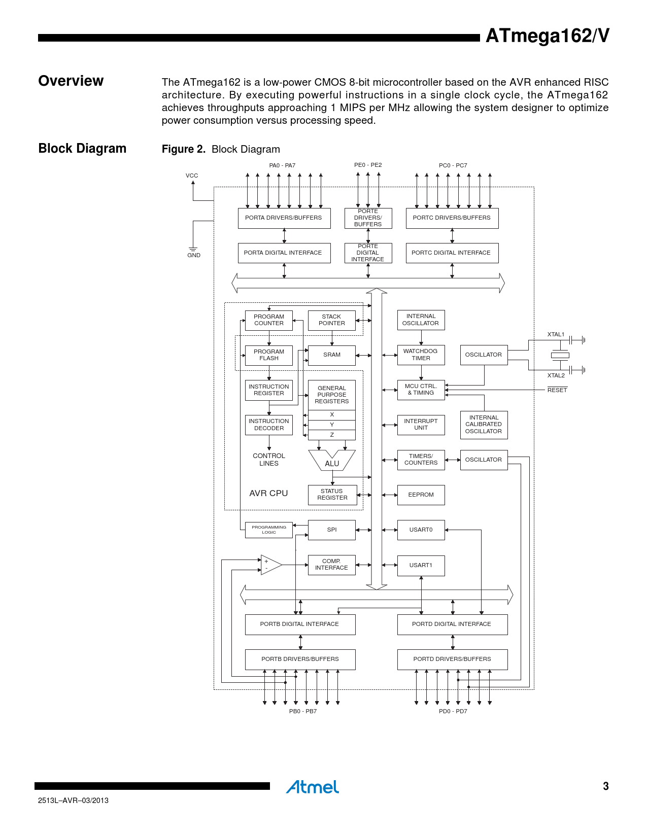 ATmega162/VOverview The ATmega162 is a low-power CMOS 8-bit microcontroller based on the AVR enhanced RISC architecture. By executing powerful instructions in a single clock cycle, the ATmega162 achieves throughputs approaching 1 MIPS per MHz allowing the system designer to optimize power consumption versus processing speed. Block DiagramFigure 2. Block Diagram PA0 - PA7 PE0 - PE2 PC0 - PC7 VCC PORTE PORTA DRIVERS/BUFFERS DRIVERS/ PORTC DRIVERS/BUFFERS BUFFERS PORTE PORTA DIGITAL INTERFACE DIGITAL PORTC DIGITAL INTERFACE GND INTERFACE PROGRAM STACK INTERNAL COUNTER POINTER OSCILLATOR XTAL1 PROGRAM WATCHDOG SRAM OSCILLATOR FLASH TIMER XTAL2 INSTRUCTION MCU CTRL. GENERAL RESET REGISTER & TIMING PURPOSE REGISTERS X INTERNAL INSTRUCTION INTERRUPT Y CALIBRATED DECODER UNIT OSCILLATOR Z CONTROL TIMERS/ OSCILLATOR LINES COUNTERS ALU STATUS AVR CPU EEPROM REGISTER PROGRAMMING SPI USART0 LOGIC + COMP. - INTERFACE USART1 PORTB DIGITAL INTERFACE PORTD DIGITAL INTERFACE PORTB DRIVERS/BUFFERS PORTD DRIVERS/BUFFERS PB0 - PB7 PD0 - PD7 3 2513L–AVR–03/2013 Document Outline Features Pin Configurations Disclaimer Overview Block Diagram ATmega161 and ATmega162 Compatibility ATmega161 Compatibility Mode Pin Descriptions VCC GND Port A (PA7..PA0) Port B (PB7..PB0) Port C (PC7..PC0) Port D (PD7..PD0) Port E(PE2..PE0) RESET XTAL1 XTAL2 Resources Data Retention About Code Examples AVR CPU Core Introduction Architectural Overview ALU – Arithmetic Logic Unit Status Register General Purpose Register File The X-register, Y- register, and Z-register Stack Pointer Instruction Execution Timing Reset and Interrupt Handling Interrupt Response Time AVR ATmega162 Memories In-System Reprogrammable Flash Program Memory SRAM Data Memory Data Memory Access Times EEPROM Data Memory EEPROM Read/Write Access The EEPROM Address Register – EEARH and EEARL The EEPROM Data Register – EEDR The EEPROM Control Register – EECR EEPROM Write During Power-down Sleep Mode Preventing EEPROM Corruption I/O Memory External Memory Interface Overview Using the External Memory Interface Address Latch Requirements Pull-up and Bus Keeper Timing XMEM Register Description MCU Control Register – MCUCR Extended MCU Control Register – EMCUCR Special Function IO Register – SFIOR Using all Locations of External Memory Smaller than 64 KB Using all 64KB Locations of External Memory System Clock and Clock Options Clock Systems and their Distribution CPU clock – clkCPU I/O clock – clkI/O Flash clock – clkFLASH Asynchronous Timer clock – clkASY Clock Sources Default Clock Source Crystal Oscillator Low-frequency Crystal Oscillator Calibrated Internal RC Oscillator Oscillator Calibration Register – OSCCAL External Clock Clock output buffer Timer/Counter Oscillator System Clock Prescaler Clock Prescale Register – CLKPR Power Management and Sleep Modes MCU Control Register – MCUCR MCU Control and Status Register – MCUCSR Extended MCU Control Register – EMCUCR Idle Mode Power-down Mode Power-save Mode Standby Mode Extended Standby Mode Minimizing Power Consumption Analog Comparator Brown-out Detector Internal Voltage Reference Watchdog Timer Port Pins JTAG Interface and On-chip Debug System System Control and Reset Resetting the AVR Reset Sources Power-on Reset External Reset Brown-out Detection Watchdog Reset MCU Control and Status Register – MCUCSR Internal Voltage Reference Voltage Reference Enable Signals and Start-up Time Watchdog Timer Watchdog Timer Control Register – WDTCR Timed Sequences for Changing the Configuration of the Watchdog Timer Safety Level 0 Safety Level 1 Safety Level 2 Interrupts Interrupt Vectors in ATmega162 Moving Interrupts Between Application and Boot Space General Interrupt Control Register – GICR I/O-Ports Introduction Ports as General Digital I/O Configuring the Pin Reading the Pin Value Digital Input Enable and Sleep Modes Unconnected pins Alternate Port Functions Special Function IO Register – SFIOR Alternate Functions of Port A Alternate Functions Of Port B Alternate Functions of Port C Alternate Functions of Port D Alternate Functions of Port E Register Description for I/O- Ports Port A Data Register – PORTA Port A Data Direction Register – DDRA Port A Input Pins Address – PINA Port B Data Register – PORTB Port B Data Direction Register – DDRB Port B Input Pins Address – PINB Port C Data Register – PORTC Port C Data Direction Register – DDRC Port C Input Pins Address – PINC Port D Data Register – PORTD Port D Data Direction Register – DDRD Port D Input Pins Address – PIND Port E Data Register – PORTE Port E Data Direction Register – DDRE Port E Input Pins Address – PINE External Interrupts MCU Control Register – MCUCR Extended MCU Control Register – EMCUCR General Interrupt Control Register – GICR General Interrupt Flag Register – GIFR Pin Change Mask Register 1 – PCMSK1 Pin Change Mask Register 0 – PCMSK0 8-bit Timer/Counter0 with PWM Overview Registers Definitions Timer/Counter Clock Sources Counter Unit Output Compare Unit Force Output Compare Compare Match Blocking by TCNT0 Write Using the Output Compare Unit Compare Match Output Unit Compare Output Mode and Waveform Generation Modes of Operation Normal Mode Clear Timer on Compare Match (CTC) Mode Fast PWM Mode Phase Correct PWM Mode Timer/Counter Timing Diagrams 8-bit Timer/Counter Register Description Timer/Counter Control Register – TCCR0 Timer/Counter Register – TCNT0 Output Compare Register – OCR0 Timer/Counter Interrupt Mask Register – TIMSK Timer/Counter Interrupt Flag Register – TIFR Timer/Counter0, Timer/Counter1, and Timer/Counter3 Prescalers Internal Clock Source Prescaler Reset External Clock Source Special Function IO Register – SFIOR 16-bit Timer/Counter (Timer/Counter1 and Timer/Counter3) Restriction in ATmega161 Compatibility Mode Overview Registers Definitions Compatibility Accessing 16-bit Registers Reusing the Temporary High Byte Register Timer/Counter Clock So