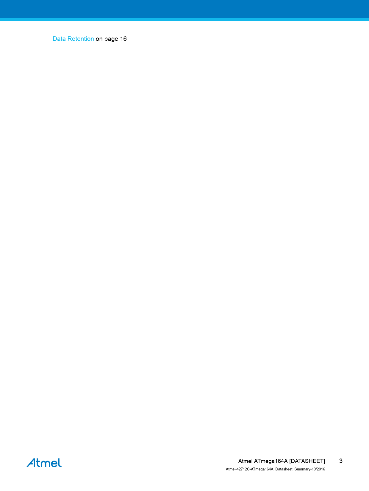 link. to. page. 16. Data. Retention. on. page. 16. Atmel. ATmega164A. [DATASHEET]. 3. Atmel-42712C-ATmega164A_Datasheet_Summary-10/2016. Document
