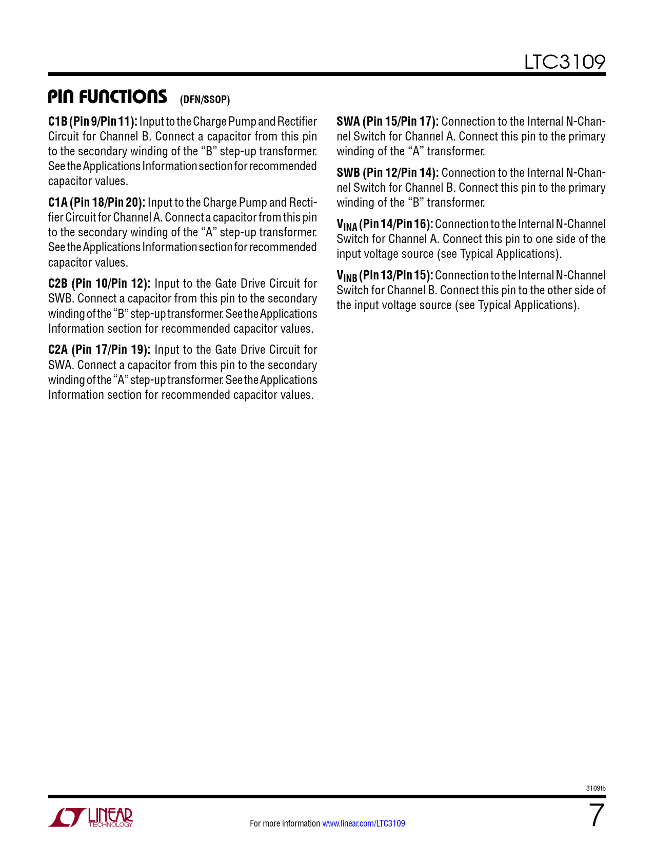 LTC3109 pin FuncTions (DFN/SSOP)C1B (Pin 9/Pin 11): Input to the Charge Pump and Rectifier SWA (Pin 15/Pin 17): Connection to the Internal N-Chan- Circuit for Channel B. Connect a capacitor from this pin nel Switch for Channel A. Connect this pin to the primary to the secondary winding of the “B” step-up transformer. winding of the “A” transformer. See the Applications Information section for recommended SWB (Pin 12/Pin 14): Connection to the Internal N-Chan- capacitor values. nel Switch for Channel B. Connect this pin to the primary C1A (Pin 18/Pin 20): Input to the Charge Pump and Recti- winding of the “B” transformer. fier Circuit for Channel A. Connect a capacitor from this pin V to the secondary winding of the “A” step-up transformer. INA (Pin 14/Pin 16): Connection to the Internal N-Channel Switch for Channel A. Connect this pin to one side of the See the Applications Information section for recommended input voltage source (see Typical Applications). capacitor values. VC2B (Pin 10/Pin 12): Input to the Gate Drive Circuit for INB (Pin 13/Pin 15): Connection to the Internal N-Channel Switch for Channel B. Connect this pin to the other side of SWB. Connect a capacitor from this pin to the secondary the input voltage source (see Typical Applications). winding of the “B” step-up transformer. See the Applications Information section for recommended capacitor values. C2A (Pin 17/Pin 19): Input to the Gate Drive Circuit for SWA. Connect a capacitor from this pin to the secondary winding of the “A” step-up transformer. See the Applications Information section for recommended capacitor values. 3109fb For more information www.linear.com/LTC3109 7 Document Outline Features Applications Description Typical Application Absolute Maximum Ratings Pin Configuration Order Information Electrical Characteristics Typical Performance Characteristics Pin Functions Block Diagram Operation Applications Information Package Description Typical Application Related Parts