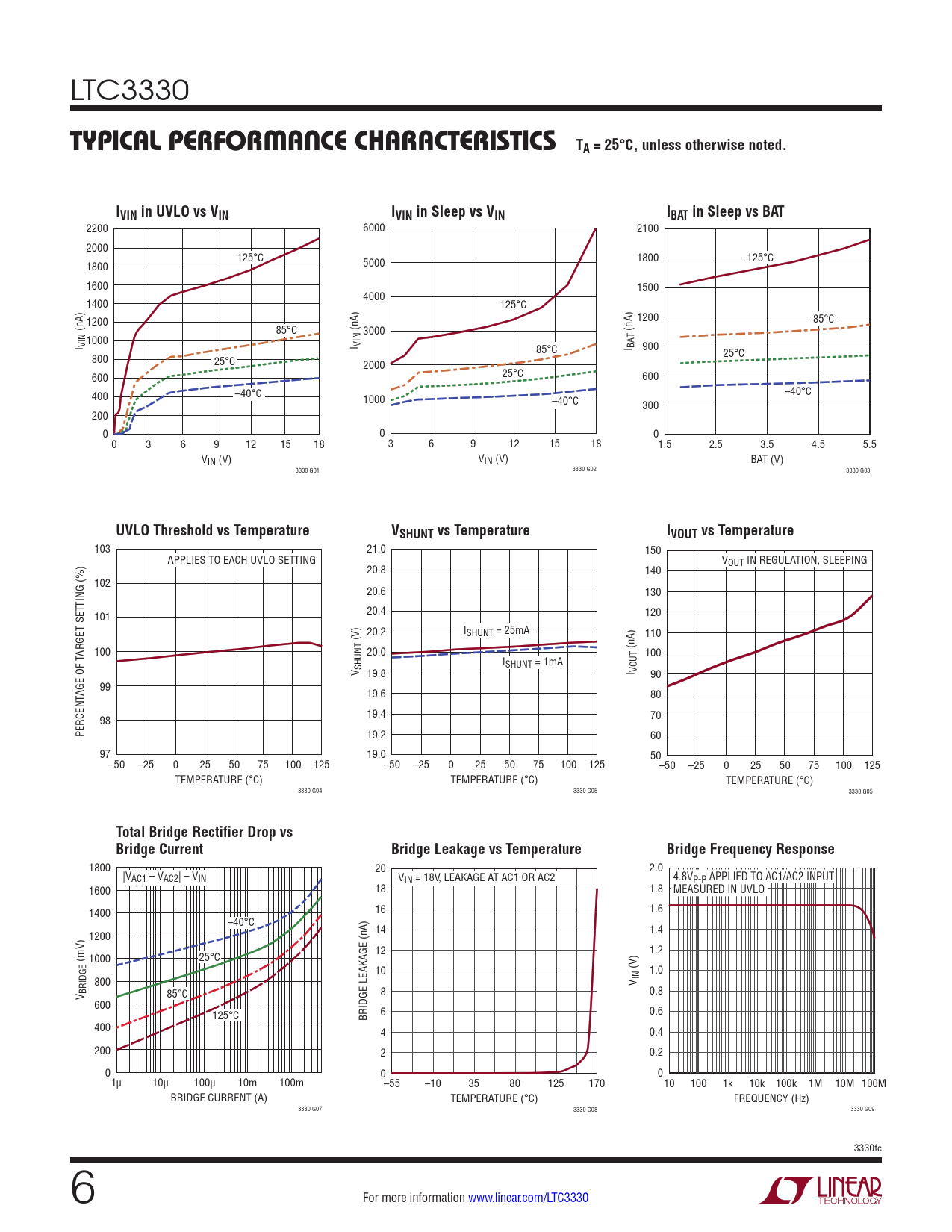 2200 6000 2100 2000 125°C 1800 125°C 1800 5000 1600 1500 4000 1400 125°C 1200 1200 85°C (nA) 85°C (nA) 3000 (nA) I VIN1000 I VIN 85°C I BAT 900 800 25°C 25°C 2000 600 25°C 600 400 –40°C –40°C 1000 –40°C 300 200 0 0 0 0 3 6 9 12 15 18 3 6 9 12 15 18 1.5 2.5 3.5 4.5 5.5 VIN (V) VIN (V) BAT (V) 3330 G01 3330 G02 3330 G03