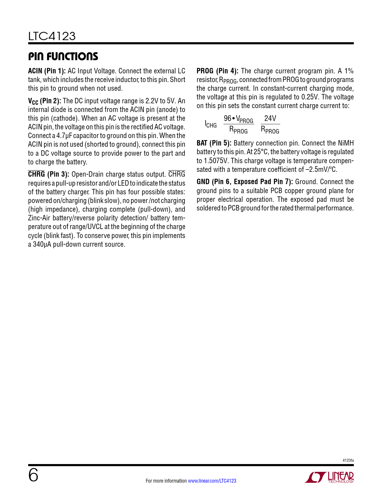 pin FuncTions ACIN (Pin 1):. PROG (Pin 4):. CC (Pin 2):. BAT (Pin 5):. CHRG (Pin 3):. GND (Pin 6, Exposed Pad Pin 7):