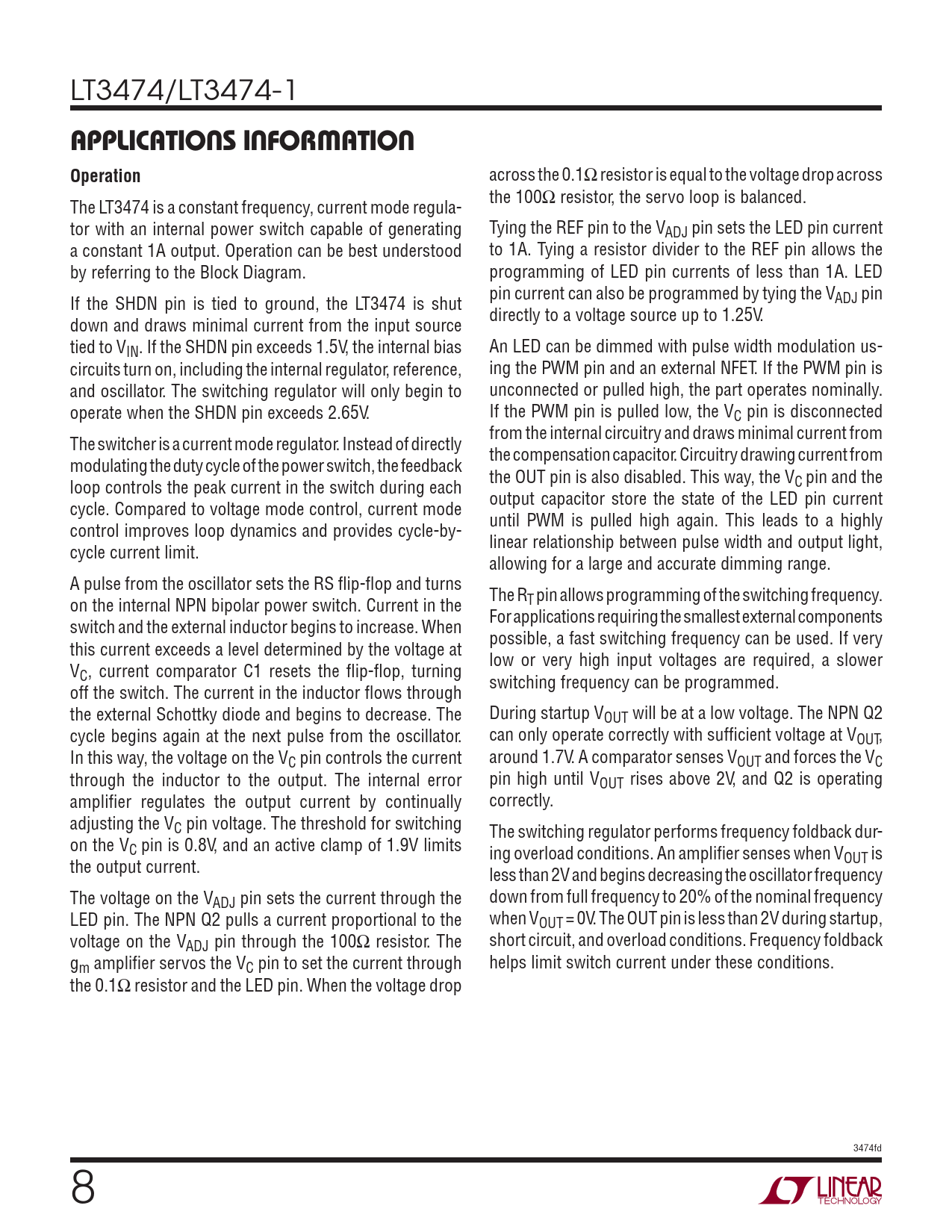 LT3474/LT3474-1 APPLICATIONS INFORMATIONOperation across the 0.1Ω resistor is equal to the voltage drop across the 100Ω resistor, the servo loop is balanced. The LT3474 is a constant frequency, current mode regula- tor with an internal power switch capable of generating Tying the REF pin to the VADJ pin sets the LED pin current a constant 1A output. Operation can be best understood to 1A. Tying a resistor divider to the REF pin allows the by referring to the Block Diagram. programming of LED pin currents of less than 1A. LED pin current can also be programmed by tying the V If the SHDN pin is tied to ground, the LT3474 is shut ADJ pin directly to a voltage source up to 1.25V. down and draws minimal current from the input source tied to VIN. If the SHDN pin exceeds 1.5V, the internal bias An LED can be dimmed with pulse width modulation us- circuits turn on, including the internal regulator, reference, ing the PWM pin and an external NFET. If the PWM pin is and oscillator. The switching regulator will only begin to unconnected or pulled high, the part operates nominally. operate when the SHDN pin exceeds 2.65V. If the PWM pin is pulled low, the VC pin is disconnected from the internal circuitry and draws minimal current from The switcher is a current mode regulator. Instead of directly the compensation capacitor. Circuitry drawing current from modulating the duty cycle of the power switch, the feedback the OUT pin is also disabled. This way, the V loop controls the peak current in the switch during each C pin and the output capacitor store the state of the LED pin current cycle. Compared to voltage mode control, current mode until PWM is pulled high again. This leads to a highly control improves loop dynamics and provides cycle-by- linear relationship between pulse width and output light, cycle current limit. allowing for a large and accurate dimming range. A pulse from the oscillator sets the RS fl ip-fl op and turns The R on the internal NPN bipolar power switch. Current in the T pin allows programming of the switching frequency. For applications requiring the smallest external components switch and the external inductor begins to increase. When possible, a fast switching frequency can be used. If very this current exceeds a level determined by the voltage at low or very high input voltages are required, a slower VC, current comparator C1 resets the fl ip-fl op, turning switching frequency can be programmed. off the switch. The current in the inductor fl ows through the external Schottky diode and begins to decrease. The During startup VOUT will be at a low voltage. The NPN Q2 cycle begins again at the next pulse from the oscillator. can only operate correctly with suffi cient voltage at VOUT, In this way, the voltage on the VC pin controls the current around 1.7V. A comparator senses VOUT and forces the VC through the inductor to the output. The internal error pin high until VOUT rises above 2V, and Q2 is operating amplifi er regulates the output current by continually correctly. adjusting the VC pin voltage. The threshold for switching The switching regulator performs frequency foldback dur- on the VC pin is 0.8V, and an active clamp of 1.9V limits ing overload conditions. An amplifi er senses when VOUT is the output current. less than 2V and begins decreasing the oscillator frequency The voltage on the VADJ pin sets the current through the down from full frequency to 20% of the nominal frequency LED pin. The NPN Q2 pulls a current proportional to the when VOUT = 0V. The OUT pin is less than 2V during startup, voltage on the VADJ pin through the 100Ω resistor. The short circuit, and overload conditions. Frequency foldback gm amplifi er servos the VC pin to set the current through helps limit switch current under these conditions. the 0.1Ω resistor and the LED pin. When the voltage drop 3474fd 8