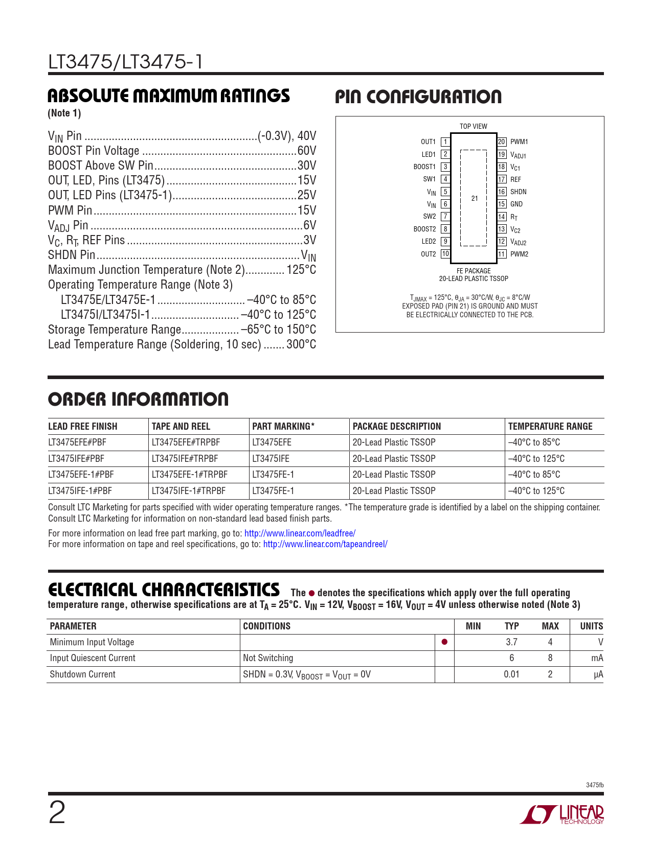 LT3475/LT3475-1 WWWUABSOLUTE AXI URATI GSPIN CONFIGURATION(Note 1) TOP VIEW VIN Pin ...(-0.3V), 40V OUT1 1 20 PWM1 BOOST Pin Voltage ...60V LED1 2 19 VADJ1 BOOST Above SW Pin ...30V BOOST1 3 18 VC1 OUT, LED, Pins (LT3475) ...15V SW1 4 17 REF OUT, LED Pins (LT3475-1) ...25V V 5 16 IN SHDN 21 V 6 15 GND PWM Pin ...15V IN SW2 7 14 RT VADJ Pin ..6V BOOST2 8 13 VC2 VC, RT, REF Pins ..3V LED2 9 12 VADJ2 SHDN Pin ...VIN OUT2 10 11 PWM2 Maximum Junction Temperature (Note 2)... 125°C FE PACKAGE 20-LEAD PLASTIC TSSOP Operating Temperature Range (Note 3) LT3475E/LT3475E-1 ... –40°C to 85°C TJMAX = 125°C, θJA = 30°C/W, θJC = 8°C/W EXPOSED PAD (PIN 21) IS GROUND AND MUST LT3475I/LT3475I-1 ... –40°C to 125°C BE ELECTRICALLY CONNECTED TO THE PCB. Storage Temperature Range ... –65°C to 150°C Lead Temperature Range (Soldering, 10 sec) ... 300°C ORDER INFORMATIONLEAD FREE FINISHTAPE AND REELPART MARKING*PACKAGE DESCRIPTIONTEMPERATURE RANGE LT3475EFE#PBF LT3475EFE#TRPBF LT3475EFE 20-Lead Plastic TSSOP –40°C to 85°C LT3475IFE#PBF LT3475IFE#TRPBF LT3475IFE 20-Lead Plastic TSSOP –40°C to 125°C LT3475EFE-1#PBF LT3475EFE-1#TRPBF LT3475FE-1 20-Lead Plastic TSSOP –40°C to 85°C LT3475IFE-1#PBF LT3475IFE-1#TRPBF LT3475FE-1 20-Lead Plastic TSSOP –40°C to 125°C Consult LTC Marketing for parts specifi ed with wider operating temperature ranges. *The temperature grade is identifi ed by a label on the shipping container. Consult LTC Marketing for information on non-standard lead based fi nish parts. For more information on lead free part marking, go to: http://www.linear.com/leadfree/ For more information on tape and reel specifi cations, go to: http://www.linear.com/tapeandreel/ TheELECTRICAL CHARACTERISTICS ● denotes the specifi cations which apply over the full operatingtemperature range, otherwise specifi cations are at TA = 25°C. VIN = 12V, VBOOST = 16V, VOUT = 4V unless otherwise noted (Note 3)PARAMETERCONDITIONSMINTYPMAXUNITS Minimum Input Voltage ● 3.7 4 V Input Quiescent Current Not Switching 6 8 mA Shutdown Current SHDN = 0.3V, VBOOST = VOUT = 0V 0.01 2 μA 3475fb 2