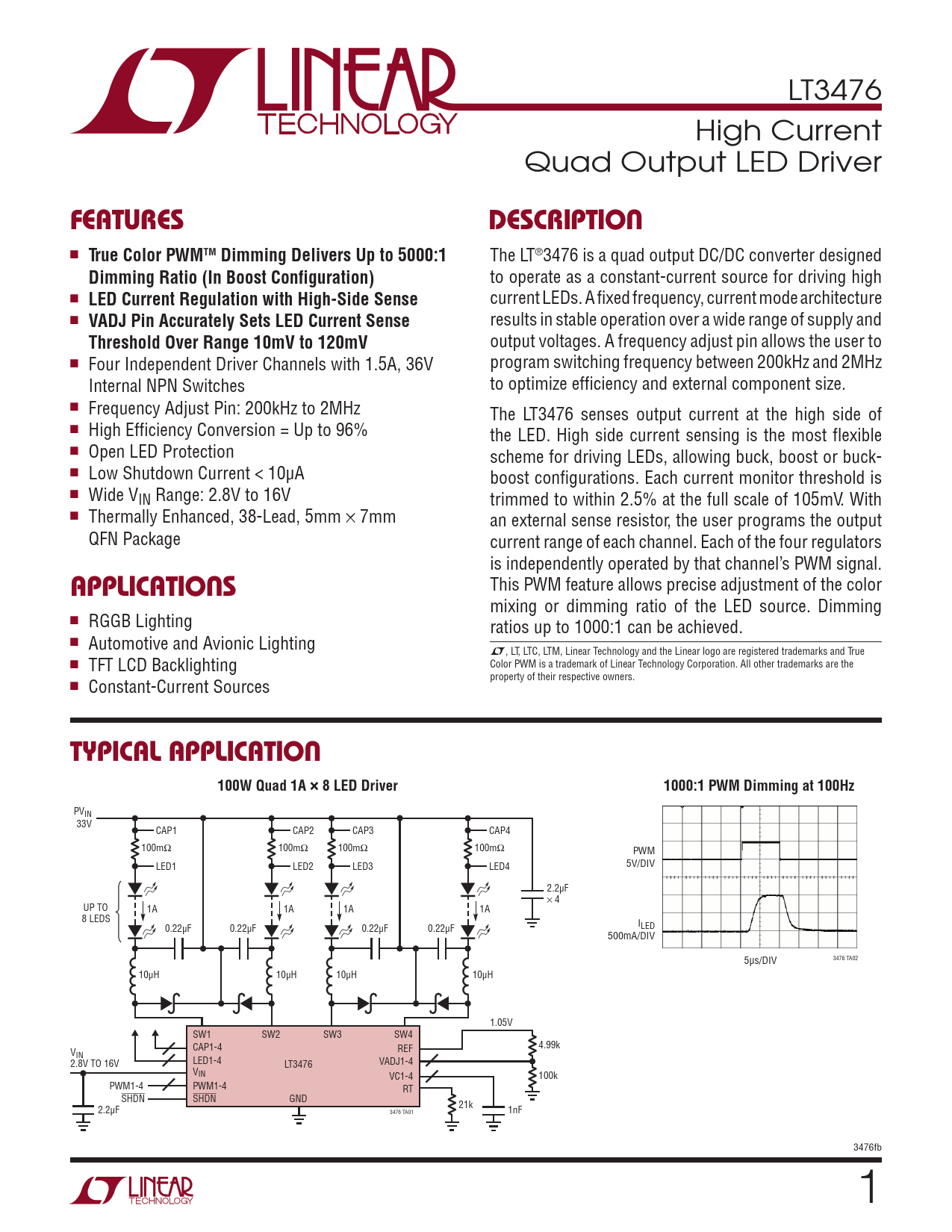 LT3476 High Current Quad Output LED Driver FeAturesDescription n True Color PWMTM Dimming Delivers Up to 5000:1 The LT®3476 is a quad output DC/DC converter designed Dimming Ratio (In Boost Configuration) to operate as a constant-current source for driving high n LED Current Regulation with High-Side Sense current LEDs. A fixed frequency, current mode architecture n VADJ Pin Accurately Sets LED Current Sense results in stable operation over a wide range of supply and Threshold Over Range 10mV to 120mV output voltages. A frequency adjust pin allows the user to n Four Independent Driver Channels with 1.5A, 36V program switching frequency between 200kHz and 2MHz Internal NPN Switches to optimize efficiency and external component size. n Frequency Adjust Pin: 200kHz to 2MHz The LT3476 senses output current at the high side of n High Efficiency Conversion = Up to 96% the LED. High side current sensing is the most flexible n Open LED Protection scheme for driving LEDs, allowing buck, boost or buck- n Low Shutdown Current < 10µA boost configurations. Each current monitor threshold is n Wide VIN Range: 2.8V to 16V trimmed to within 2.5% at the full scale of 105mV. With n Thermally Enhanced, 38-Lead, 5mm × 7mm an external sense resistor, the user programs the output QFN Package current range of each channel. Each of the four regulators is independently operated by that channel’s PWM signal. ApplicAtions This PWM feature allows precise adjustment of the color mixing or dimming ratio of the LED source. Dimming n RGGB Lighting ratios up to 1000:1 can be achieved. n Automotive and Avionic Lighting L, LT, LTC, LTM, Linear Technology and the Linear logo are registered trademarks and True n TFT LCD Backlighting Color PWM is a trademark of Linear Technology Corporation. All other trademarks are the property of their respective owners. n Constant-Current Sources typicAl ApplicAtion100W Quad 1A × 8 LED Driver1000:1 PWM Dimming at 100Hz PVIN 33V CAP1 CAP2 CAP3 CAP4 100mΩ 100mΩ 100mΩ 100mΩ PWM LED1 LED2 LED3 LED4 5V/DIV 2.2µF × 4 UP TO 1A 1A 1A 1A 8 LEDS 0.22µF 0.22µF 0.22µF 0.22µF ILED 500mA/DIV 5µs/DIV 3476 TA02 10µH 10µH 10µH 10µH 1.05V SW1 SW2 SW3 SW4 CAP1-4 REF 4.99k VIN LED1-4 2.8V TO 16V LT3476 VADJ1-4 VIN VC1-4 100k PWM1-4 PWM1-4 RT SHDN SHDN GND 2.2µF 21k 3476 TA01 1nF 3476fb 1 Document Outline Features Applications Description Typical Application Absolute Maximum Ratings Pin Configuration Order Information Electrical Characteristics Typical Performance Characteristics Pin Functions Block Diagram Operation Applications Information Typical Applications Package Description Revision History Typical Application Related Parts