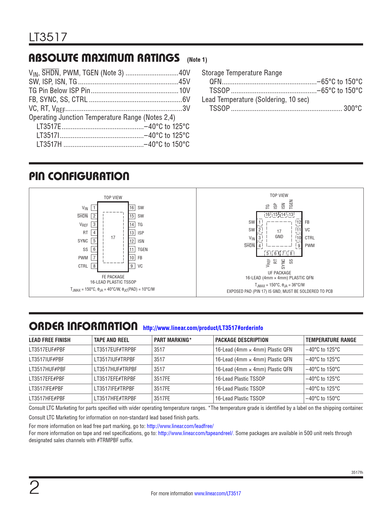 absolute MaxiMuM ratings (Note 1). pin conFiguration. orDer inForMation http://www.linear.com/product/LT3517#orderinfo