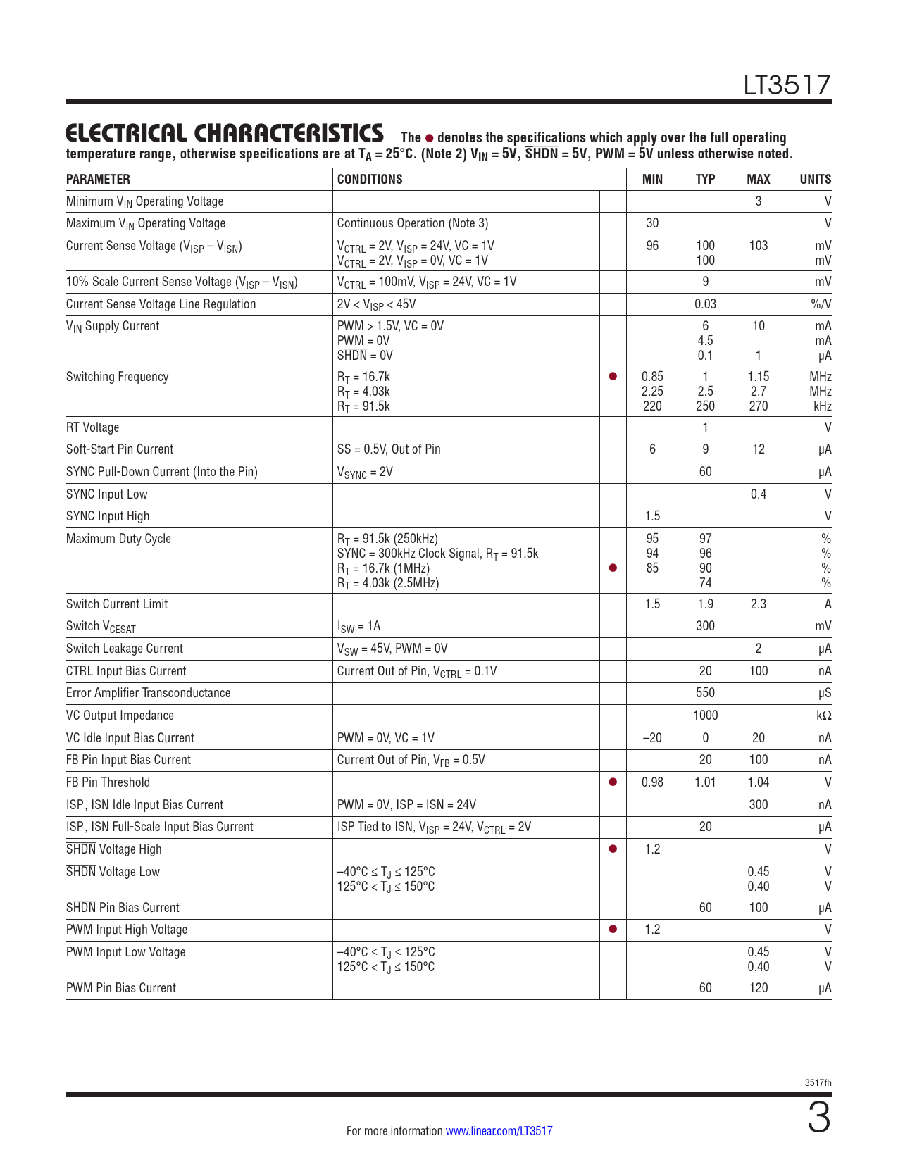 Minimum VIN Operating Voltage 3 V Maximum VIN Operating Voltage Continuous Operation (Note 3) 30 V Current Sense Voltage (VISP – VISN) VCTRL = 2V, VISP = 24V, VC = 1V ● 96 100 103 mV VCTRL = 2V, VISP = 0V, VC = 1V 100 mV 10% Scale Current Sense Voltage (VISP – VISN) VCTRL = 100mV, VISP = 24V, VC = 1V 9 mV Current Sense Voltage Line Regulation 2V < VISP < 45V 0.03 %/V VIN Supply Current PWM > 1.5V, VC = 0V 6 10 mA PWM = 0V 4.5 mA SHDN = 0V 0.1 1 µA Switching Frequency RT = 16.7k l 0.85 1 1.15 MHz RT = 4.03k 2.25 2.5 2.7 MHz RT = 91.5k 220 250 270 kHz RT Voltage 1 V Soft-Start Pin Current SS = 0.5V, Out of Pin 6 9 12 µA SYNC Pull-Down Current (Into the Pin) VSYNC = 2V 60 µA SYNC Input Low 0.4 V SYNC Input High 1.5 V Maximum Duty Cycle RT = 91.5k (250kHz) 95 97 % SYNC = 300kHz Clock Signal, RT = 91.5k 94 96 % RT = 16.7k (1MHz) l 85 90 % RT = 4.03k (2.5MHz) 74 % Switch Current Limit 1.5 1.9 2.3 A Switch VCESAT ISW = 1A 300 mV Switch Leakage Current VSW = 45V, PWM = 0V 2 µA CTRL Input Bias Current Current Out of Pin, VCTRL = 0.1V 20 100 nA Error Amplifier Transconductance 550 µS VC Output Impedance 1000 kΩ VC Idle Input Bias Current PWM = 0V, VC = 1V –20 0 20 nA FB Pin Input Bias Current Current Out of Pin, VFB = 0.5V 20 100 nA FB Pin Threshold l 0.98 1.01 1.04 V ISP , ISN Idle Input Bias Current PWM = 0V, ISP = ISN = 24V 300 nA ISP , ISN Full-Scale Input Bias Current ISP Tied to ISN, VISP = 24V, VCTRL = 2V 20 µA SHDN Voltage High l 1.2 V SHDN Voltage Low –40°C ≤ TJ ≤ 125°C 0.45 V 125°C < TJ ≤ 150°C 0.40 V SHDN Pin Bias Current 60 100 µA PWM Input High Voltage l 1.2 V PWM Input Low Voltage –40°C ≤ TJ ≤ 125°C 0.45 V 125°C < TJ ≤ 150°C 0.40 V PWM Pin Bias Current 60 120 µA 3517fh For more information www.linear.com/LT3517 3 Document Outline Features Applications Typical Application Description Absolute Maximum Ratings Pin Configuration Order Information Electrical Characteristics Typical Performance Characteristics Pin Functions Block Diagram Operation Applications Information Typical Applications Package Description Revision History Related Parts