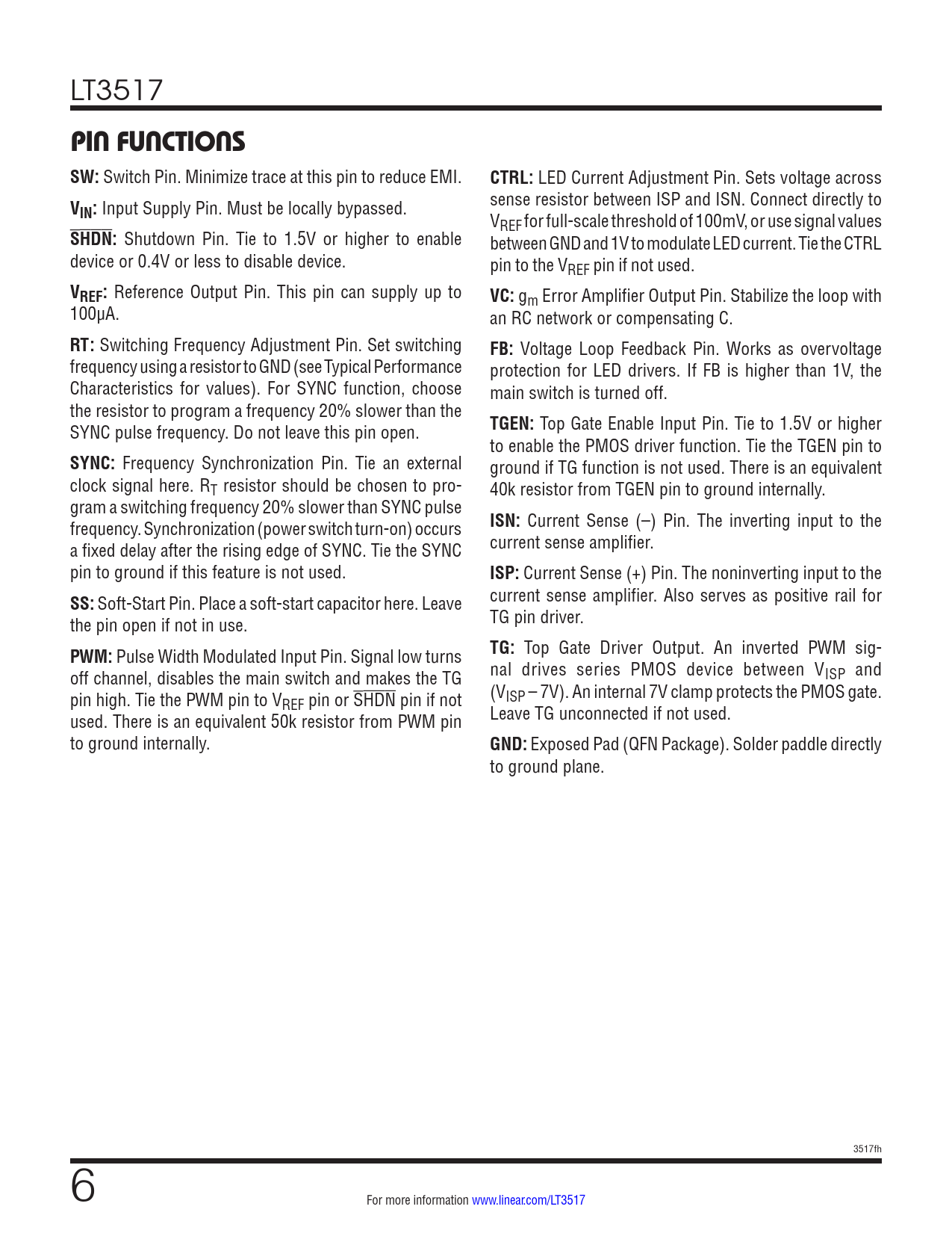 Exposed Pad (QFN Package). Solder paddle directly to ground plane. 3517fh 6 For more information www.linear.com/LT3517 Document Outline Features Applications Typical Application Description Absolute Maximum Ratings Pin Configuration Order Information Electrical Characteristics Typical Performance Characteristics Pin Functions Block Diagram Operation Applications Information Typical Applications Package Description Revision History Related Parts